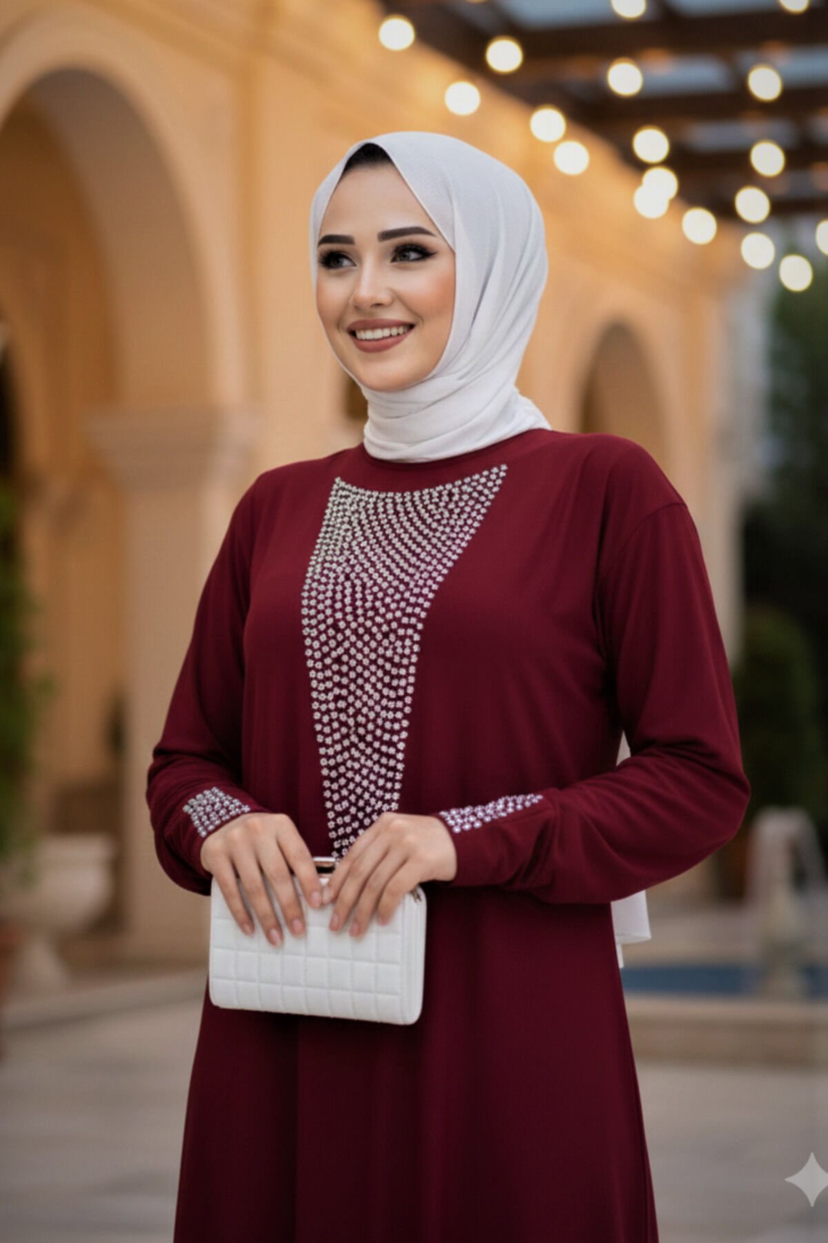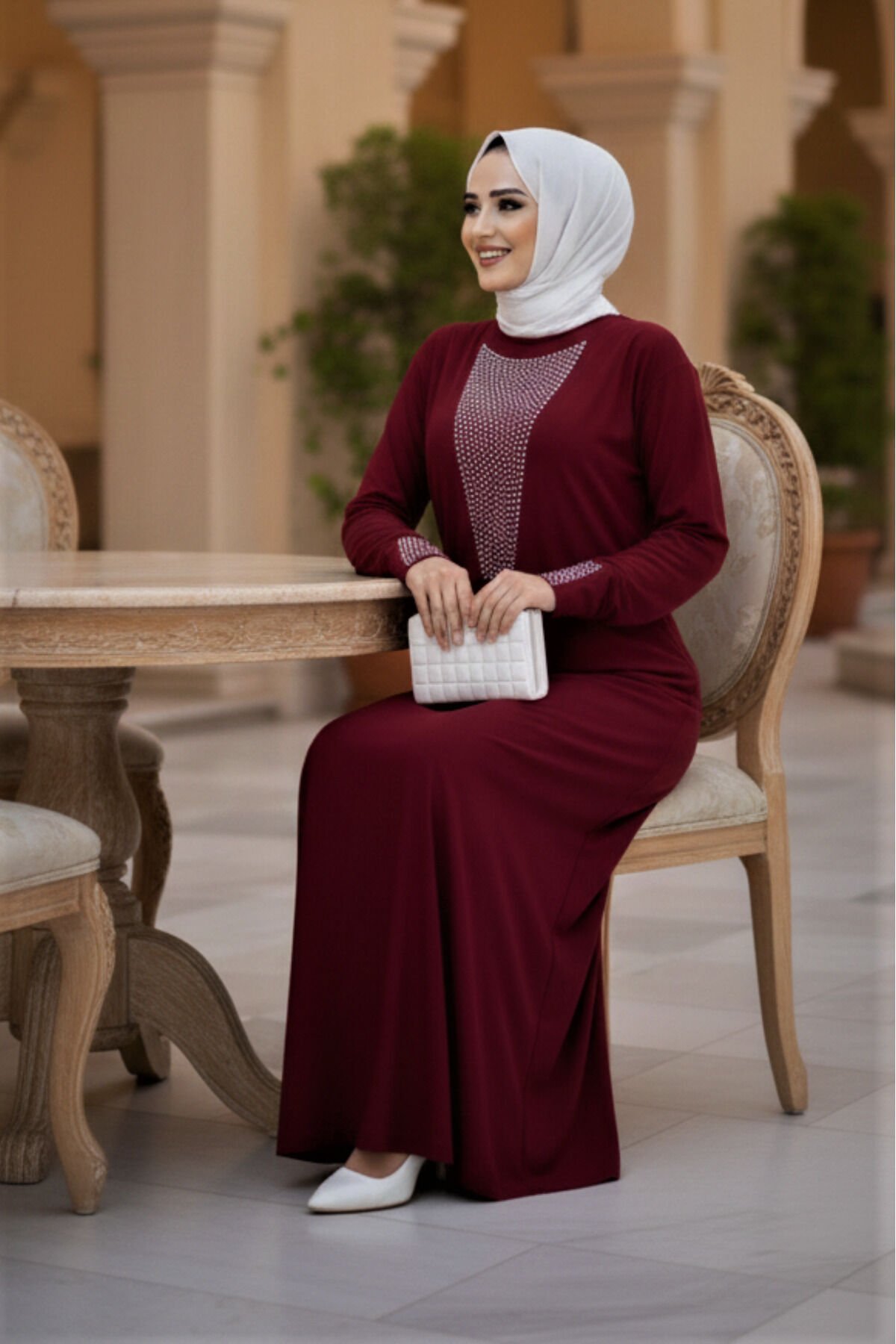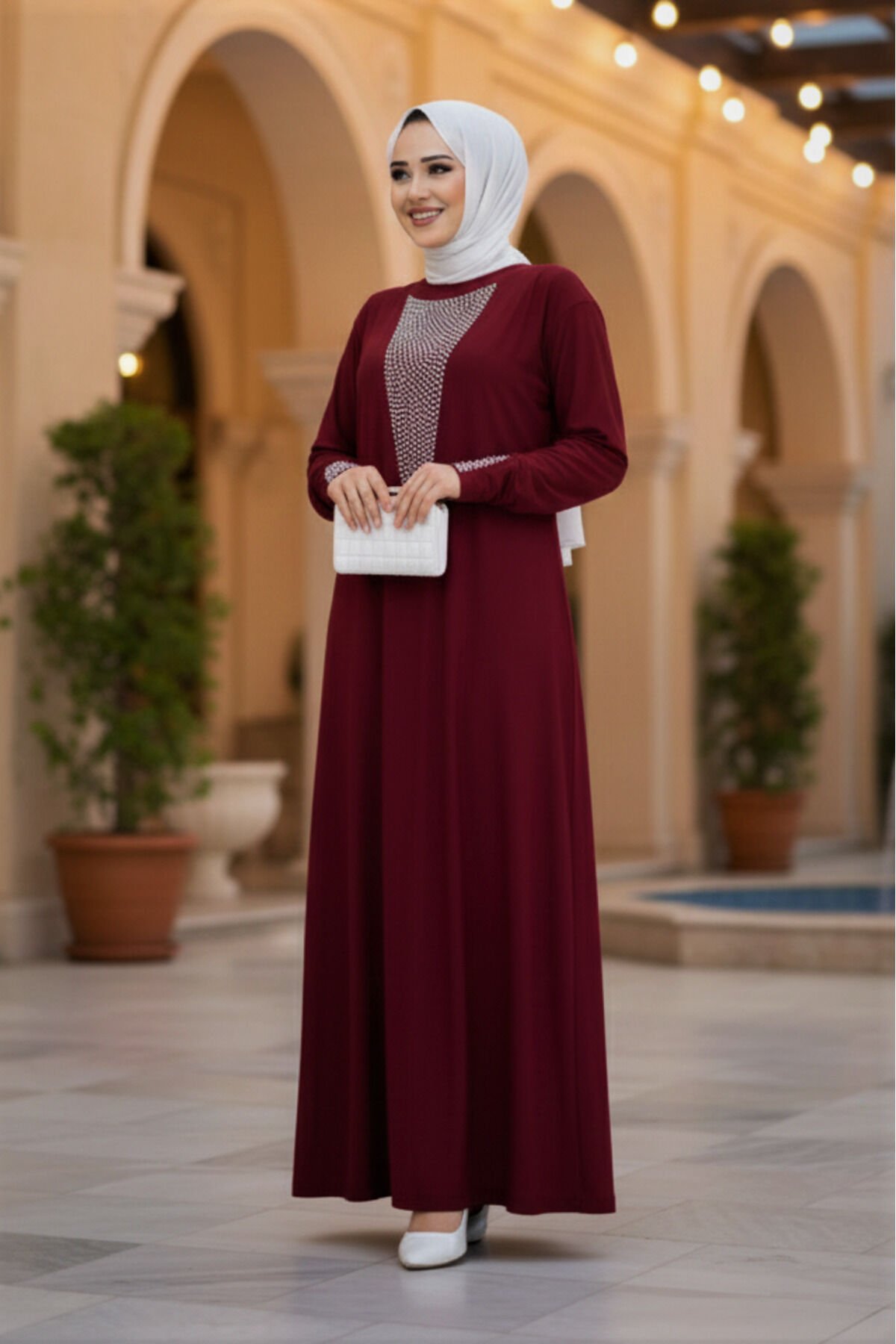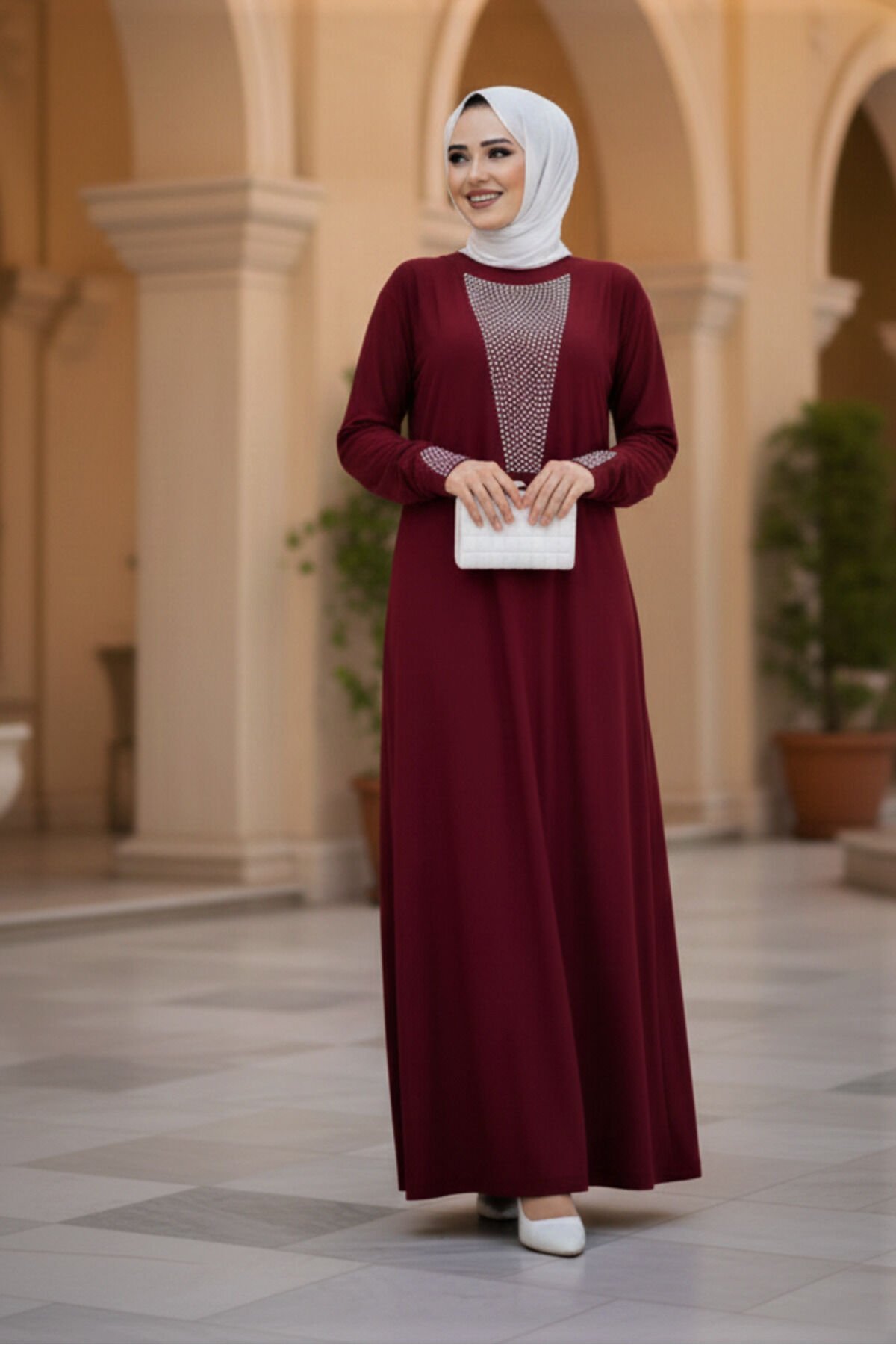 Kadın Vişne Sandy Önü Ve Kol Manşetleri Taşlı Boydan Genç Anne Tesettür Elbise Bordo - 42