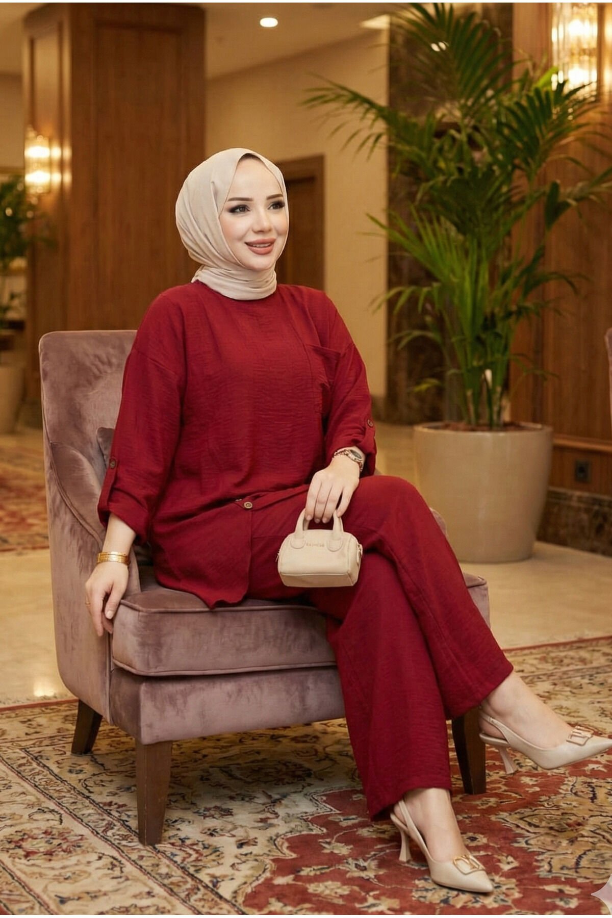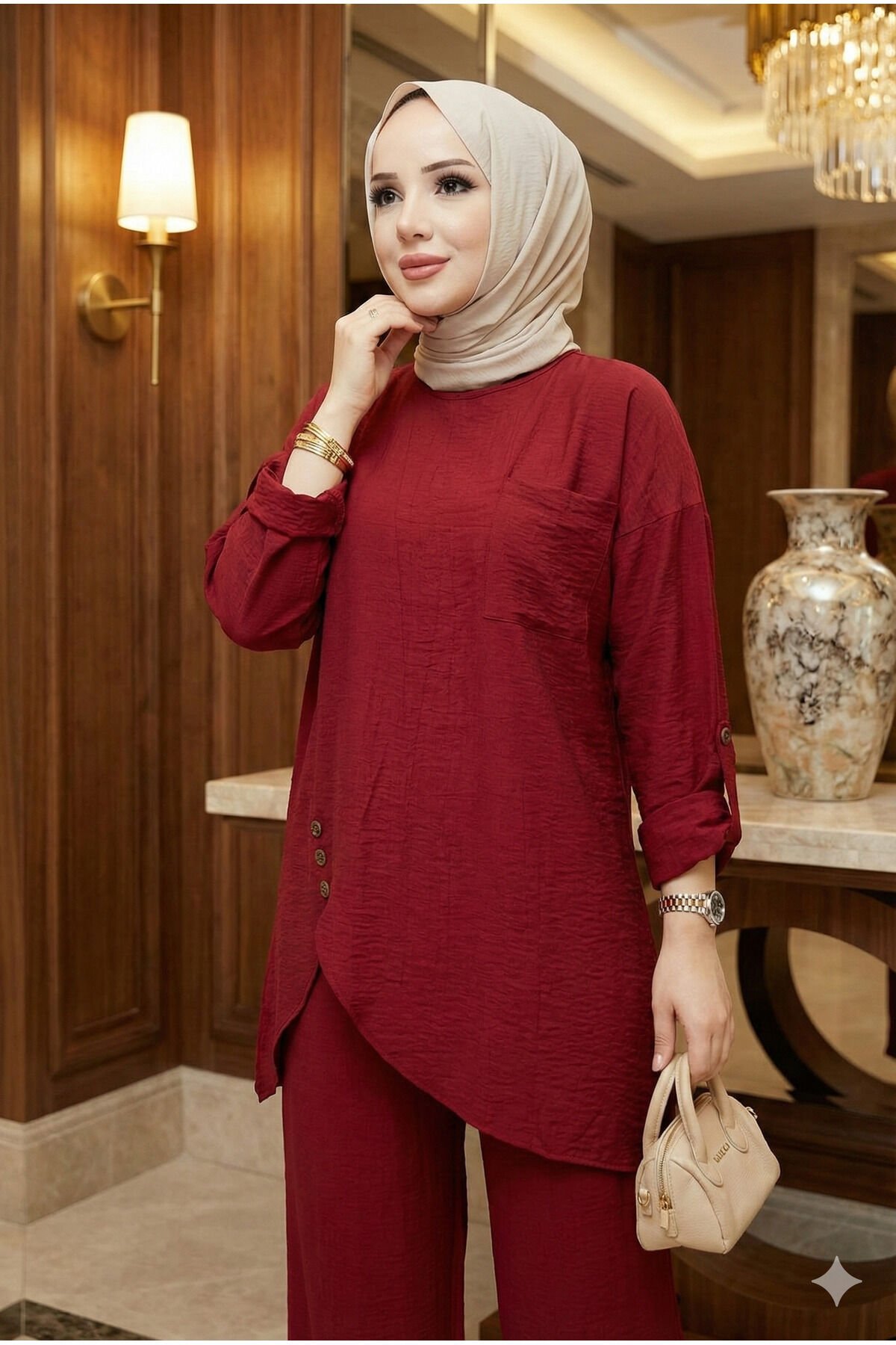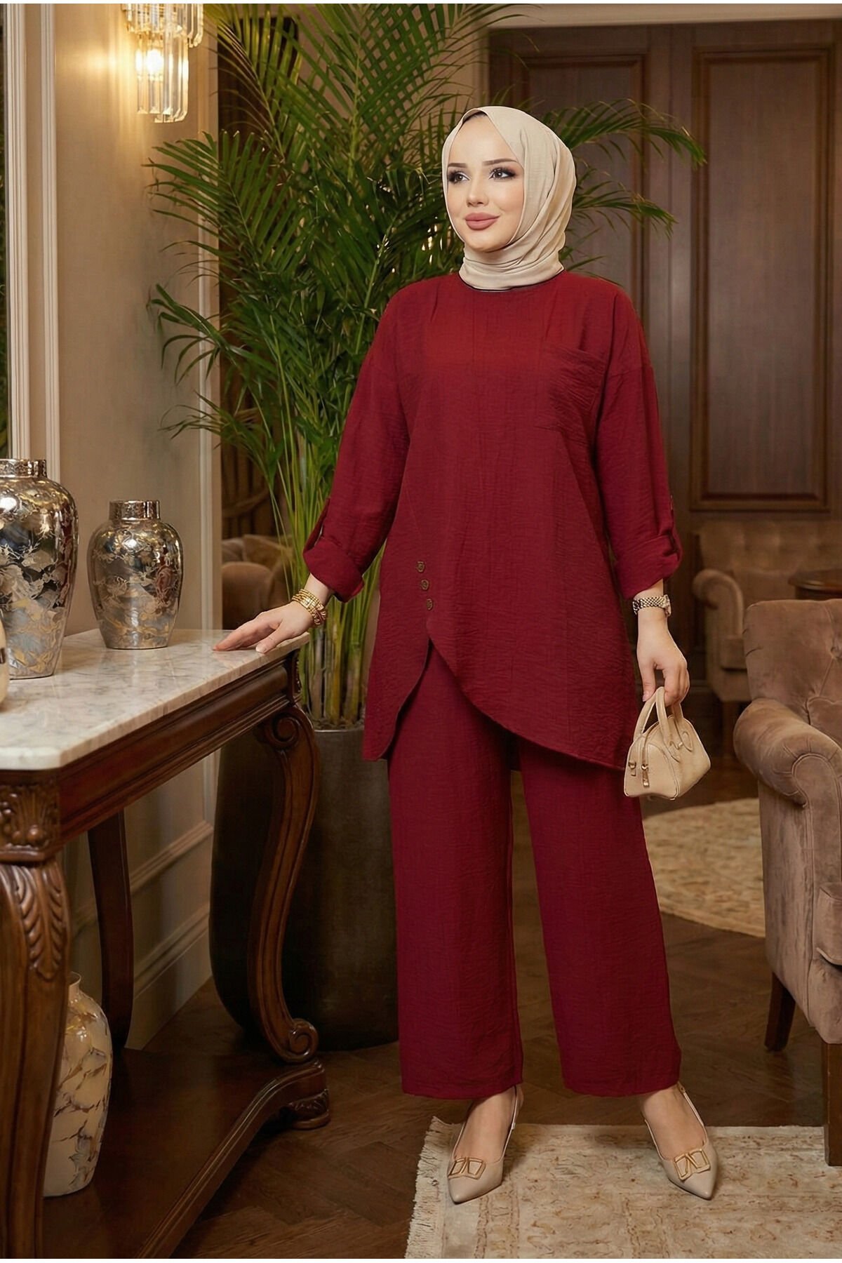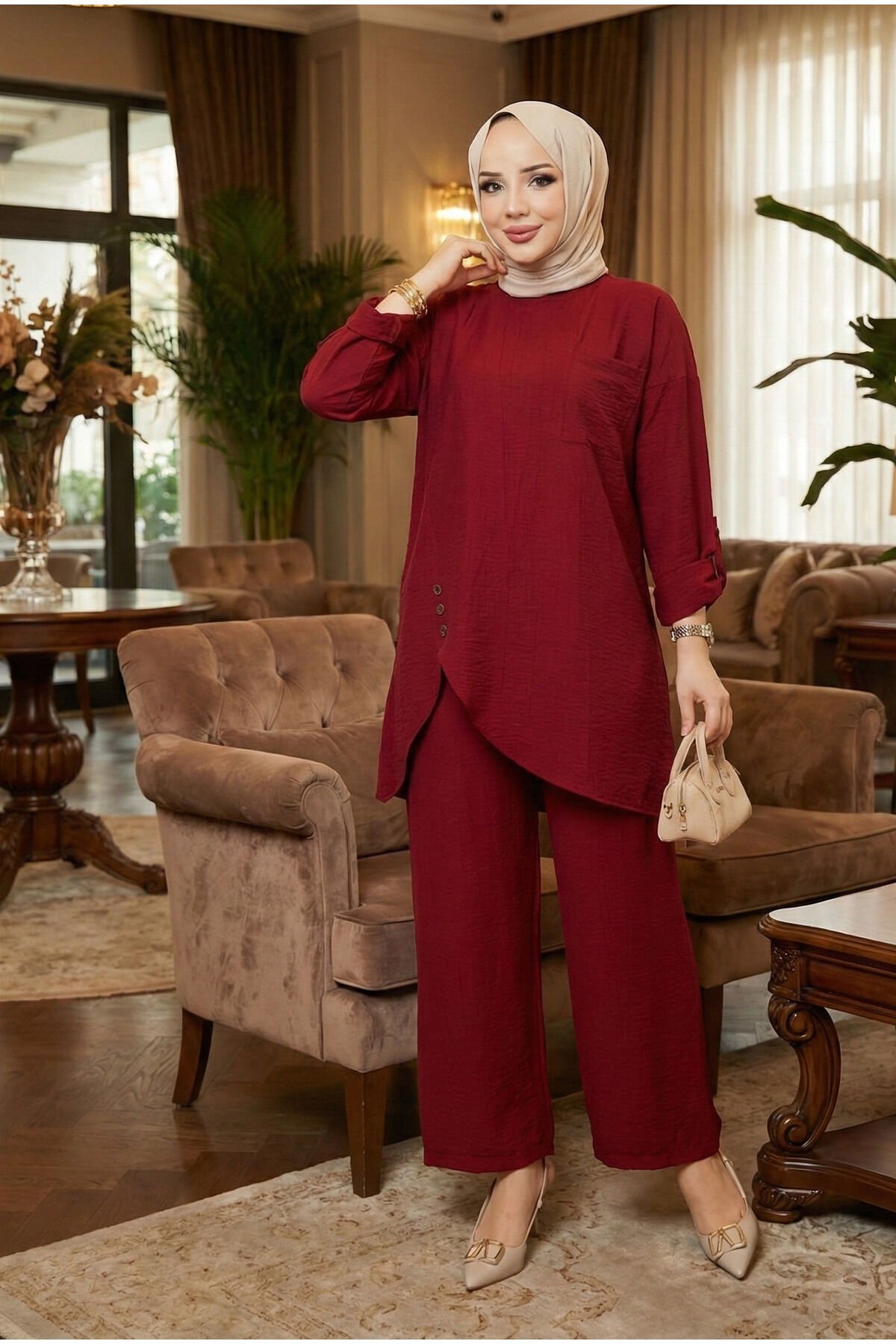 Kadın Çağla Yeşil Çilek Kumaş Asimetrik 2li Tesettür Tunik Pantolon Ikili Pantolonlu Takım Bordo - 48