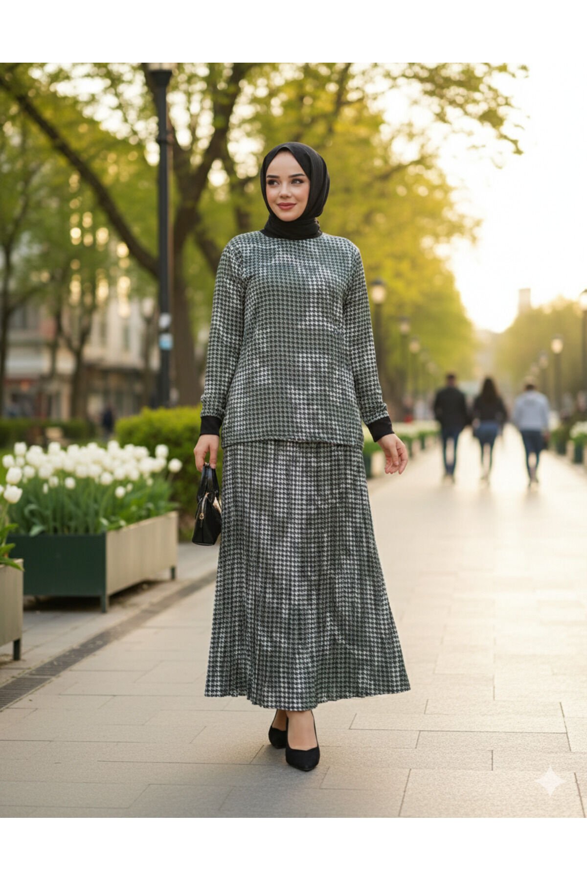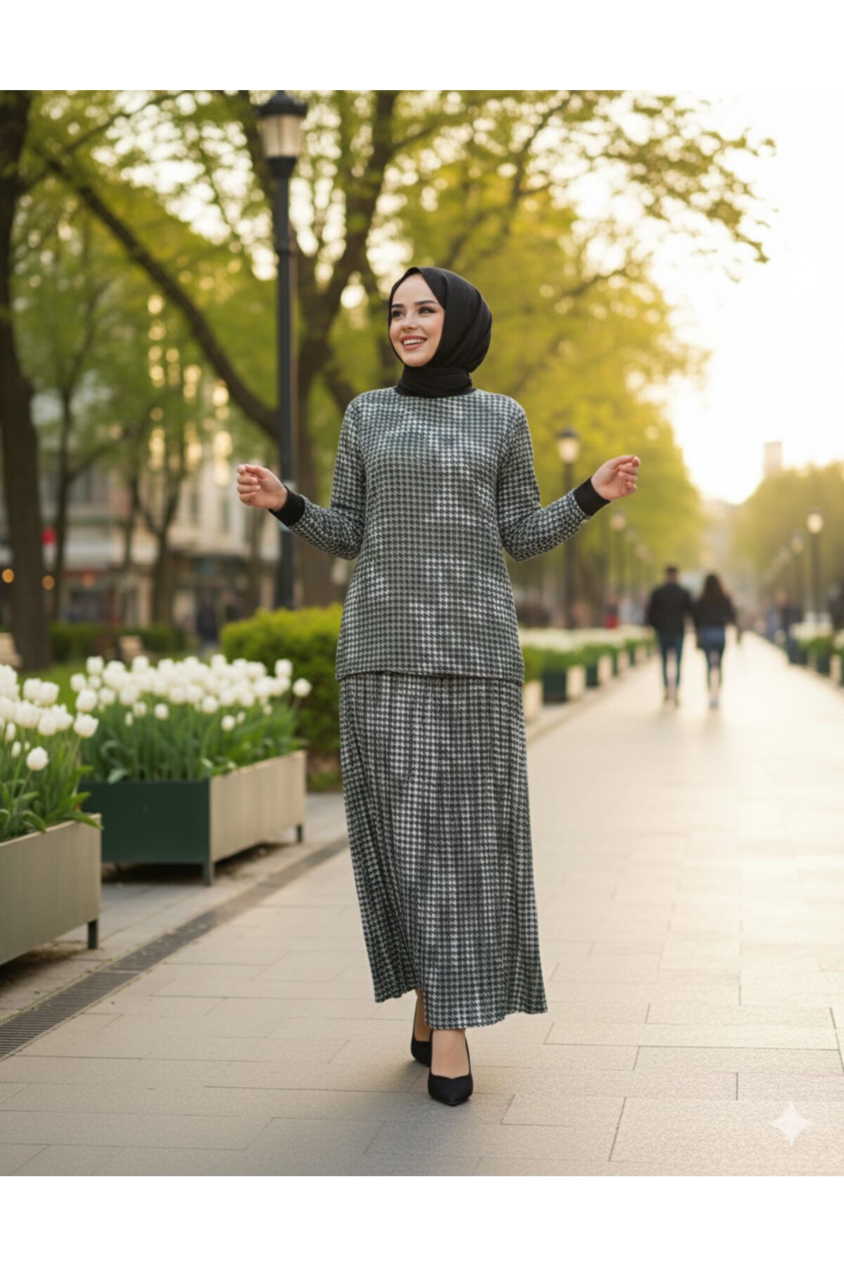 - Zarif desenleriyle dikkat çeken füme renkteki bluz, tesettür giyimin modern çizgisini yansıtır.; - Uzun boy kesimi ile rahat hareket etme özgürlüğü sunar ve şıklığı konforla buluşturur.; - Büyük beden kalıbıyla her vücut tipine uyum sağlayarak geniş bir kullanıcı kitlesine hitap eder.; - Saten dokusu sayesinde pürüzsüz bir yüzey sunarken, yumuşak yapısıyla teninize nazikçe dokunur.; - İki parçadan oluşan takım, hem günlük kullanım hem de özel günler için idealdir; pratikliği ve şıklığı bir arada yaşamanızı sağlar.; - Yüksek bel tasarımı ile zarif bir siluet oluştururken, kemer ihtiyacını ortadan kaldırarak minimalist bir görünüm sunar.; - Cepsiz yapısıyla sade ve zamansız bir tarza sahip olmanızı sağlarken, astarsız oluşu hafiflik hissi verir.; - Viskon karışımlı materyali sayesinde nefes alabilir yapıda olan bu takım, yaz ayları için mükemmel bir seçimdir.; - 30 derecede yıkama imkanına sahip olması bakım kolaylığını arttırırken, uzun süreli kullanım için dayanıklılığı garanti eder.; - Standart kol tipiyle mevsimsel değişimlere karşı esneklik gösterir; gündüzden geceye kolayca geçiş yapabilmenizi sağlar.; - Gündüzden geceye her ortamda rahatlıkla tercih edebileceğiniz bu ikili set, stilinizi tamamlamanız için idealdir.; - Cep detayları fonksiyonellik kazandırarak küçük eşyalarınız için pratik saklama alanları sunar.; - Bisiklet yakası sayesinde modern ve sade bir görünüm elde edilirken aynı zamanda boynunuza nazikçe sarılır.; - Saten materyalin parlak bitişini koruyarak estetik zevkinizi ön plana çıkartır.- Uzun kollu, rahat kesimiyle günlük kullanım için ideal olan bu takım, yaz aylarında serin tutan viskon karışımlı kumaşıyla konfor sunar.; - Yüksek bel tasarımı sayesinde vücut hatlarını zarifçe sararak feminen bir siluet oluşturur.; - Saten dokusu ile şıklığı ve yumuşaklığı bir arada barındırırken, 30 derecede kolayca yıkanabilme özelliği pratik bakım imkanı sağlar.; - Cepsiz yapısıyla minimalist bir görünüm sunarken, bisiklet yakası modern ve sade bir stil ifade eder.; - Paçasız paça detayı ile hem şık hem de rahat hareket etme olanağı tanır; her ortamda rahatlıkla tercih edilebilir.; - Tesettür giyim koleksiyonuna özel olarak tasarlanmış bu takım, günlük kombinlerinizde zarafeti ön plana çıkarır.; - Düz deseniyle sadelikten yana olanların beğenisini kazanan bu takım, her tür aksesuarla kolayca uyum sağlar.