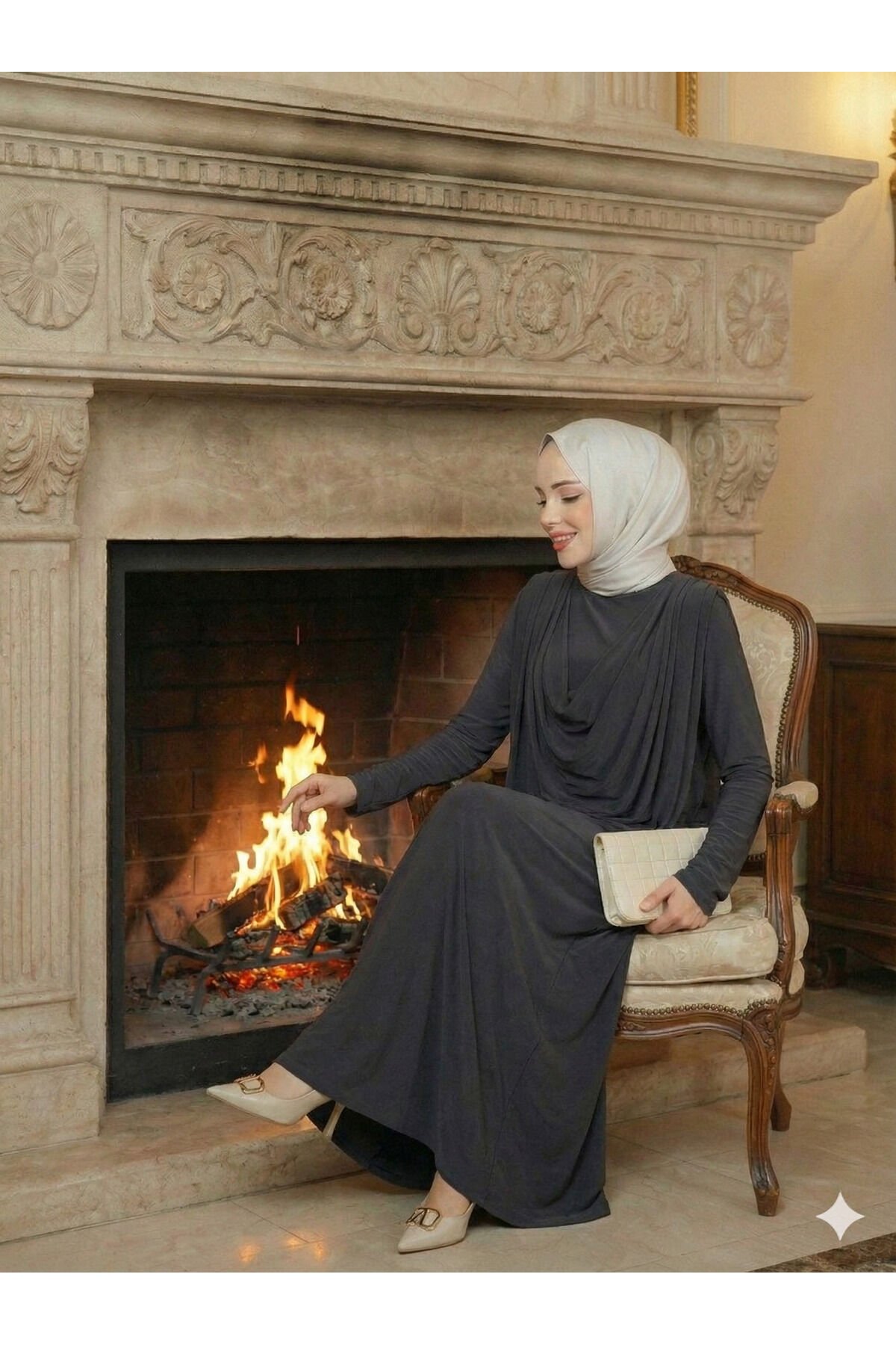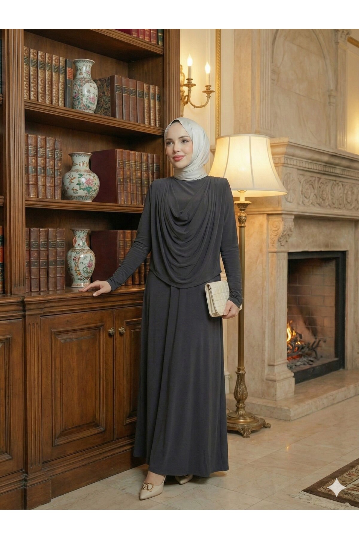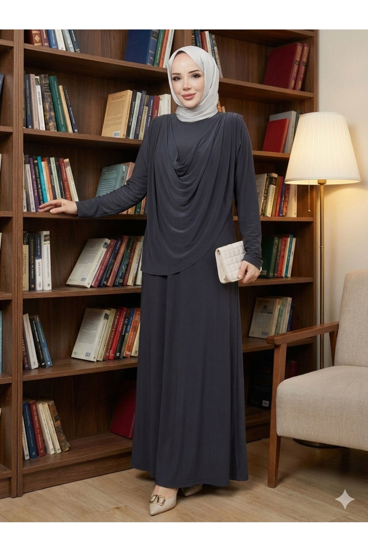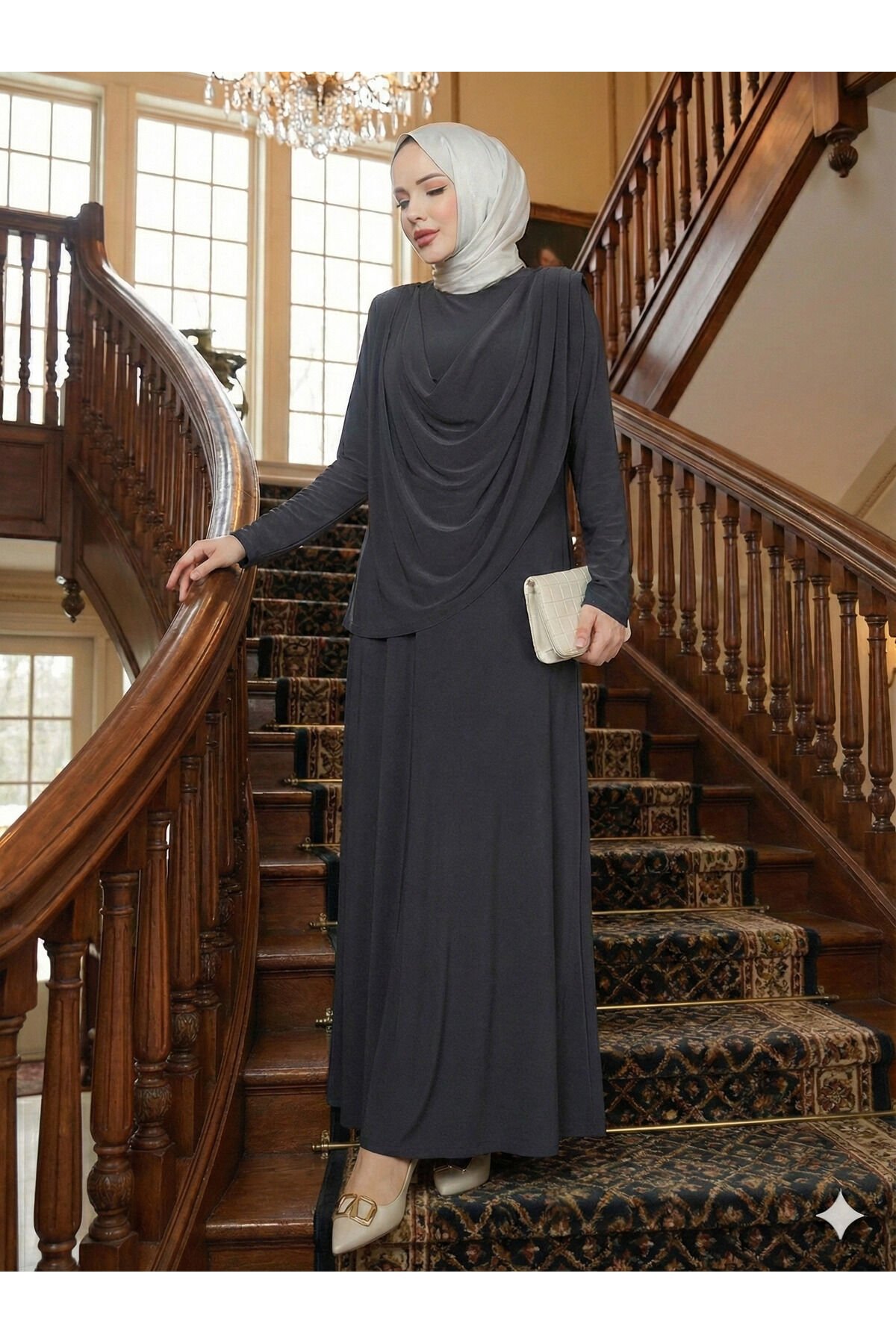 Kadın Sandy Lacivert Önü Degaje Detaylı Tesettür Elbise Füme - 42