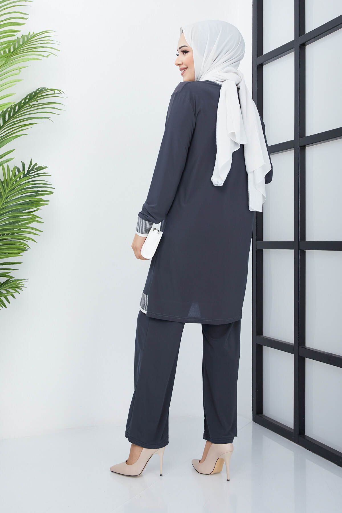 Kadın Zümrüt Yeşil Tunik-pantolon İkili Tesettür Pantolonlu Takım Füme - 42