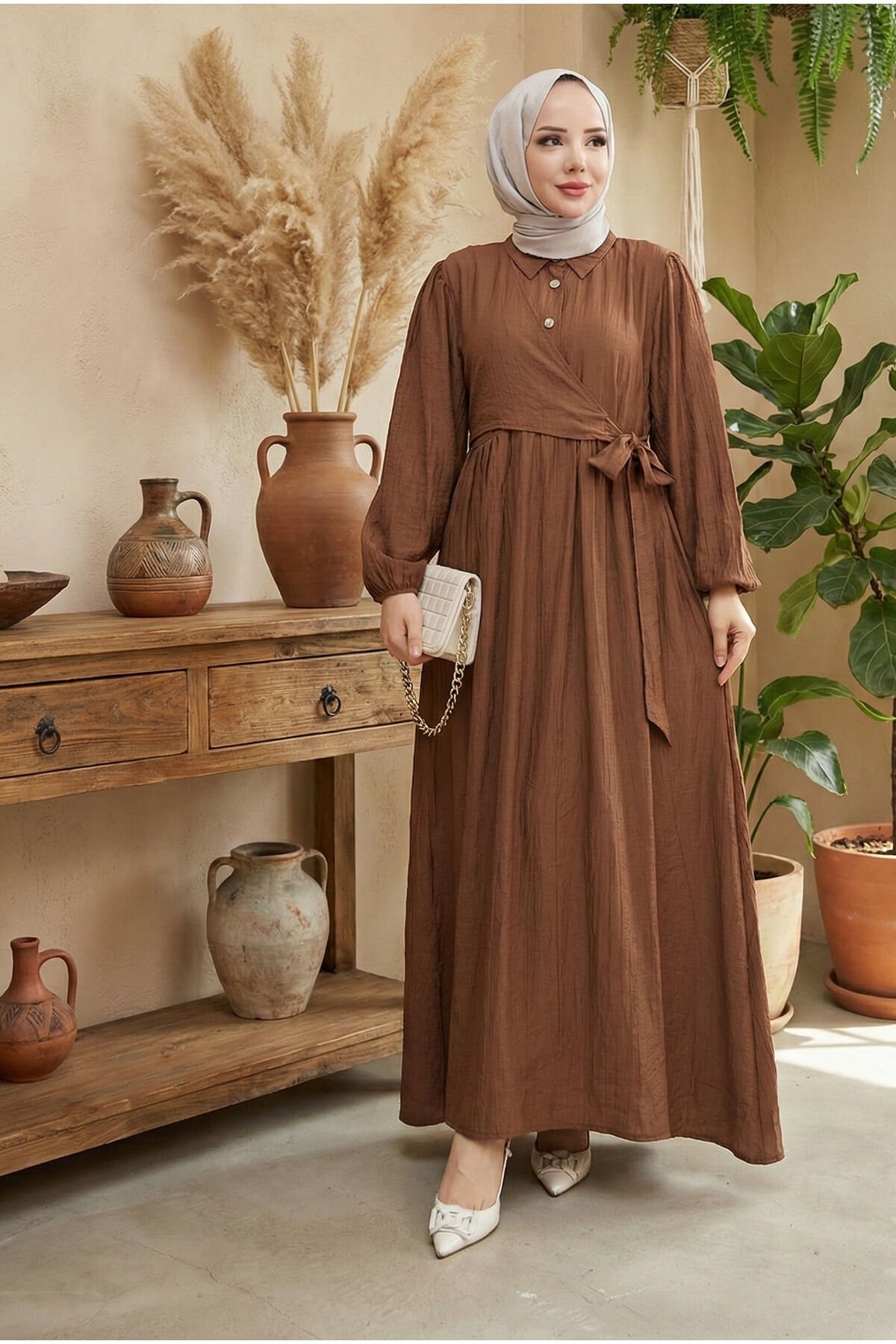 Kadın Bordo Çilek Kumaş Önü Düğmeli Kapamalı Gömlek Yaka Boydan Tesettür Elbise Kahverengi - 46