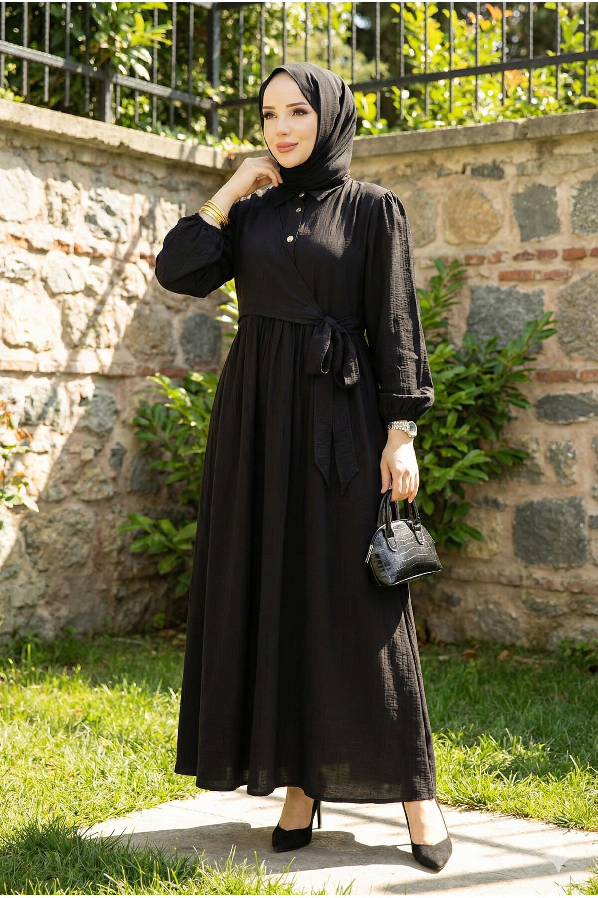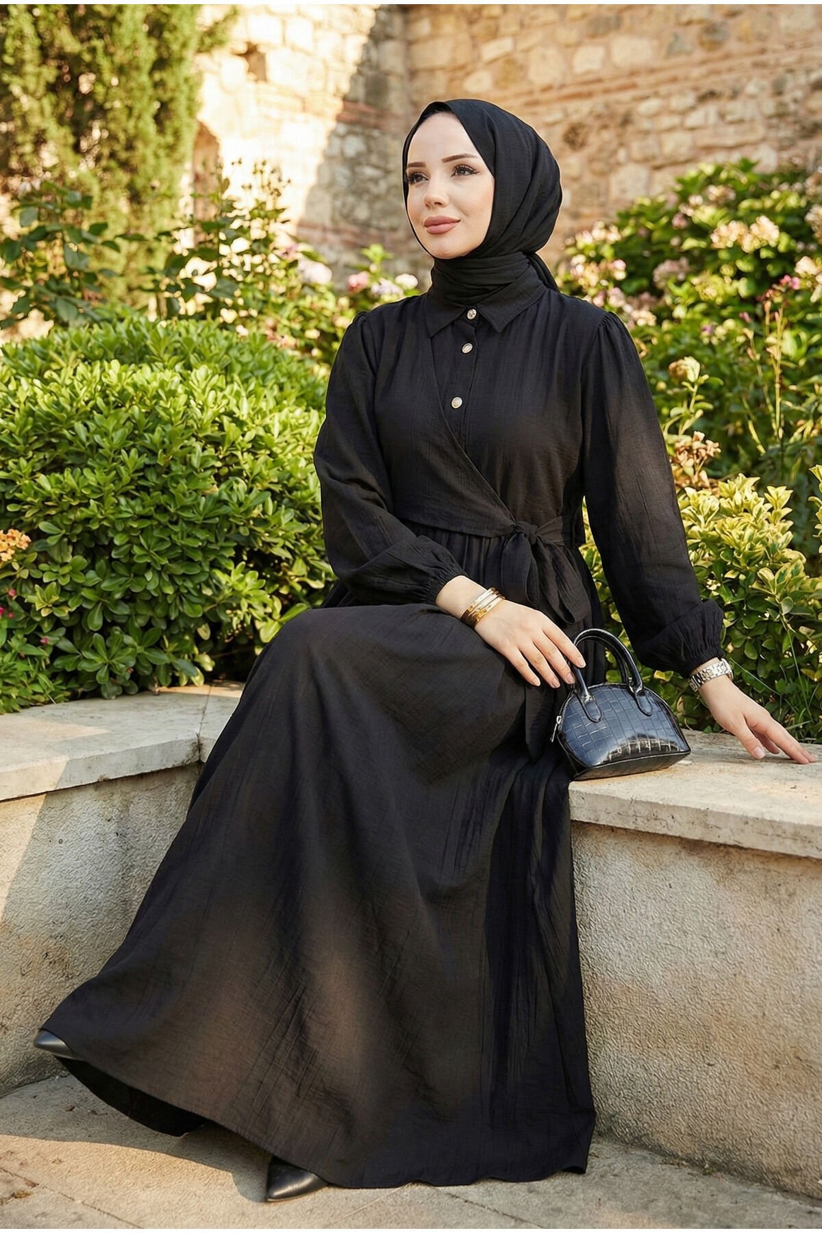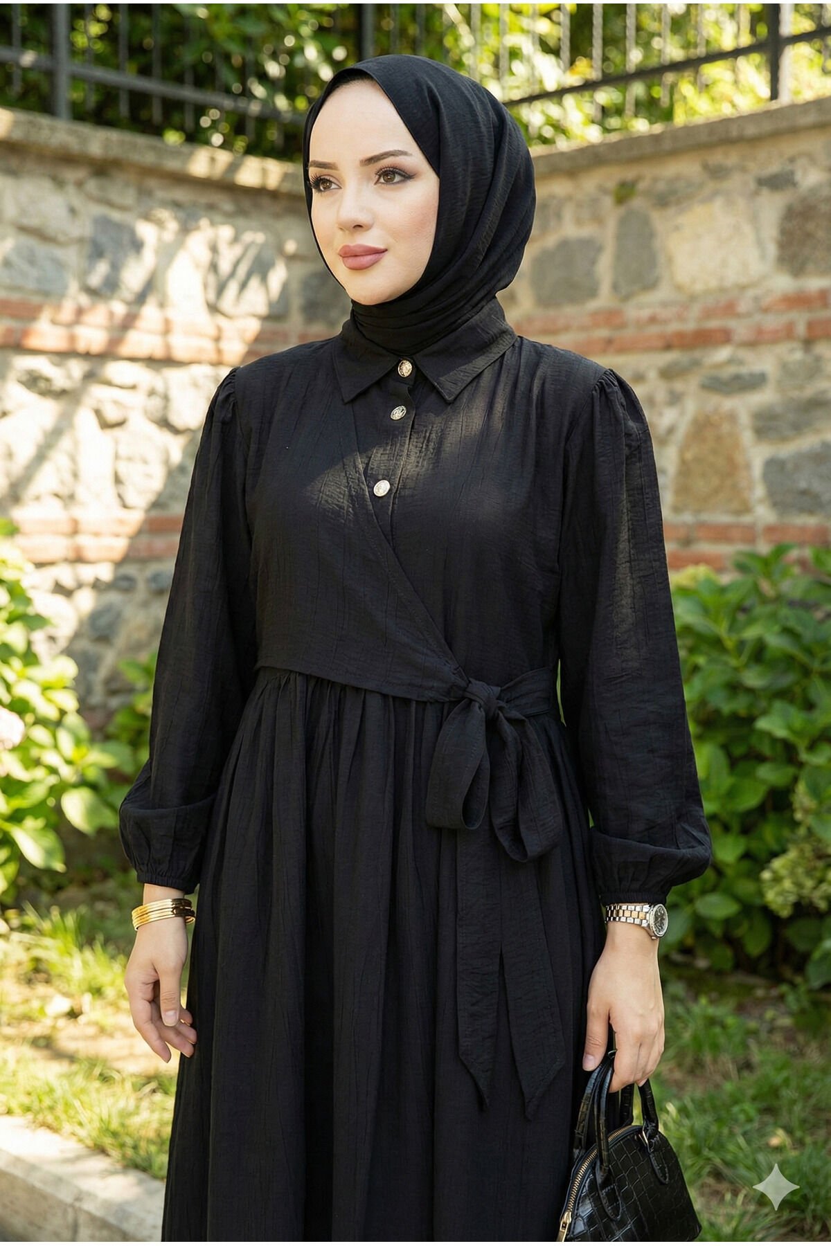 Kadın Bordo Çilek Kumaş Önü Düğmeli Kapamalı Gömlek Yaka Boydan Tesettür Elbise Siyah - 48