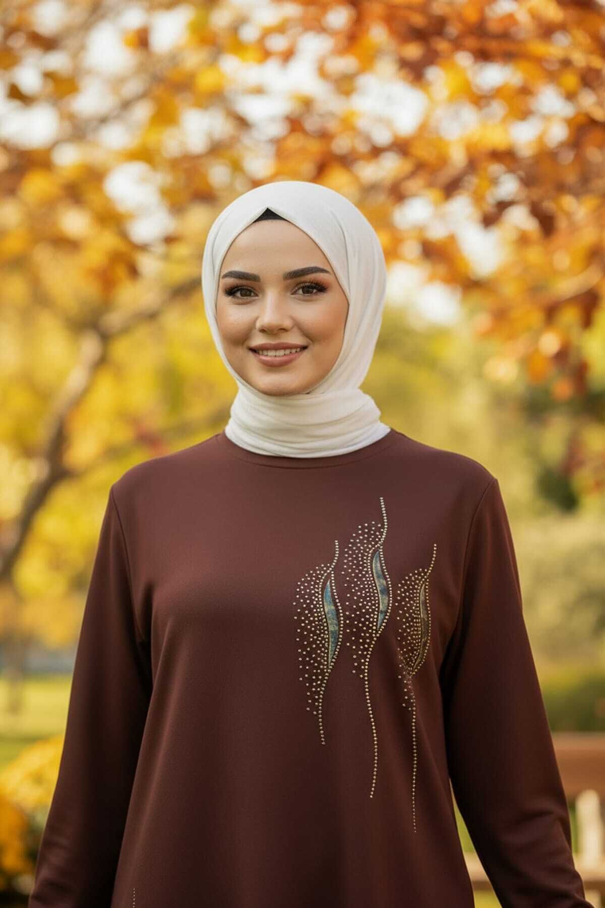 Kadın Kahve Kristal Pamuk Büyük Beden Önü Aplike ve DMS Taş detaylı Tesettür Tunik Kahve - 46