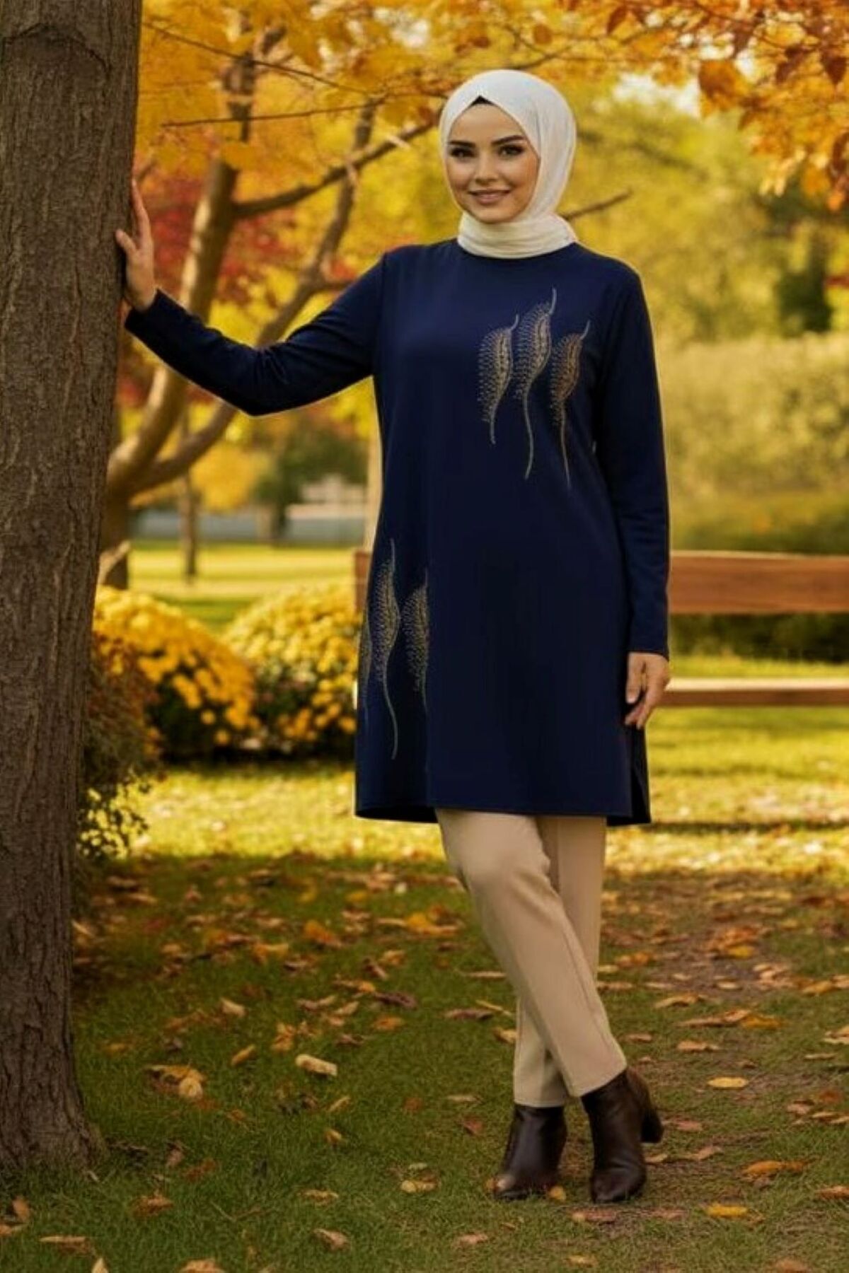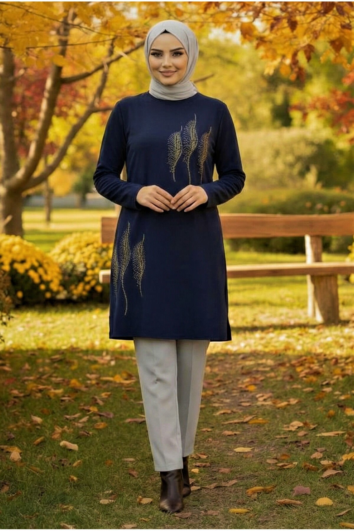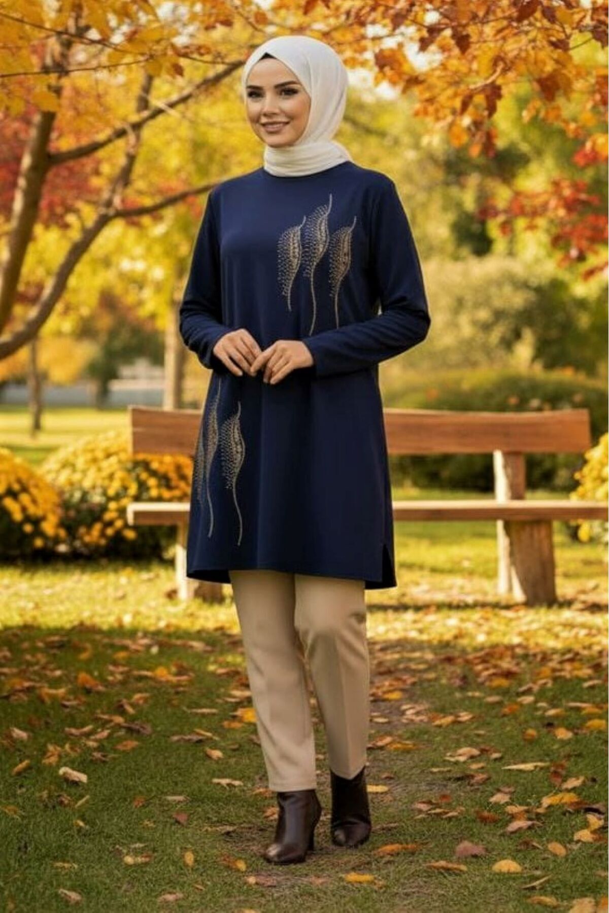 Kadın Kahve Kristal Pamuk Büyük Beden Önü Aplike ve DMS Taş detaylı Tesettür Tunik Laci̇vert - 46