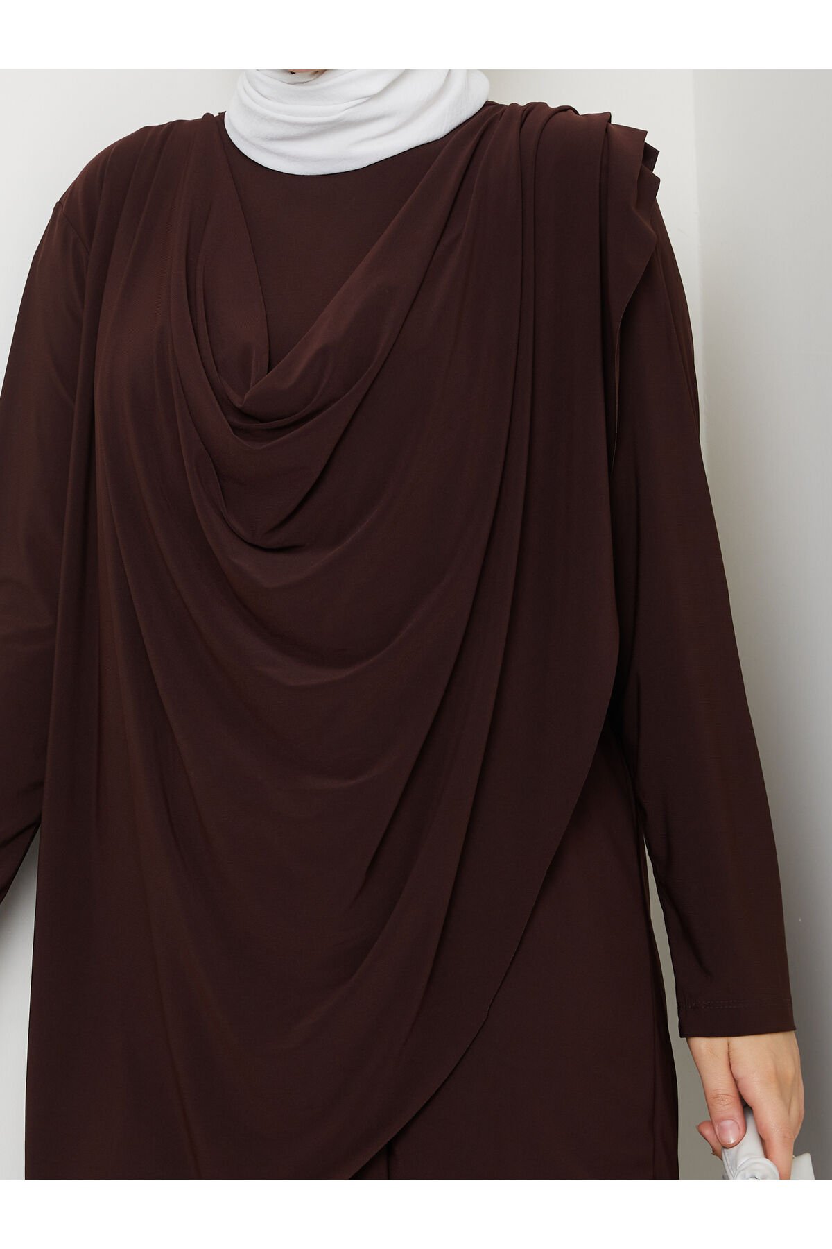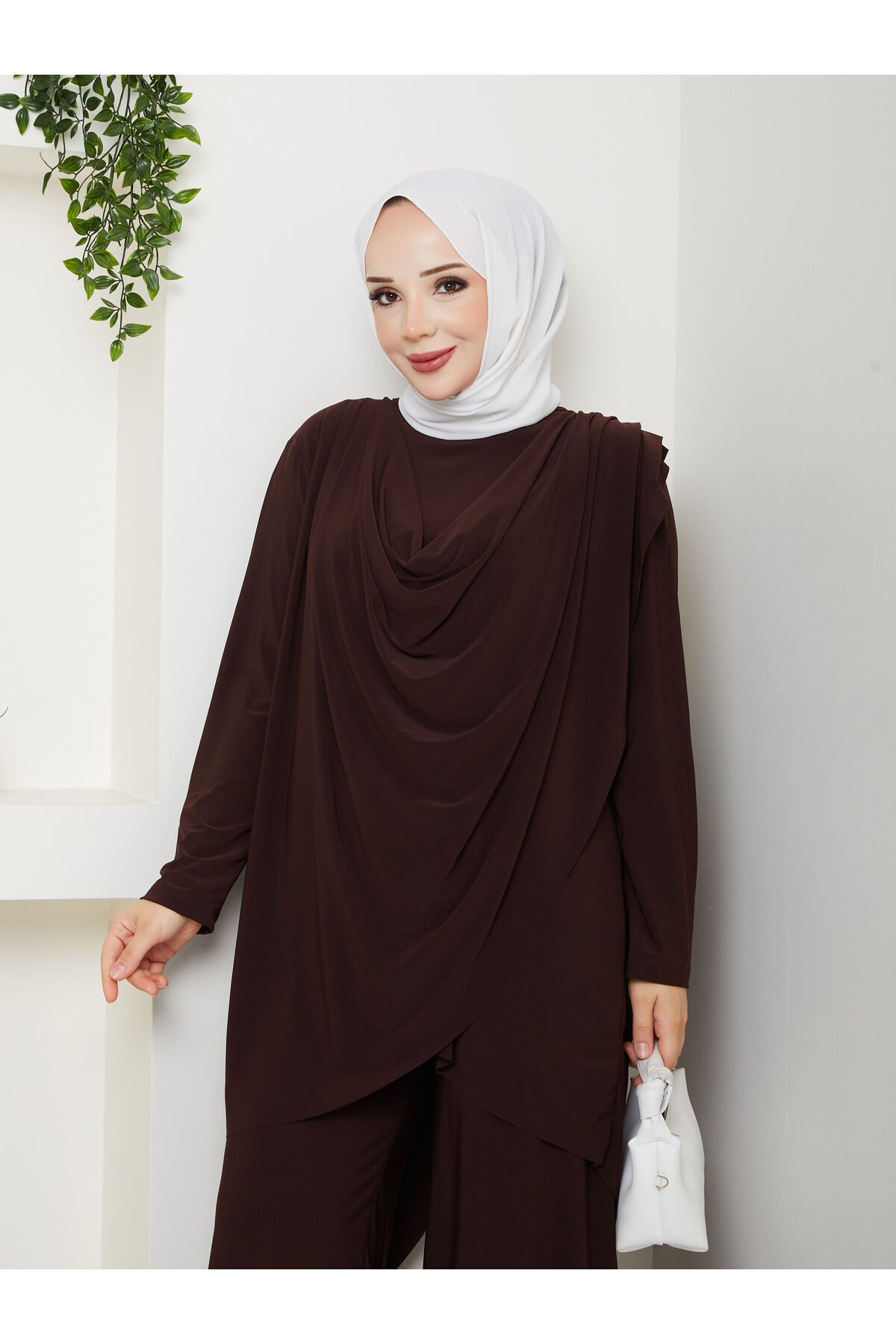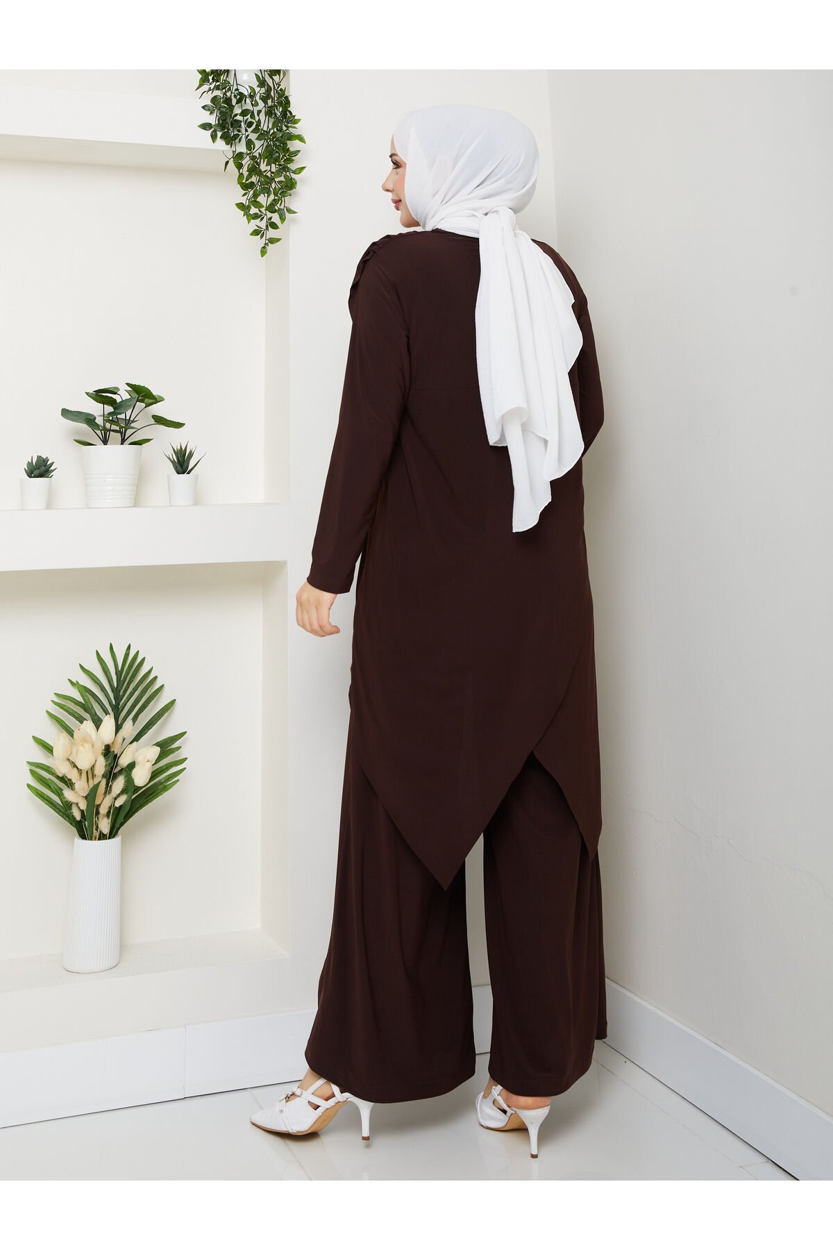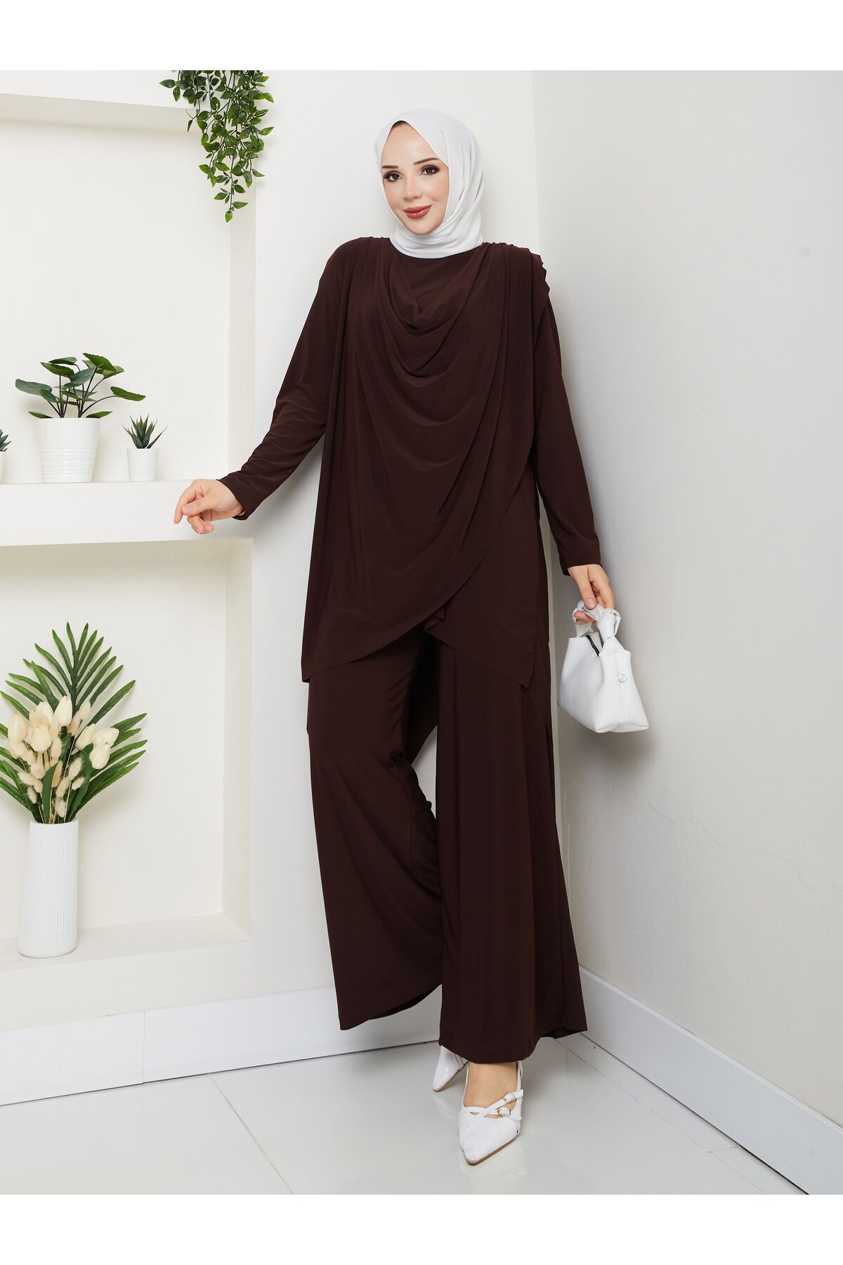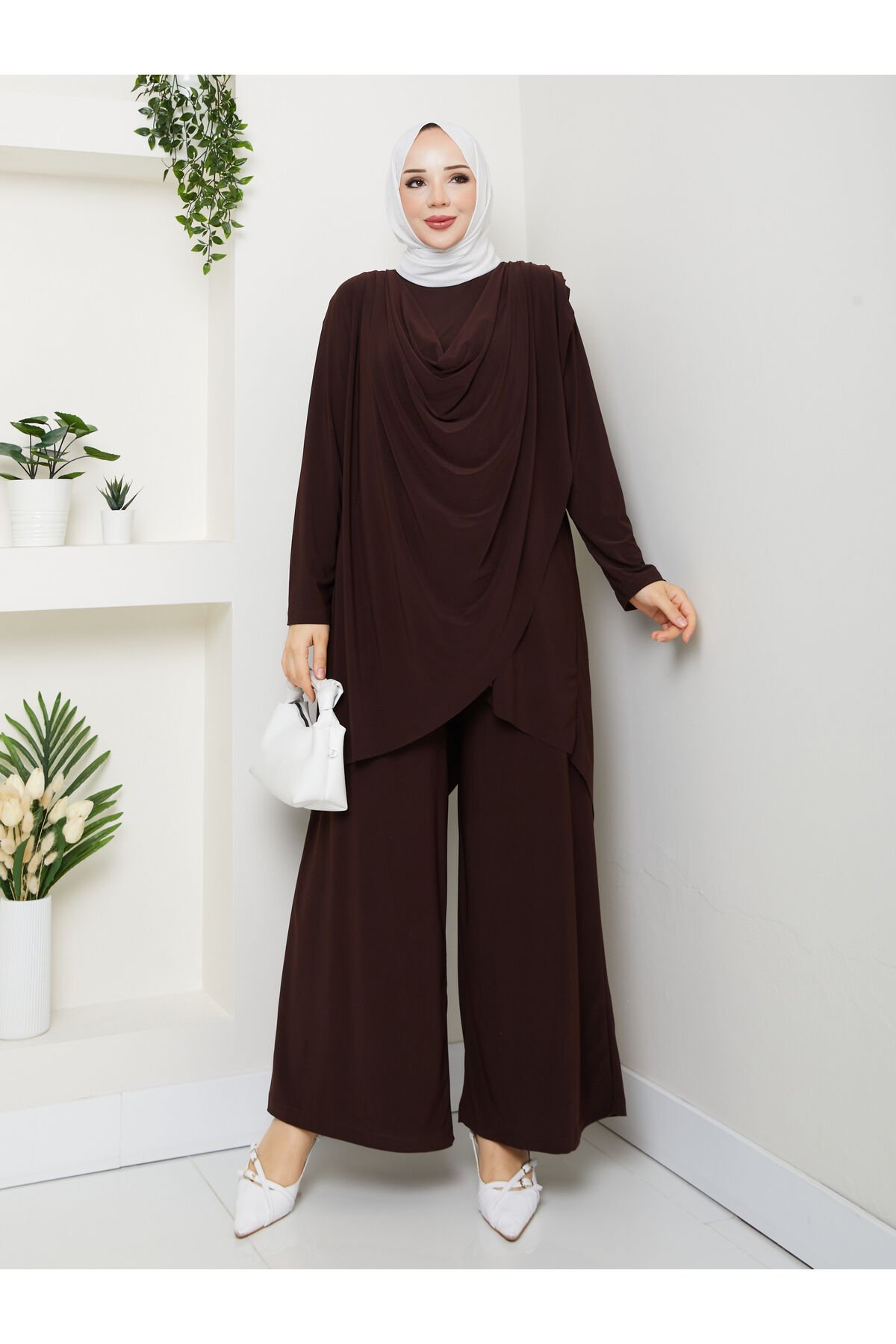 Kadın Kahve Sandy Önü Dökümlü Degaje Asimetrik Kesim Bol Paça Pantolonlu İkili Tesettür Takım Lacivert - 42