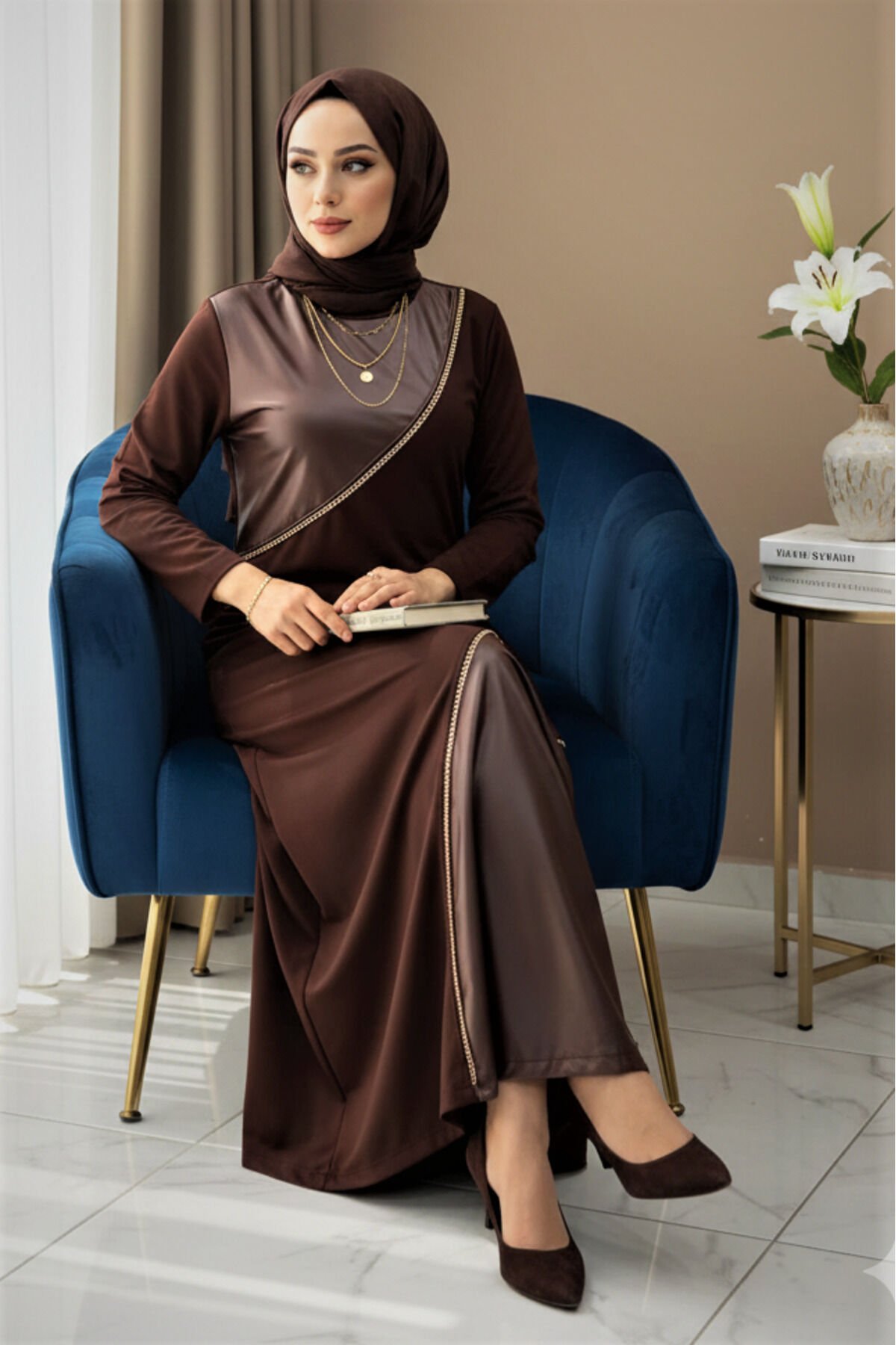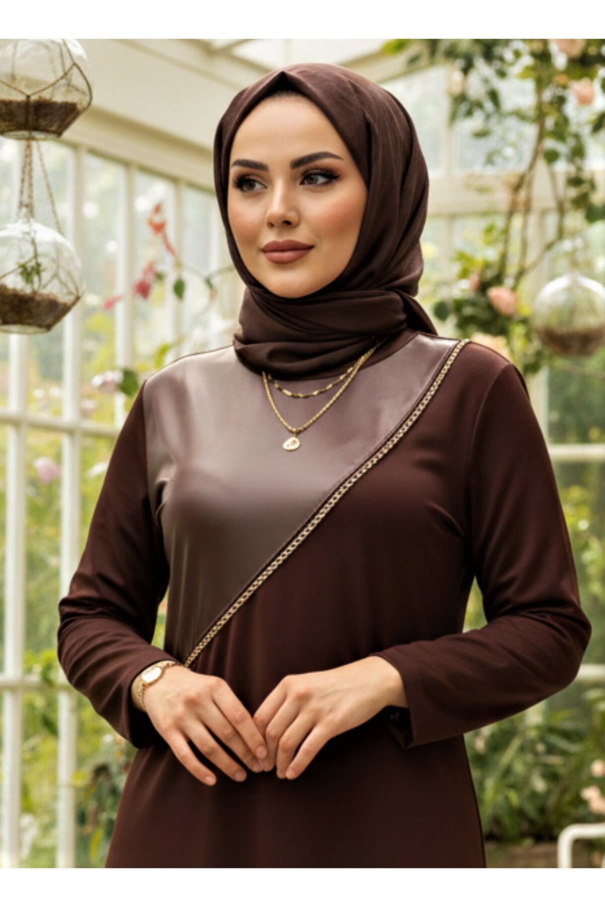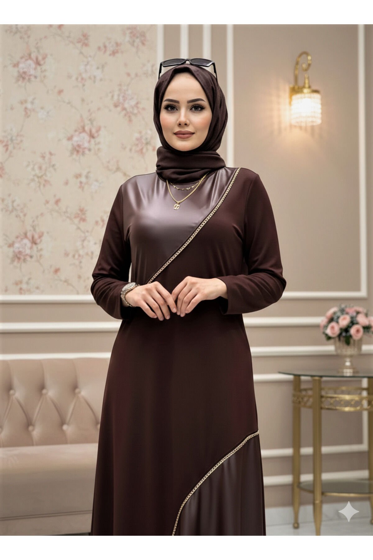 Kadın Önü Deri ve Zincir şıklığı Detaylı Tesettür Tasarım ELbise Kahve - 40