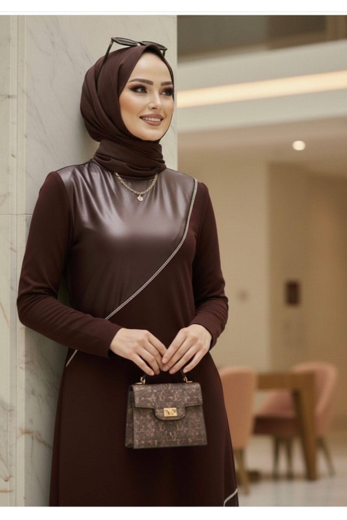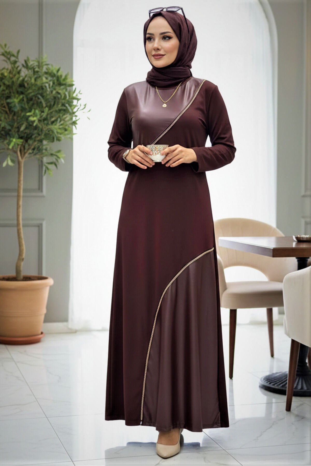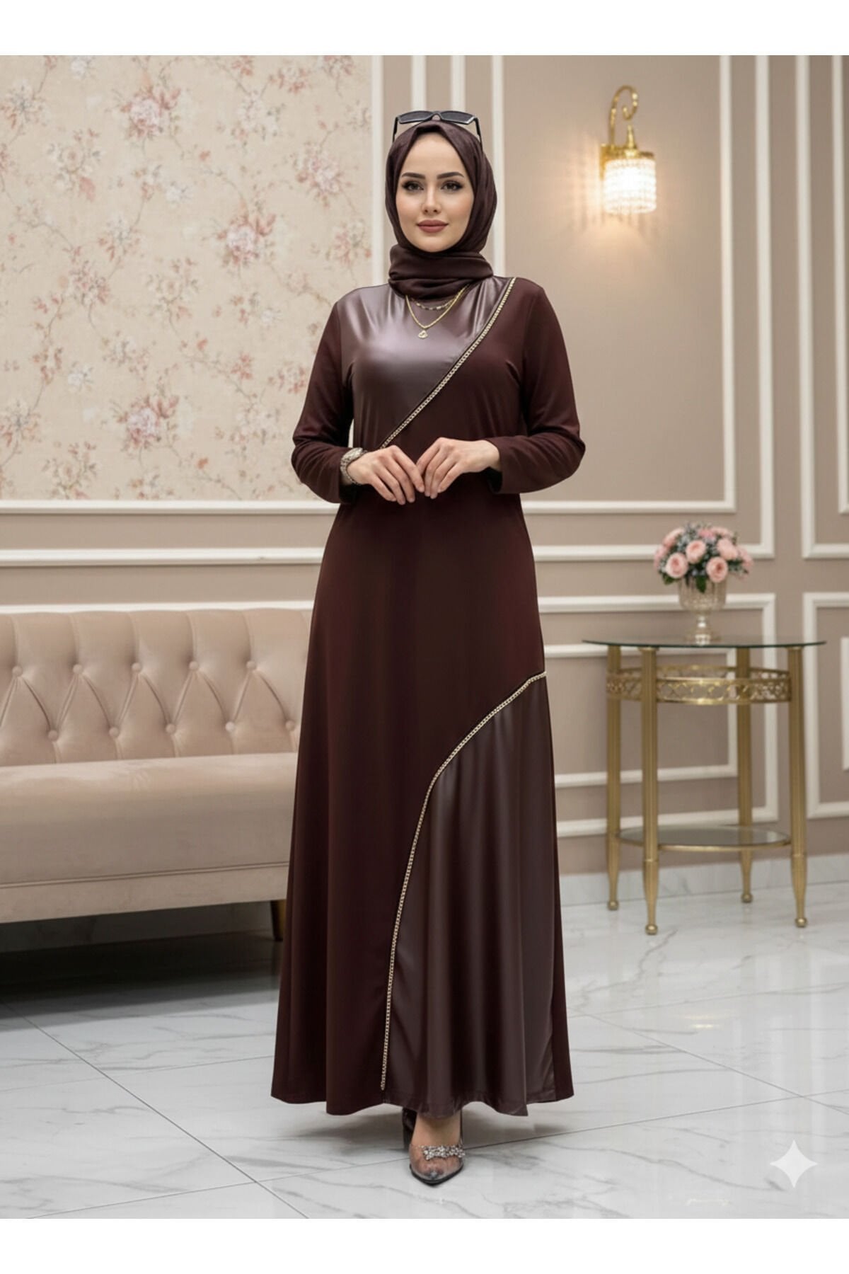 Kadın Önü Deri ve Zincir şıklığı Detaylı Tesettür Tasarım ELbise Kahve - 40