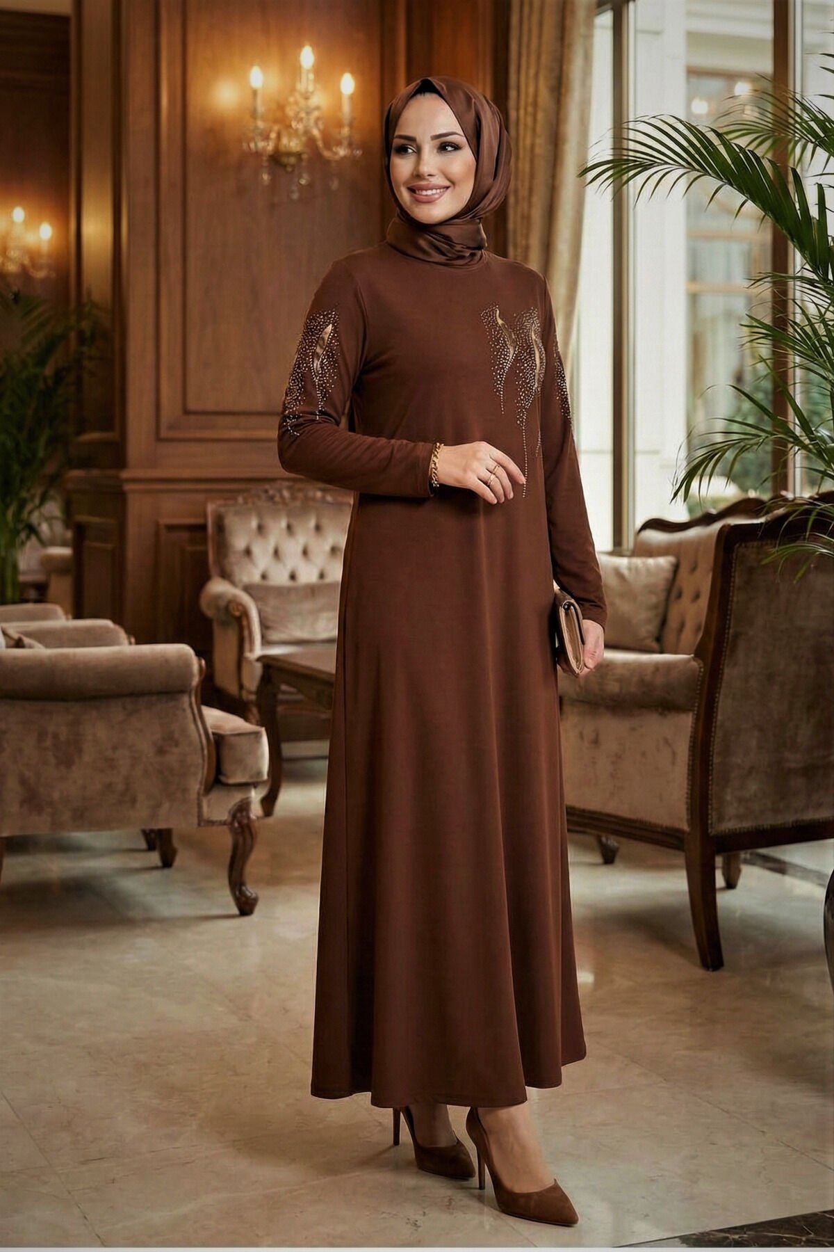 Kadın Pamuk Viskon Kahverengi Boydan Abiye Büyük Beden Kol Ve Önü Taş Detaylı Tesettür Elbise Kahverengi - 42