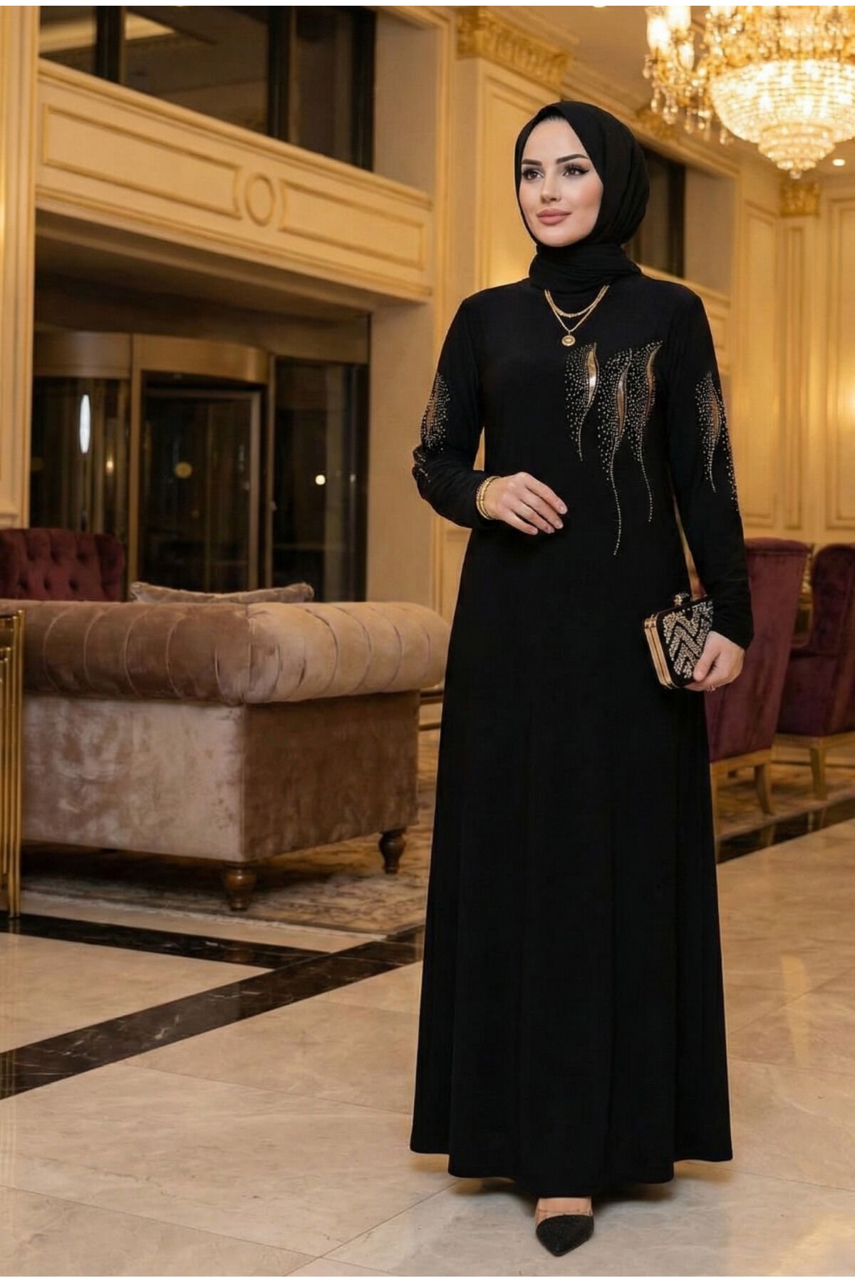 Kadın Pamuk Viskon Kahverengi Boydan Abiye Büyük Beden Kol Ve Önü Taş Detaylı Tesettür Elbise Siyah - 42