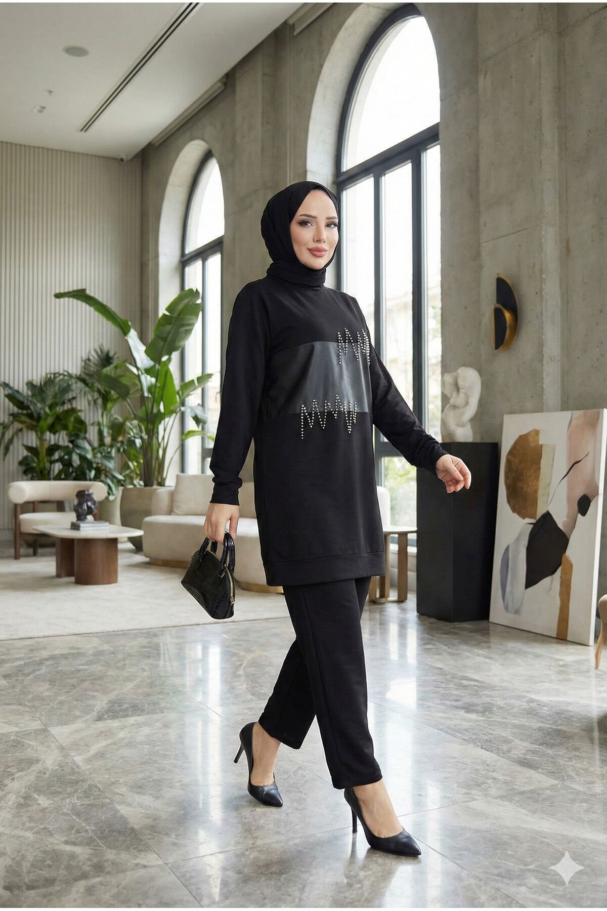 - Yüksek bel tasarımı ile konforlu bir kullanım sunar.; - Standart kol yapısıyla günlük aktivitelerinizde rahatlık sağlar.; - %85 pamuk içeriği sayesinde nefes alabilen ve yumuşak dokusuyla cildinize nazikçe dokunur.; - Bisiklet yakası ile modern ve şık bir görünüm kazandırırken, düz deseniyle sadelikten yana olanların tercihi olur.; - Tekli paket içeriği sayesinde kolayca kombinleyebileceğiniz ikili takım olarak tasarlanmıştır.; - Cepsiz yapısı ile minimalist tarzınızı ön plana çıkarırken pratikliği de beraberinde getirir.; - Kapamasız tasarımının sunduğu rahatlıkla her türlü üst giyimle uyum sağlar.; - Yetişkin yaş grubuna hitap eden geniş beden skalasıyla herkes için uygundur.; - Astarsız oluşuyla hafiflik hissi vererek gün boyu konforlu bir deneyim sunar.; -Suni deriden yapılan detayları ile stil sahibi görünümünüzü tamamlarken tesettür giyime modern dokunuş katıyor.; -Tesettür giyimin vazgeçilmez parçası olarak tüm sezonlarda kullanabileceğiniz çok yönlülükteki tasarıma sahip -Kutusuz ambalaj seçeneğiyle çevreye duyarlı bir seçim yapmanızda yardımcı olurken aynı zamanda şık saklama imkanı tanır -Standart boy ölçüsüne sahip pantolon kesimiyle vücut hatlarınıza uygunluk göstermektedir -Regular fit kalıp sayesinde vücudu sararken hareket özgürlüğünüzden ödün vermez -Günlük casual ortamlara uygunluğu yüksek olan bu ikili takım, evde ya da dışarıda keyifle giyilebilme avantajına sahiptir -Tunikli pantolonlu altüst takımıyla bütünleşik yapıya sahip olup farklı renk kombinasyonlarına izin vererek kişisel zevkinize göre ayarlama yapılabilir- Rahat kesimi ile günlük kullanıma uygun, yüksek bel tasarımı sayesinde konforlu bir deneyim sunar.; - Suni deri detayları ve inci baskısı ile şıklığına şıklık katarken, pamuklu materyali cildinizle dosttur.; - Uzun kollu tunik ve pantolon kombiniyle hem rahat hem de stil sahibi görünmenizi sağlar.; - Orta kalınlıkta kumaşı mevsim geçişlerinde ideal sıcaklık sunarken, regular fit silueti vücut hatlarınızı nazikçe sarar.; - Bisiklet yakası sayesinde modern ve zarif bir görünüm elde edersiniz; günlük aktivitelerinizde rahat hareket etme özgürlüğünüz korunur.; - Kapamasız tasarımıyla pratik kullanım imkanı sağlar; ayrıca bel kısmındaki lastikli yapısı sayesinde ayarlama kolaylığı sunar.; - İki parçadan oluşan set içeriğiyle bütünsel bir şıklık sergiler; her zaman hazır olmanız gereken günlerde ideal seçimdir.; - Tesettür giyim koleksiyonuna özel olarak tasarlanmış bu takım, modern çizgilerle geleneksel tarzı birleştiriyor.; - Siyah renk seçeneğiyle kolay kombinlenebilirlik sunarken, her ortama uyum sağlayacak zarifliği yakalarsınız.; - 30 derecede yıkama talimatına uygun bakım ile uzun süre ilk günkü formunu korur; böylece zamandan tasarruf edersiniz.