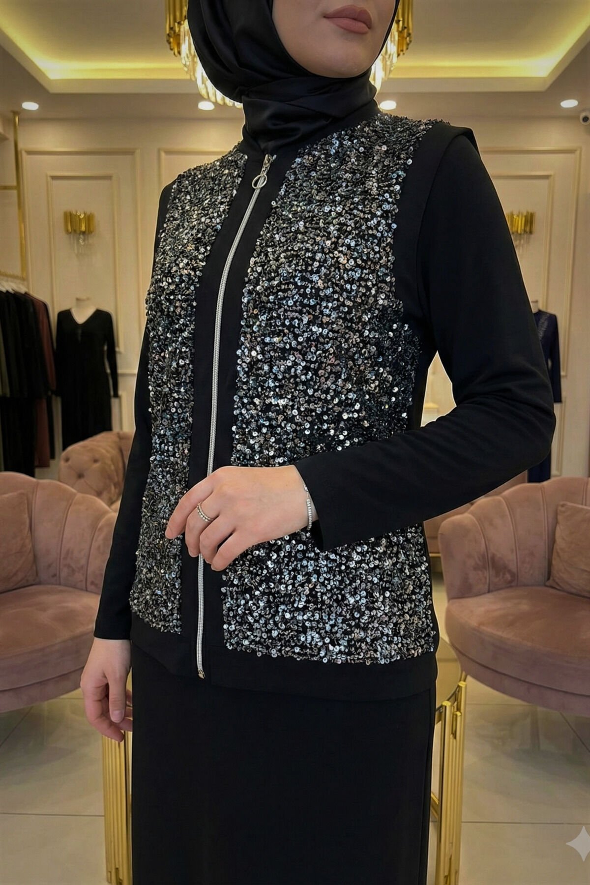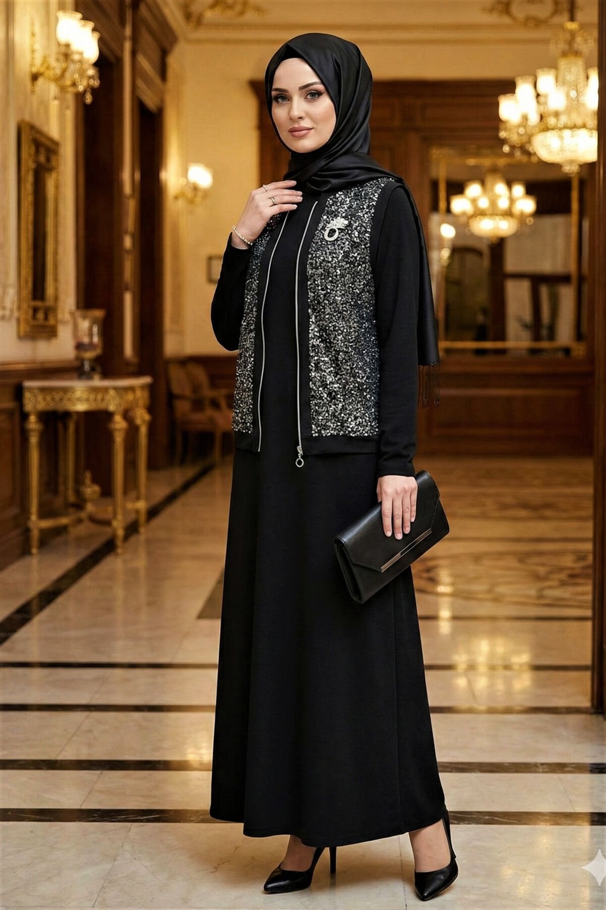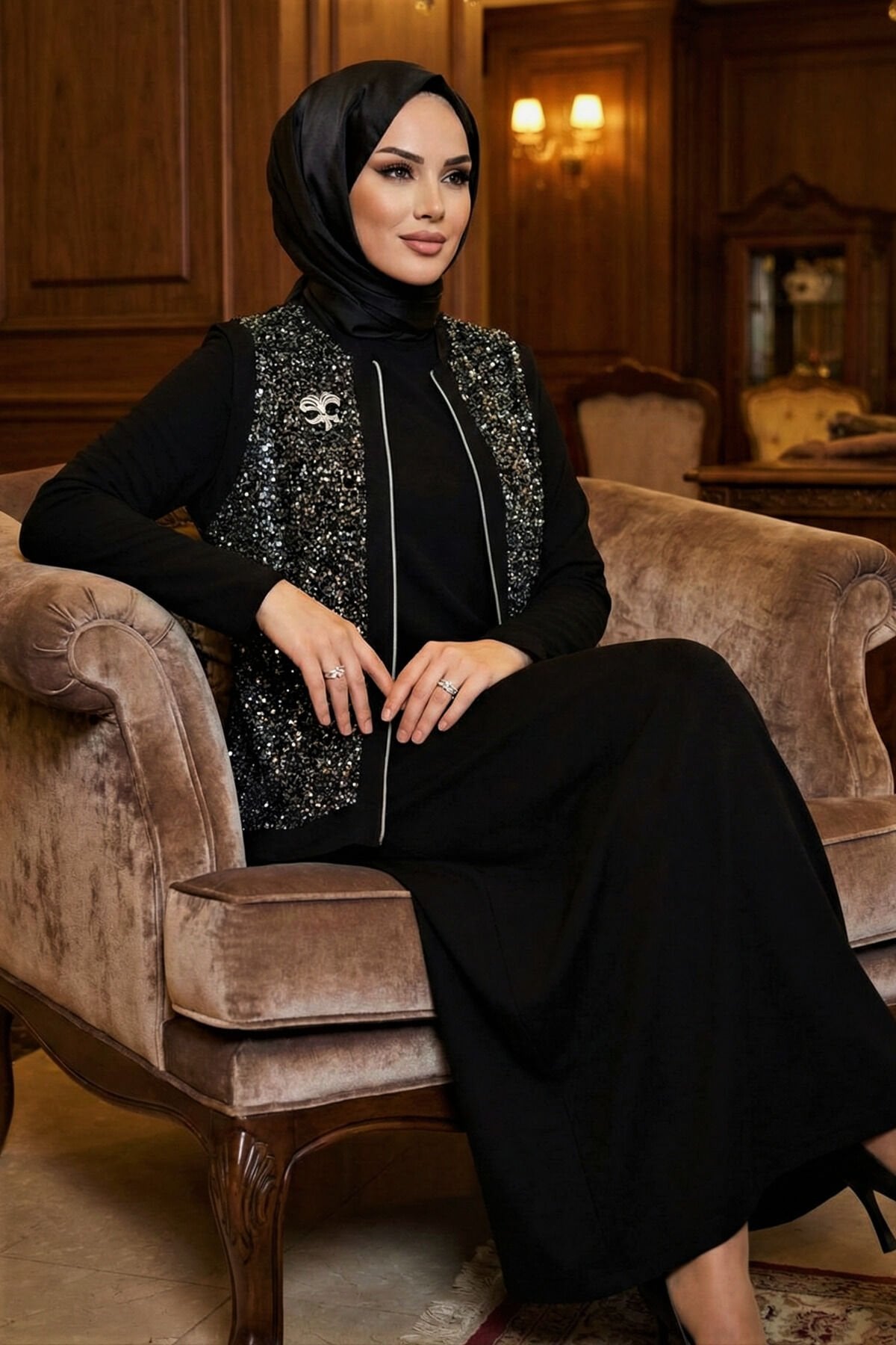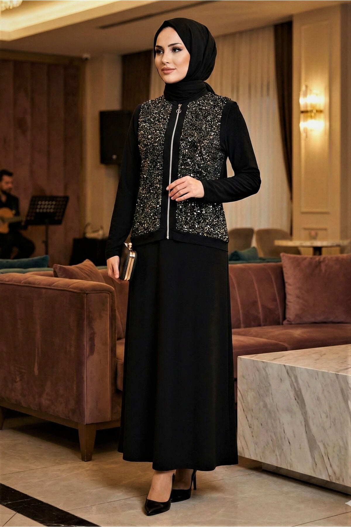 Kadın Pamuk Viskon Siyah İkili Davet Tarz Özel Tasarım Pul Payet Detaylı Tesettür Yelek Elbise Siyah - 46