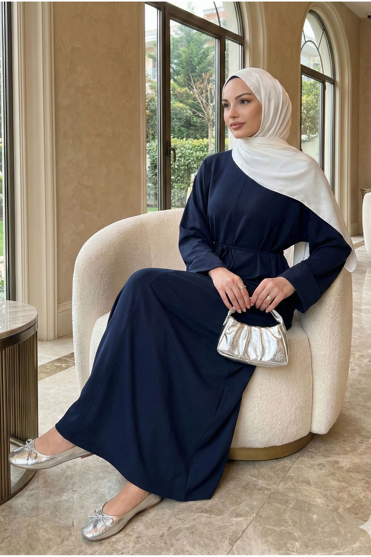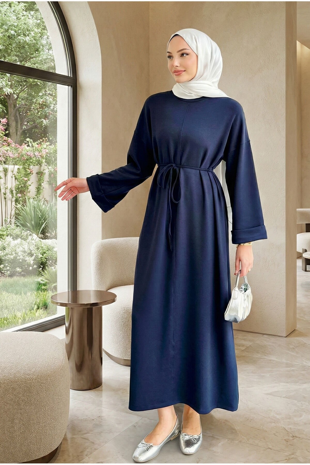 Kadın Pamuklu kahverengi Kumaş füme Sonbahar Kış Tesettür Boydan Uzun Yaren Elbise Laci̇vert - 46