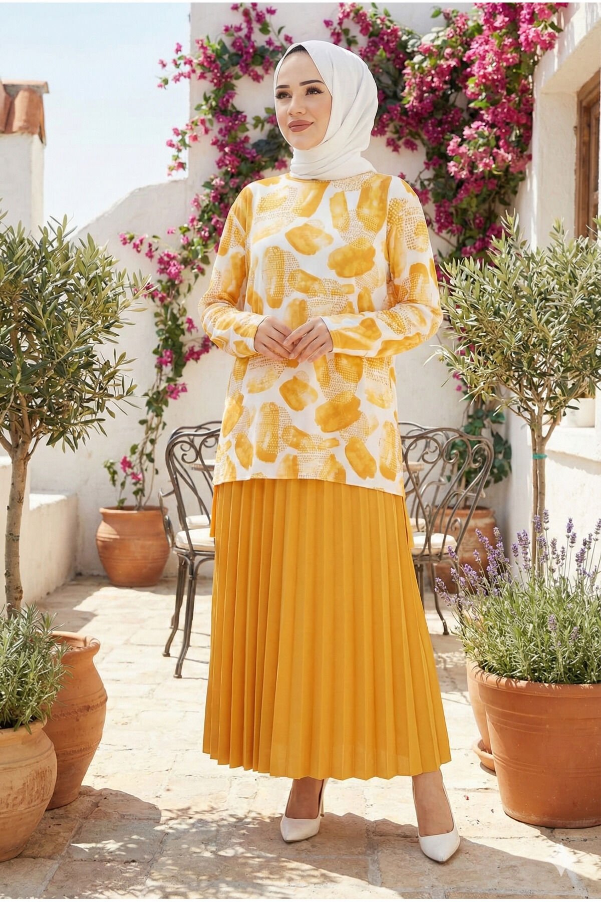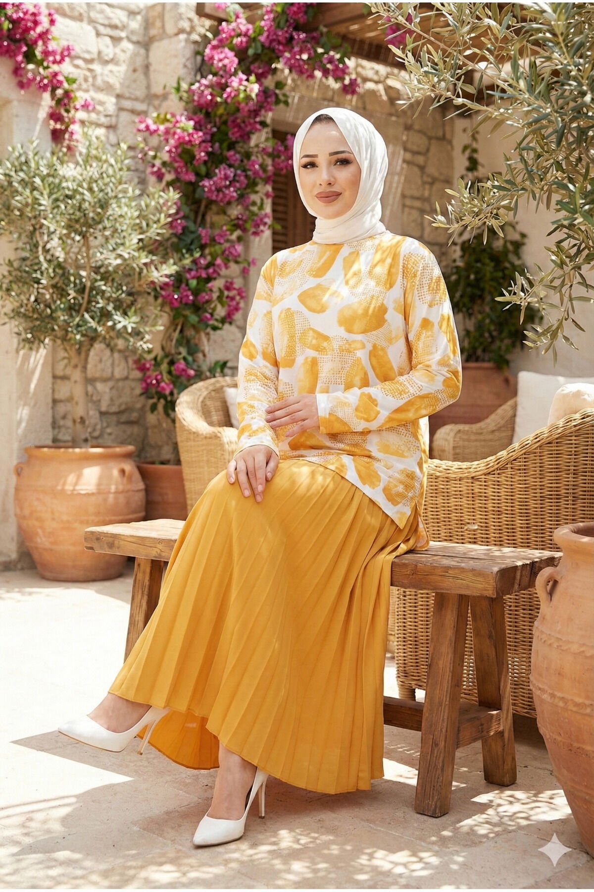 kadın sandy 2li eteği piliseli ikil tesettür etekli takım Kayısı Sarı - 44