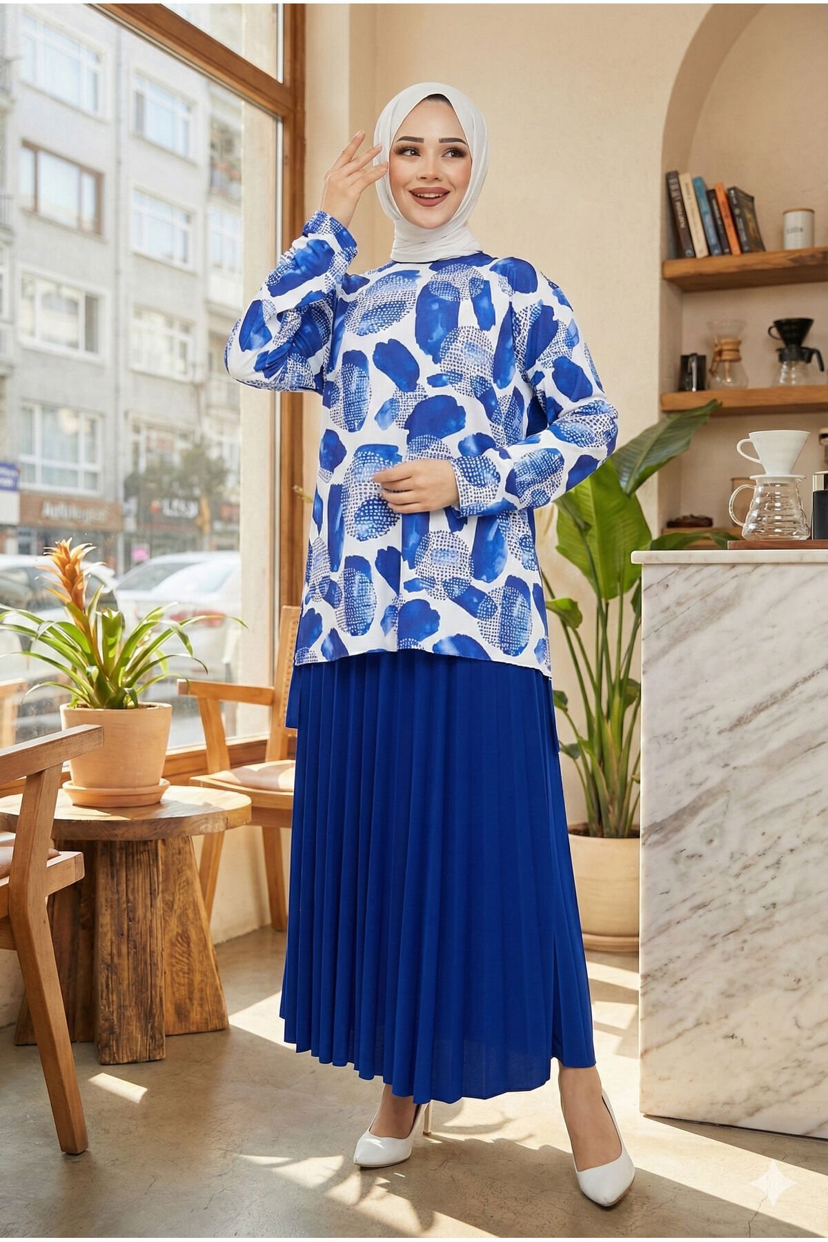 kadın sandy 2li eteği piliseli ikil tesettür etekli takım Saks Mavi - 46