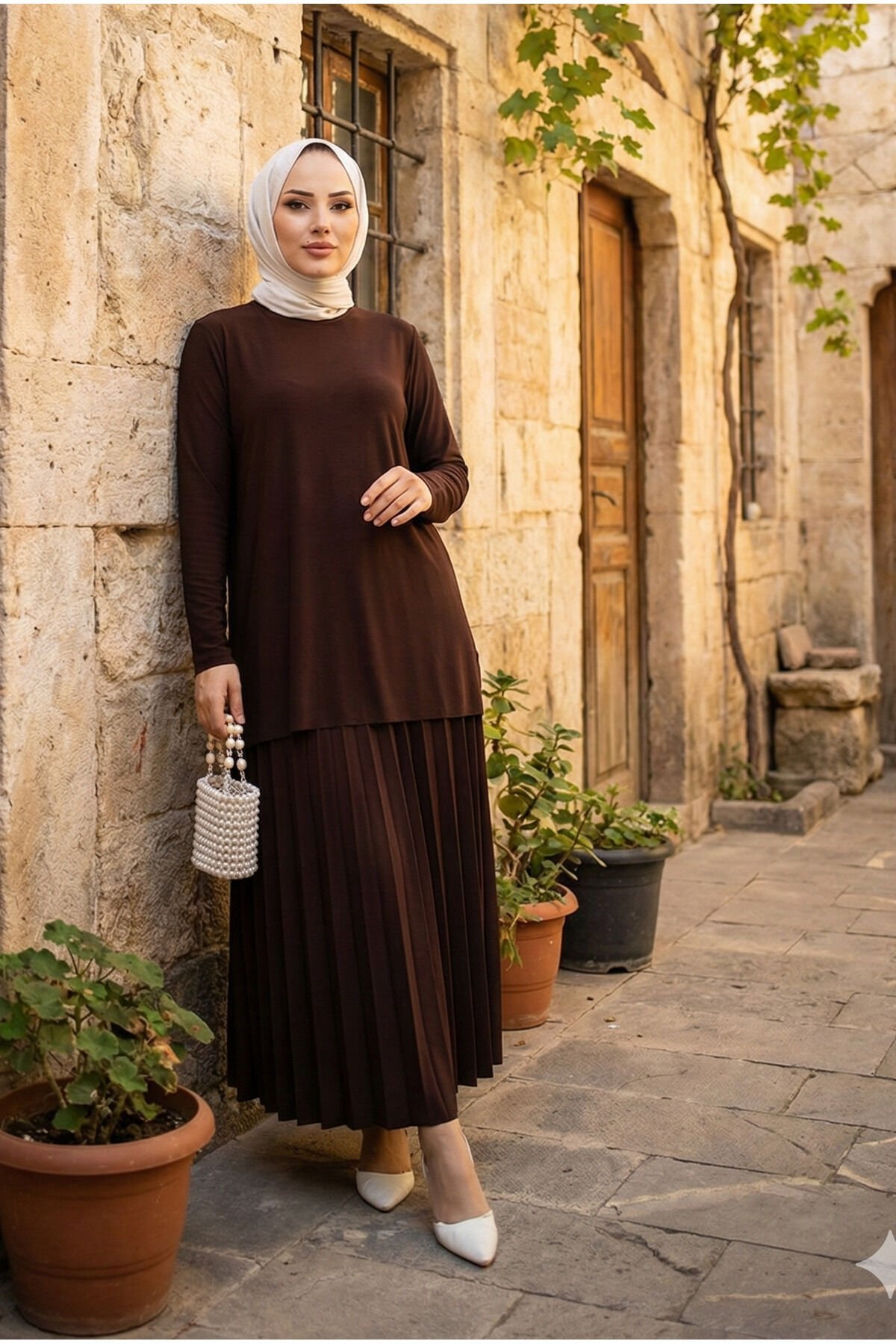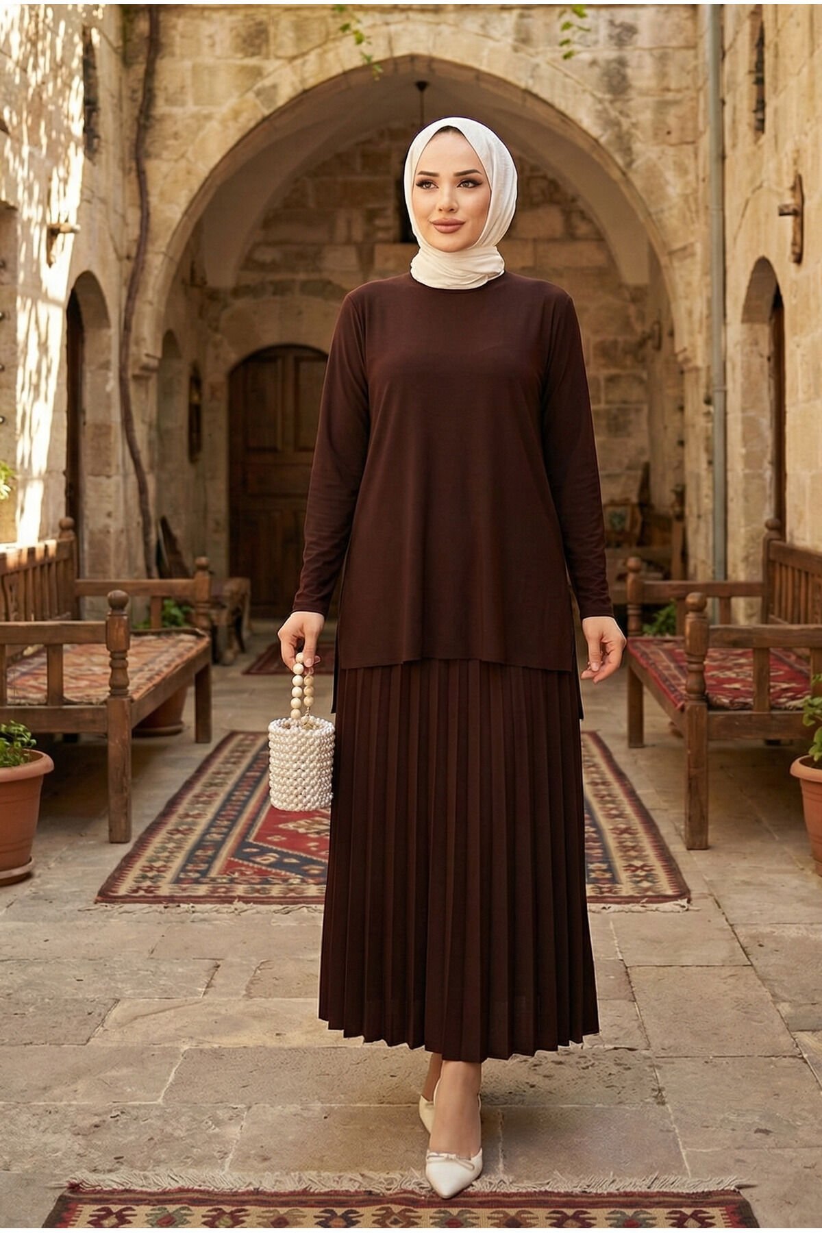 Kadın Sandy Çağla Yeşil Büyük Beden 2li Bluz Etek Piliseli Ikili Tesettür Etekli Takım Kahve - 54