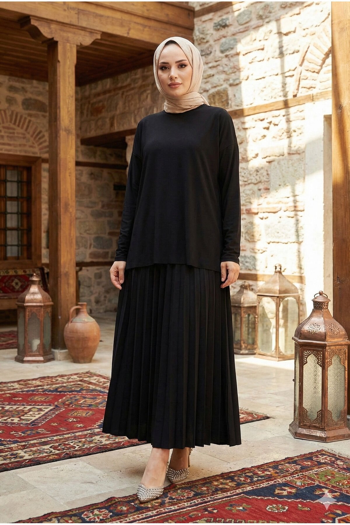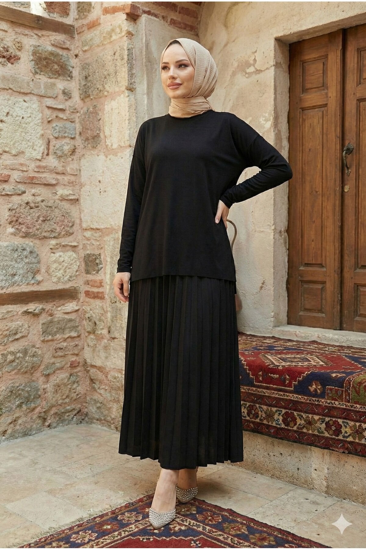 - Rahat kesimi ile günlük kullanım için ideal, büyük beden 2'li bluz etek piliseli tesettür takım.; - Yaz aylarının sıcak günlerinde serin tutan ince viskon karışımlı kumaşıyla konfor sunar.; - Lastikli bel tasarımı sayesinde vücut hatlarınıza mükemmel uyum sağlar ve rahat hareket etmenizi kolaylaştırır.; - Astarsız yapısıyla hafif ve nefes alabilen bir yapıya sahiptir; cilt dostudur.; - Düz deseniyle zamansız bir şıklık sunarken, her türlü aksesuarla kolayca kombinlenebilir.; - Normal bel yüksekliği ile hem şık hem de pratik bir kullanım vaat eder.; - Uzun boy tasarımı sayesinde bacakları olduğundan daha uzun gösterir ve zarif bir siluet çizer.; - Lastikli ek detayları sayesinde giyip çıkarması kolaydır; günlük kullanım için idealdir.; - Günlük ortamlarda rahatlıkla tercih edebileceğiniz bu takım, modaya uygun görünümün yanında konforu da ön planda tutar.; - Modamira tekstil imzasıyla zeytinburnu istanbul'da tasarlanmış ve üretilmiştir; kalite standartlarına sahiptir.; - Bisiklet yakası ile modern ve minimalist bir tarz sunarken, bluz ve etek kombinasyonuyla stil sahibi görünmenizi sağlar.; - Zümrüt yeşili rengiyle dikkat çekici ve canlı bir görünüm kazandırırken, her mevsim tercih edebileceğiniz renk seçeneği sunar.; - Kapamasız yapısı sayesinde basit ama şık bir görünüm elde edersiniz; ekstra aksesuar ihtiyacını ortadan kaldırır.- Rahat kesimi ile günlük kullanım için ideal, siyah renkteki bu tesettür takım, yaz aylarında serin tutan ince kumaşıyla konfor sunar.; - Lastikli bel tasarımı sayesinde vücuda mükemmel uyum sağlar ve hareket özgürlüğü tanır.; - Astarsız yapısıyla hafif ve nefes alabilen bir yapıya sahiptir; böylece gün boyu rahat hissetmenizi sağlar.; - Düz deseniyle zamansız bir şıklık sunarken, her türlü aksesuarla kolayca kombinlenebilir.; - Uzun eteği sayesinde hem şık hem de rahat bir görünüm elde edersiniz; standart kol tipi ise gün içindeki aktiviteleriniz için idealdir.; - Viskon karışımlı materyali cildinizi tahriş etmeden yumuşak bir dokunuş sağlar ve esnek yapısıyla hareket serbestliği sunar.; - 30 derecede elde veya makinede tersten yıkama imkanına sahip olması bakımının kolay olmasını sağlar; böylece takımınız uzun süre ilk günkü gibi kalır.; - Günlük kullanım için tasarlanmış bu takım, her ortamda stil sahibi görünmenizi garanti ederken aynı zamanda cool & comfort (soğuk ve rahat) kişiliğinizi yansıtır.; - Moda dünyasında trend olan bu parça, tesettür giyim koleksiyonunuzda yerini alacak mükemmel bir seçenektir.; - Bisiklet yakası sayesinde modern ve zarif bir görünüm kazandırırken, kapamasız tasarımı pratiklikten ödün vermez.; - 48 beden seçeneğiyle geniş beden skalası sunan bu takım, her bedene uygunluk göstererek gardrobunuza çeşitlilik katmak isteyenler için idealdir.; - Beli lastikli yapısı sayesinde gün boyu rahatlıkla giyilebilir; böylece konforlu bir deneyim yaşamanız sağlanır.; - İki parçadan oluşan set içeriğiyle bütünsel bir stil oluşturmanız mümkündür; bluz ve eteği kombinleyerek farklı kombinasyonlar yaratma imkanına sahip olursunuz.; - Sandy dokuma tipine sahip olan bu takım, dayanıklılığı arttırarak sık kullanım sonrasında bile formunu korumasına yardımcı olur.; - Tesettür giyim koleksiyonuna özel olarak tasarlanmış bu parça, modern çizgilerle geleneksel tarzları harmanlayarak sofistike bir görünüm sunar.; - Siyah rengiyle kolayca diğer renklerle eşleştirilebilen bu takım, gardrobunuzdaki çok yönlülük ihtiyacınızı karşılar.