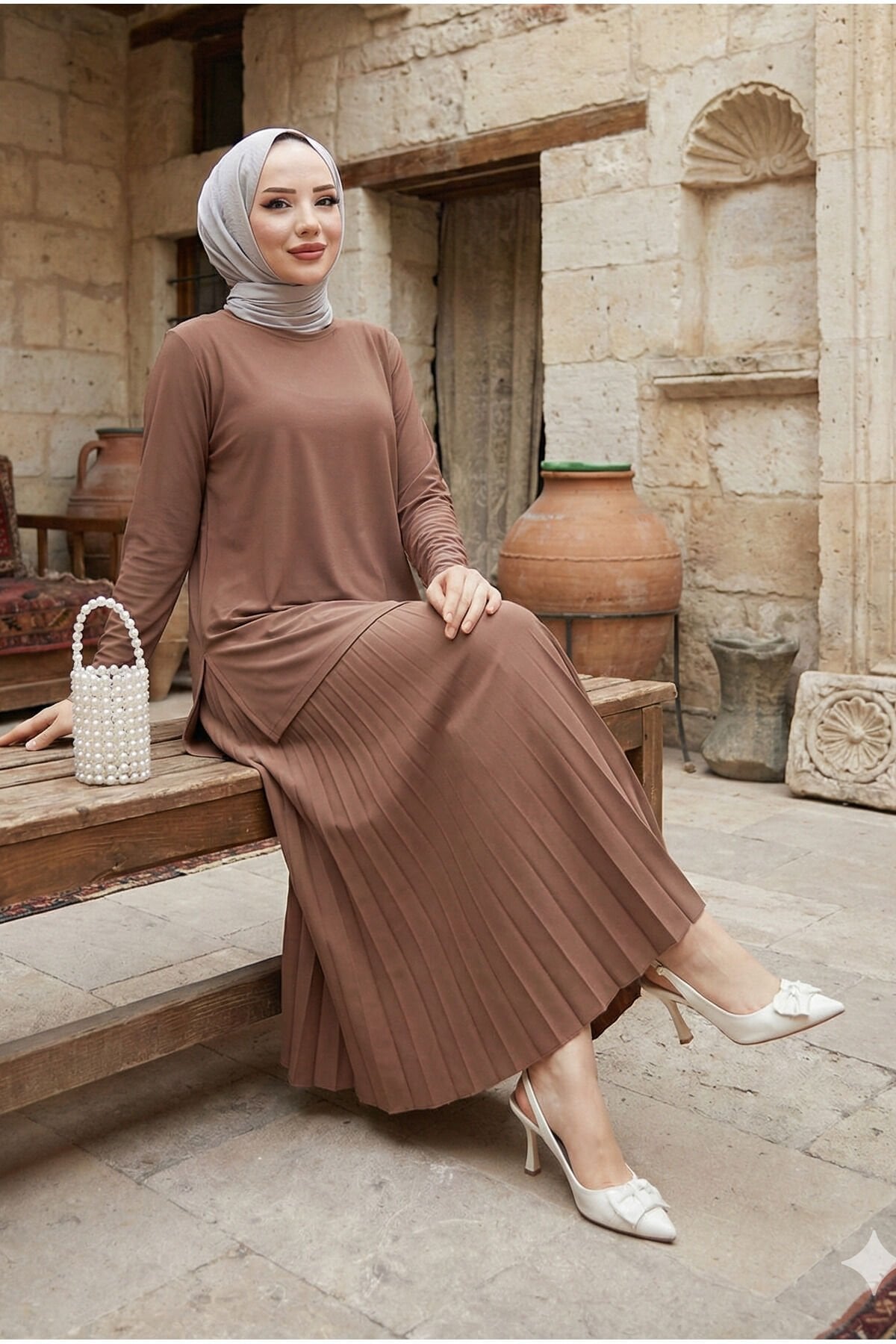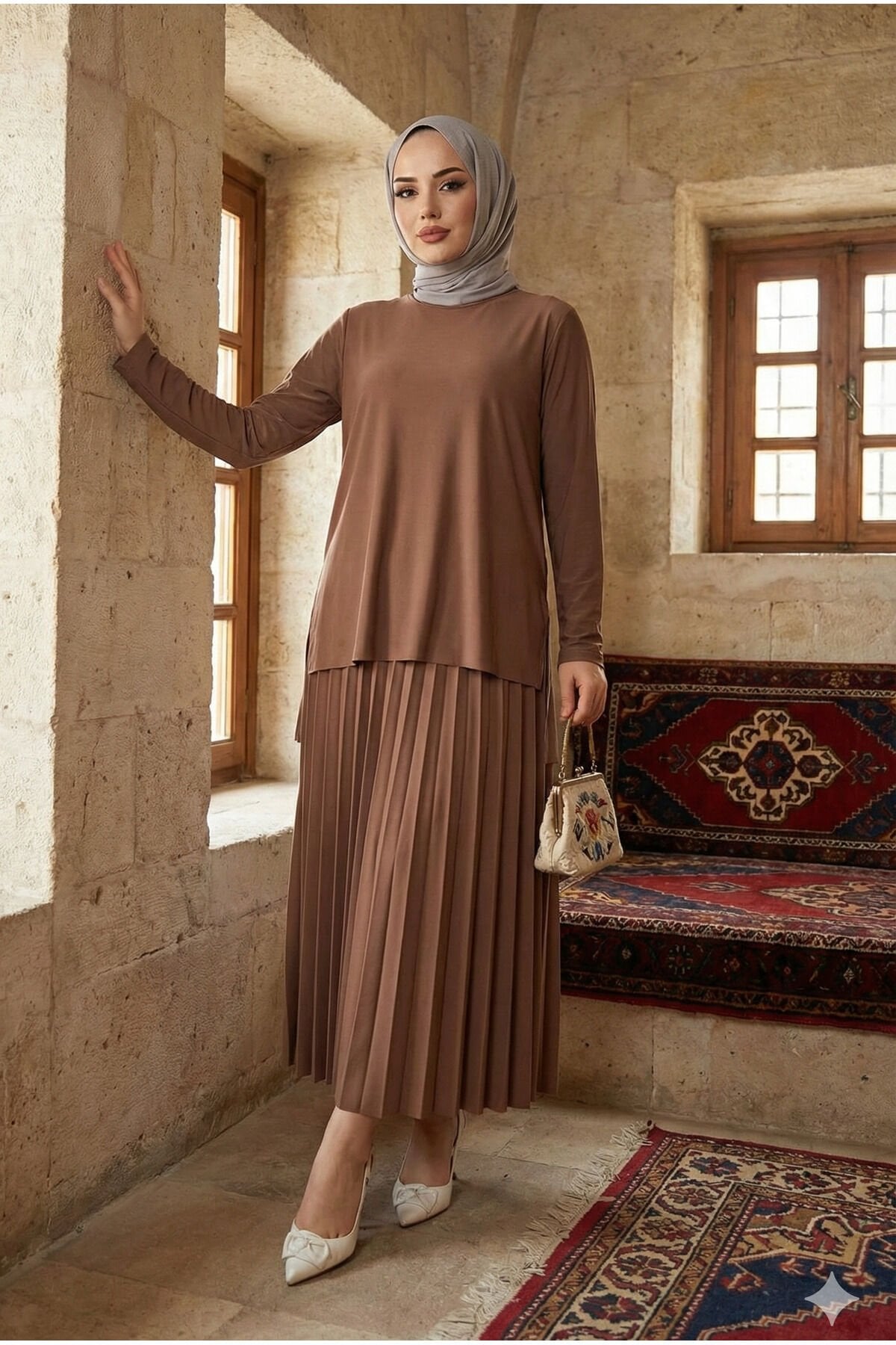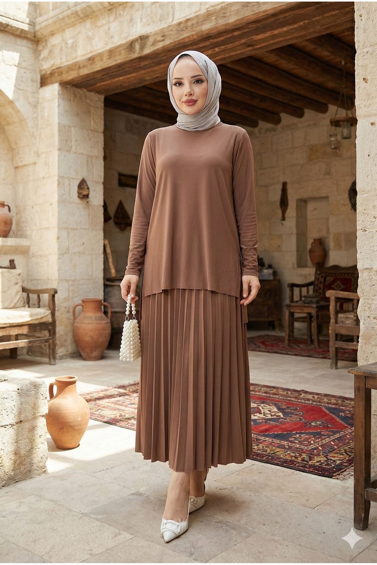 - Rahat kesimi ile günlük kullanım için ideal, büyük beden 2'li bluz etek piliseli tesettür takım.; - Yaz aylarının sıcak günlerinde serin tutan ince viskon karışımlı kumaşıyla konfor sunar.; - Lastikli bel tasarımı sayesinde vücut hatlarınıza mükemmel uyum sağlar ve rahat hareket etmenizi kolaylaştırır.; - Astarsız yapısıyla hafif ve nefes alabilen bir yapıya sahiptir; cilt dostudur.; - Düz deseniyle zamansız bir şıklık sunarken, her türlü aksesuarla kolayca kombinlenebilir.; - Normal bel yüksekliği ile hem şık hem de pratik bir kullanım vaat eder.; - Uzun boy tasarımı sayesinde bacakları olduğundan daha uzun gösterir ve zarif bir siluet çizer.; - Lastikli ek detayları sayesinde giyip çıkarması kolaydır; günlük kullanım için idealdir.; - Günlük ortamlarda rahatlıkla tercih edebileceğiniz bu takım, modaya uygun görünümün yanında konforu da ön planda tutar.; - Modamira tekstil imzasıyla zeytinburnu istanbul'da tasarlanmış ve üretilmiştir; kalite standartlarına sahiptir.; - Bisiklet yakası ile modern ve minimalist bir tarz sunarken, bluz ve etek kombinasyonuyla stil sahibi görünmenizi sağlar.; - Zümrüt yeşili rengiyle dikkat çekici ve canlı bir görünüm kazandırırken, her mevsim tercih edebileceğiniz renk seçeneği sunar.; - Kapamasız yapısı sayesinde basit ama şık bir görünüm elde edersiniz; ekstra aksesuar ihtiyacını ortadan kaldırır.- Rahat kesimi ile günlük kullanım için ideal, taba renkteki bu takım, yaz aylarında serin tutan ince viskon karışımlı kumaşıyla konfor sunar.; - Lastikli bel tasarımı sayesinde gün boyu rahat hareket etme imkanı sağlar ve şık bir görünüm kazandırır.; - Astarsız yapısıyla hafif ve nefes alabilen bir yapıya sahip olan bu takım, cepsiz tasarımıyla minimalist bir stil sergiler.; - Bisiklet yakası ve standart kol tipi ile modern ve zamansız bir tarz sunarken, bisiklet yaka detayı zarif bir dokunuş katmaktadır.; - 54 beden seçeneğiyle geniş beden aralığına hitap ederken, her vücut tipine uyum sağlayan regular fit kesimiyle rahatlık sağlar.; - Kapamasız tasarımı sayesinde pratik kullanım sunarken, beli lastikli olması kolay giyip çıkarmayı mümkün kılar.; - İki parçadan oluşan set; bluz ve etekten oluşarak kombin derdi olmadan şıklığı yakalamanız için idealdir.; - Modamira tekstil tarafından üretilen bu ürün, zeytinburnu istanbul'da bulunan üretim tesisinde özenle hazırlanmıştır.; - 30 derecede elde veya makinede tersten kısa programda yıkama önerisiyle bakımı kolaydır; böylece ürününüz uzun süre ilk günkü gibi kalacaktır.; - Günlük kullanım için uygundur; işten alışverişe her ortamda rahatlıkla tercih edebilirsiniz.