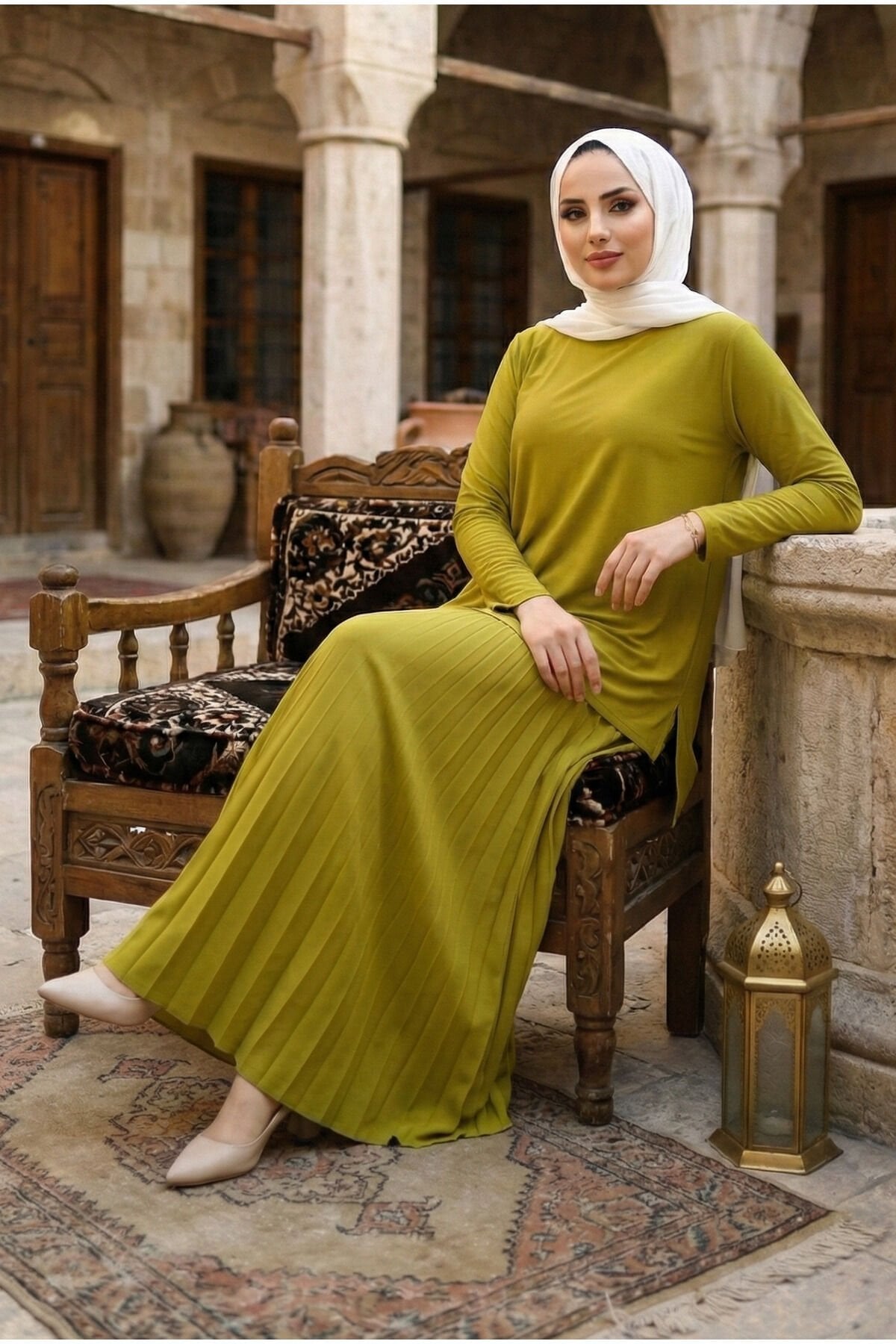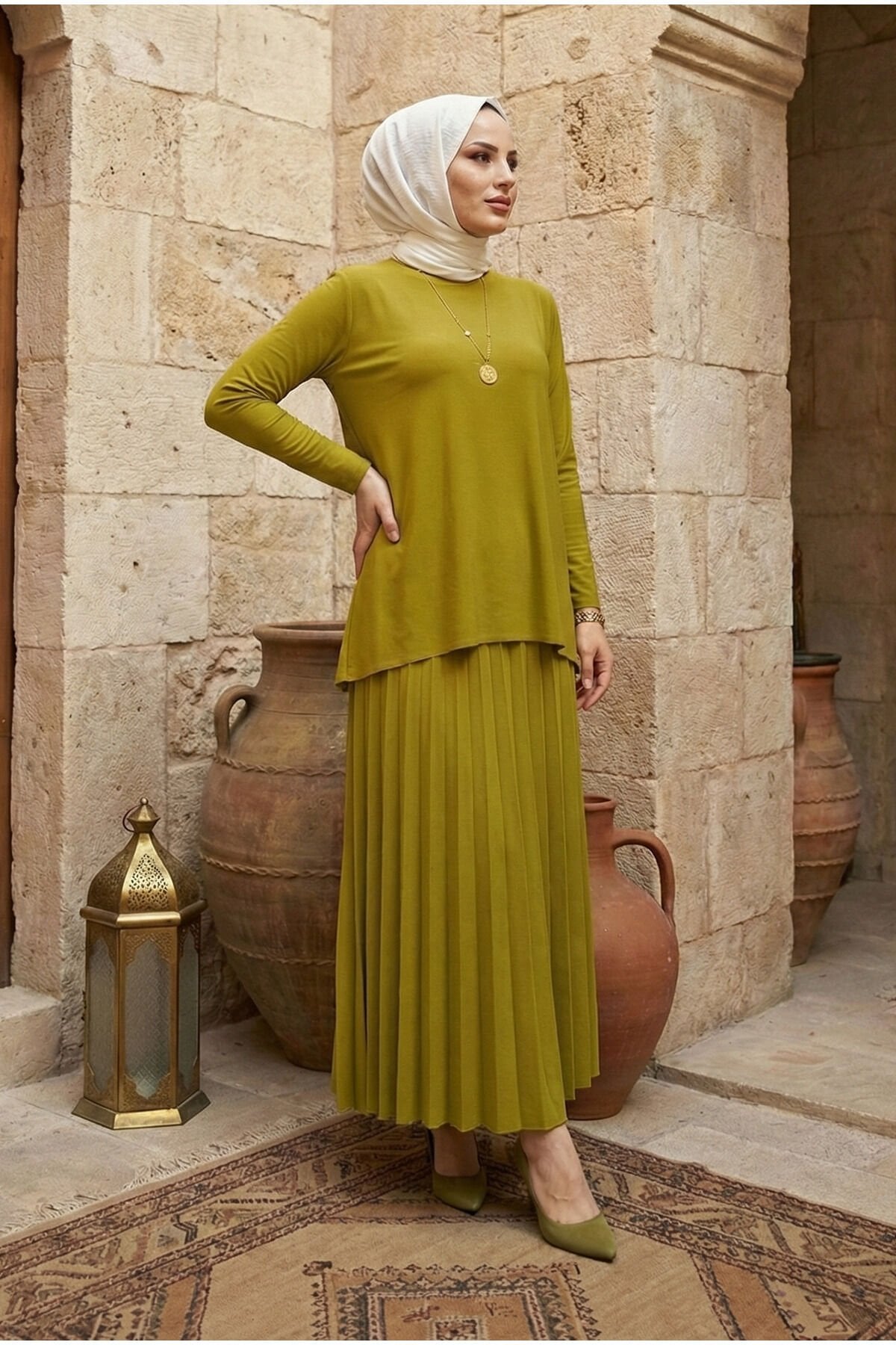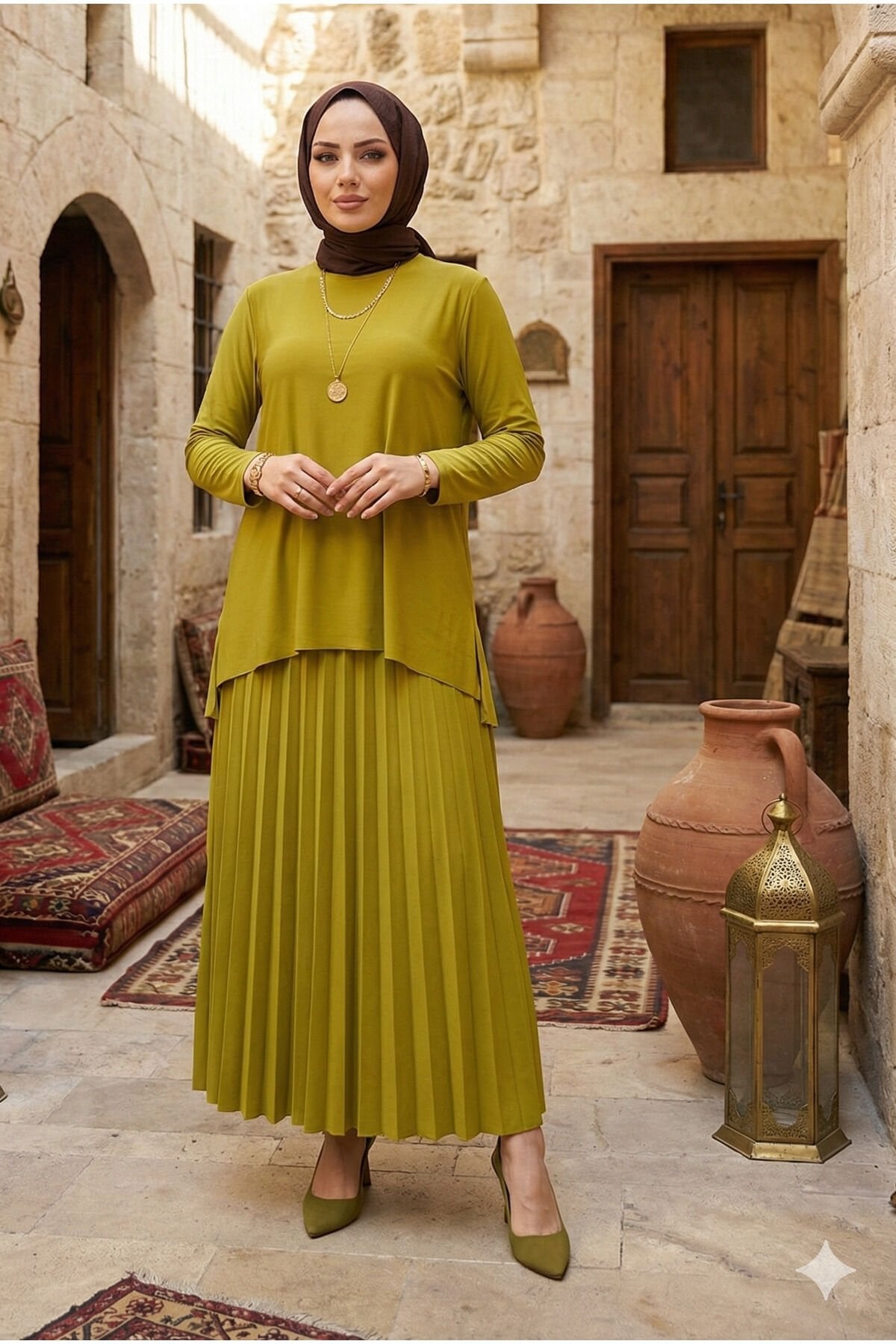 Kadın Sandy Çağla Yeşil Büyük Beden 2li Bluz Etek Piliseli Ikili Tesettür Etekli Takım Yağ Yeşi̇l - 50