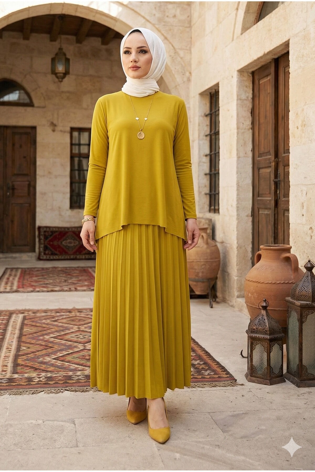 - Rahat kesimi ile günlük kullanım için ideal, büyük beden 2'li bluz etek piliseli tesettür takım.; - Yaz aylarının sıcak günlerinde serin tutan ince viskon karışımlı kumaşıyla konfor sunar.; - Lastikli bel tasarımı sayesinde vücut hatlarınıza mükemmel uyum sağlar ve rahat hareket etmenizi kolaylaştırır.; - Astarsız yapısıyla hafif ve nefes alabilen bir yapıya sahiptir; cilt dostudur.; - Düz deseniyle zamansız bir şıklık sunarken, her türlü aksesuarla kolayca kombinlenebilir.; - Normal bel yüksekliği ile hem şık hem de pratik bir kullanım vaat eder.; - Uzun boy tasarımı sayesinde bacakları olduğundan daha uzun gösterir ve zarif bir siluet çizer.; - Lastikli ek detayları sayesinde giyip çıkarması kolaydır; günlük kullanım için idealdir.; - Günlük ortamlarda rahatlıkla tercih edebileceğiniz bu takım, modaya uygun görünümün yanında konforu da ön planda tutar.; - Modamira tekstil imzasıyla zeytinburnu istanbul'da tasarlanmış ve üretilmiştir; kalite standartlarına sahiptir.; - Bisiklet yakası ile modern ve minimalist bir tarz sunarken, bluz ve etek kombinasyonuyla stil sahibi görünmenizi sağlar.; - Zümrüt yeşili rengiyle dikkat çekici ve canlı bir görünüm kazandırırken, her mevsim tercih edebileceğiniz renk seçeneği sunar.; - Kapamasız yapısı sayesinde basit ama şık bir görünüm elde edersiniz; ekstra aksesuar ihtiyacını ortadan kaldırır.- Polyester ve likra karışımı kumaştan üretilmiş olup, esnek yapısıyla rahat bir kullanım sunar.; - Bisiklet yaka tasarımı ile sade ve şık bir görünüm sağlar.; - Düz deseni sayesinde kolayca kombinlenebilir ve her ortamda rahatlıkla tercih edilebilir.; - Tek parça olarak sunulan bu takım, pratik bir giyim seçeneği oluşturur.; - Cepsiz tasarımı ile günlük kullanım için idealdir; eşyalarınızı yanınızda taşımanız için ekstra ceplere ihtiyaç duymazsınız.; - Kapamasız yapısı sayesinde kolayca giyilip çıkartılabilir ve konforlu bir deneyim sunar.; - Yetişkinler için uygun olan bu takım, geniş yaş aralığına hitap eder.; - Astarsız yapısıyla gün boyu rahatlık sağlar ve ekstra konfor sunar.; - Tesettür giyim koleksiyonuna özel olarak tasarlanmıştır; şıklığı ve rahatlığı bir arada arayanlar için idealdir.; - Regular kalıp ile vücut hatlarını saran ancak sıkmayan bir yapıya sahiptir.; - Cool & Comfort Persona ile modern ve trend bir görünüm kazandırır.; - Uzun boyu sayesinde bacakları olduğundan daha uzun gösterirken, regular silueti her vücut tipine uyum sağlar.; - Örme kumaşı sayesinde esneklik ve dayanıklılık sunarken, orta kalınlığı mevsim geçişlerinde ideal konforu sağlar.; - Tunik etek kombini ile günlük kullanım için mükemmel bir seçenek olup, rahatlığı ön planda tutar.; - Günlük ortamlarda rahatlıkla tercih edilebilecek tarzda tasarlanmıştır.; - Sandy dokuma tipi ile yumuşak dokunuşu hissedilirken, dayanıklılığı arttırır.