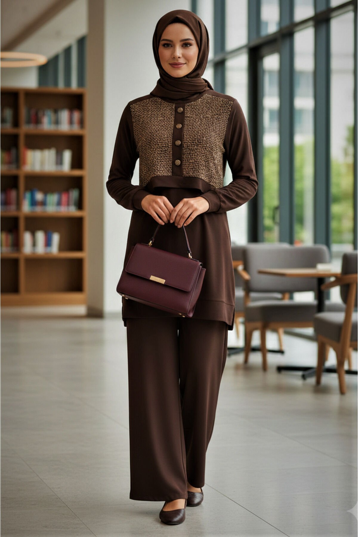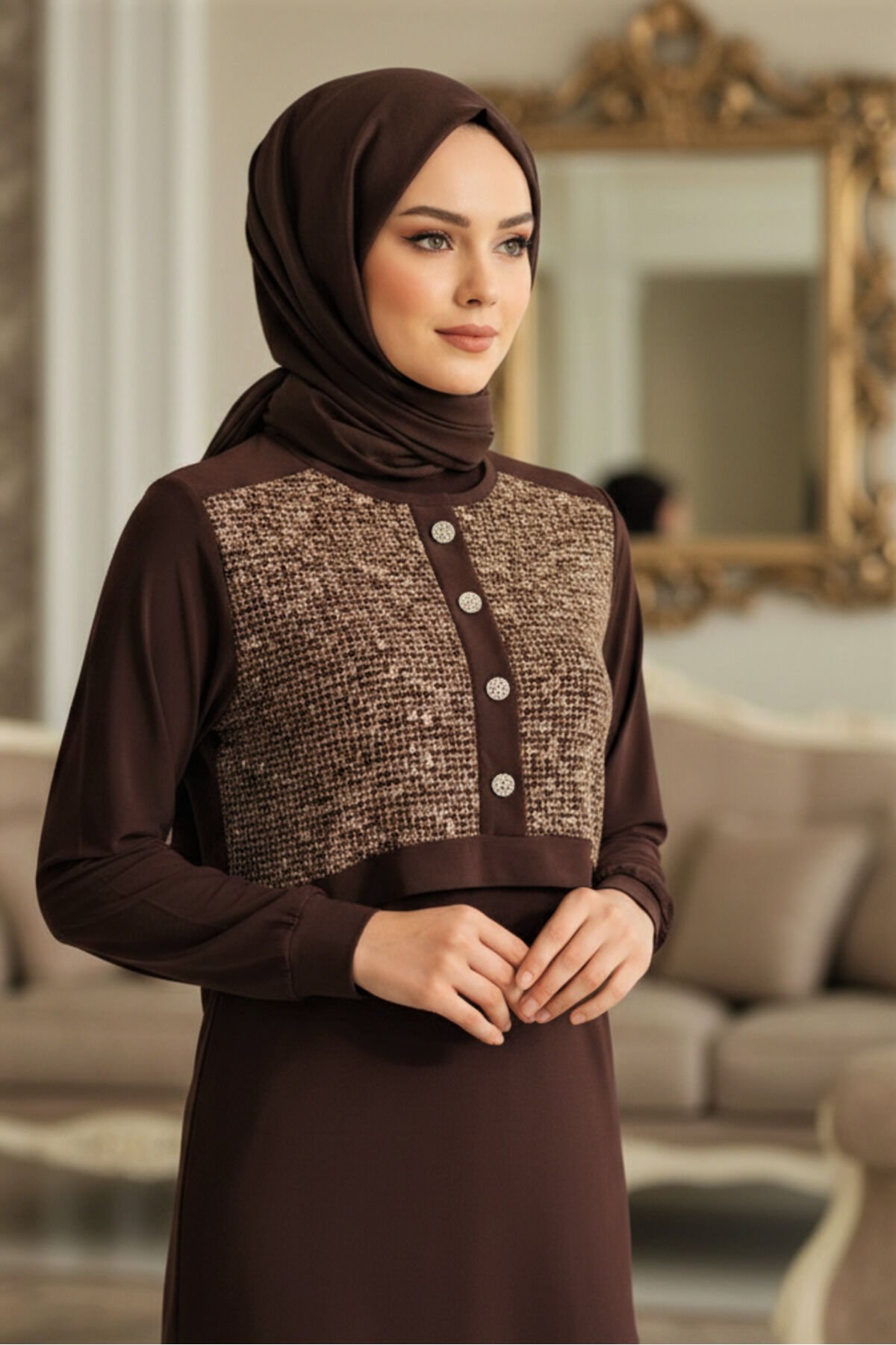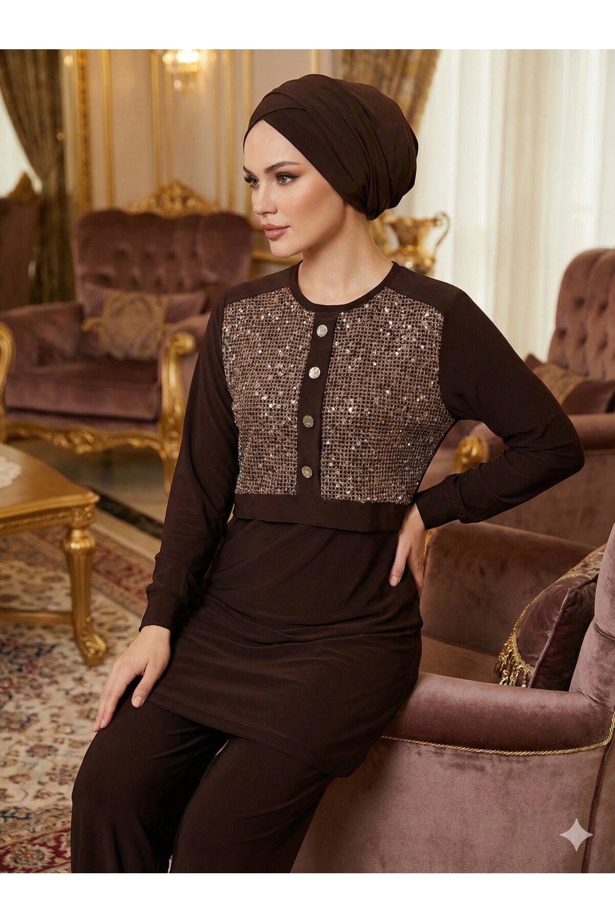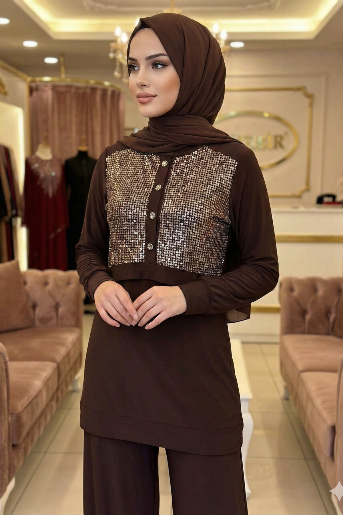 Kadın Sandy Kahve Özel Tarz Davet Tunik Pantolon Pul File Detaylı Tesettür İkili Pantolonlu Takım Kahverengi - 44