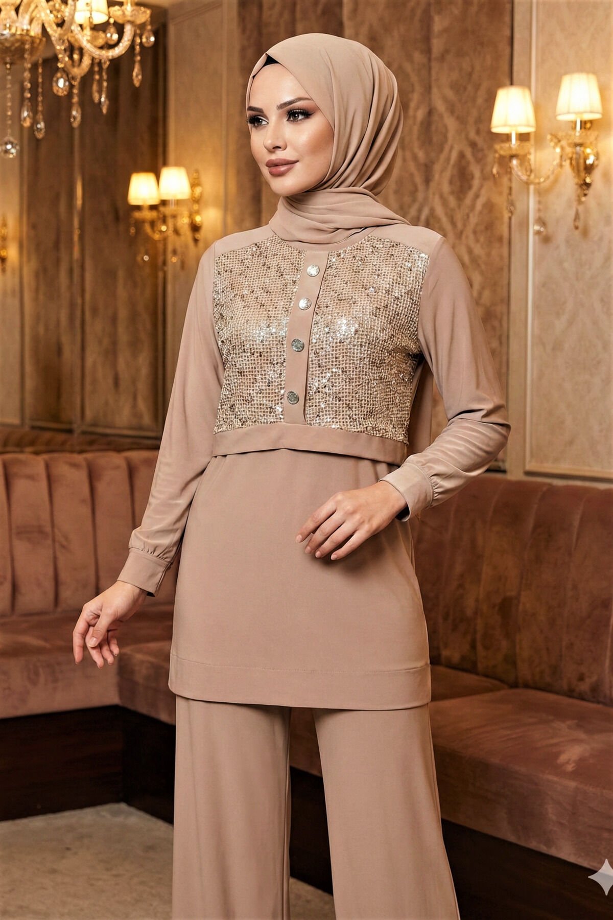 Kadın Sandy Kahve Özel Tarz Davet Tunik Pantolon Pul File Detaylı Tesettür İkili Pantolonlu Takım Taş - 48