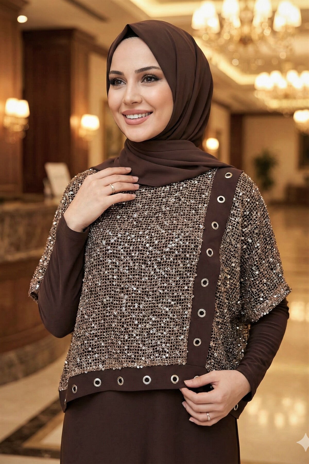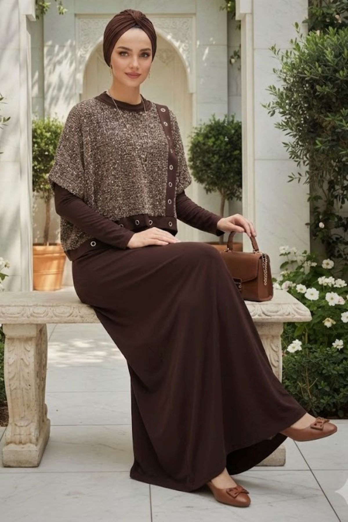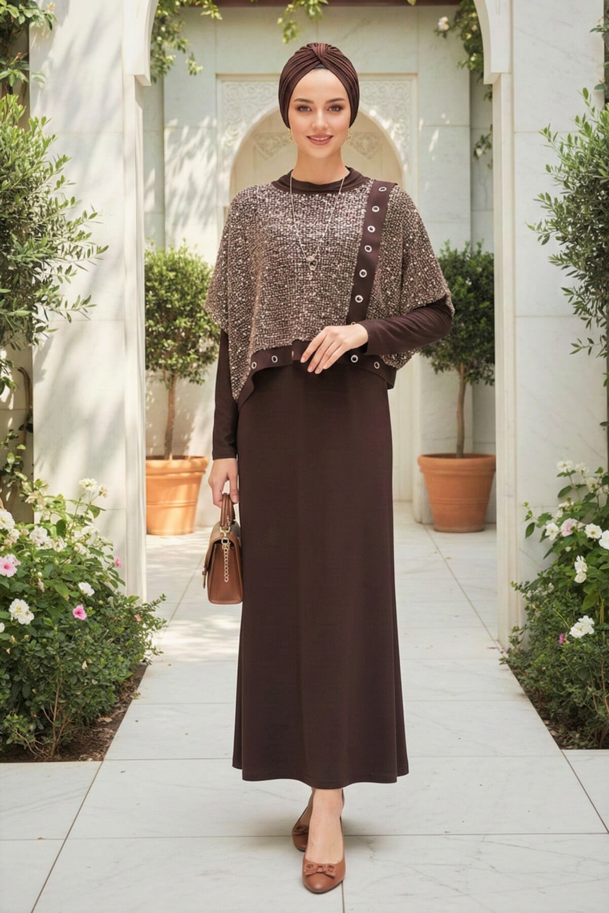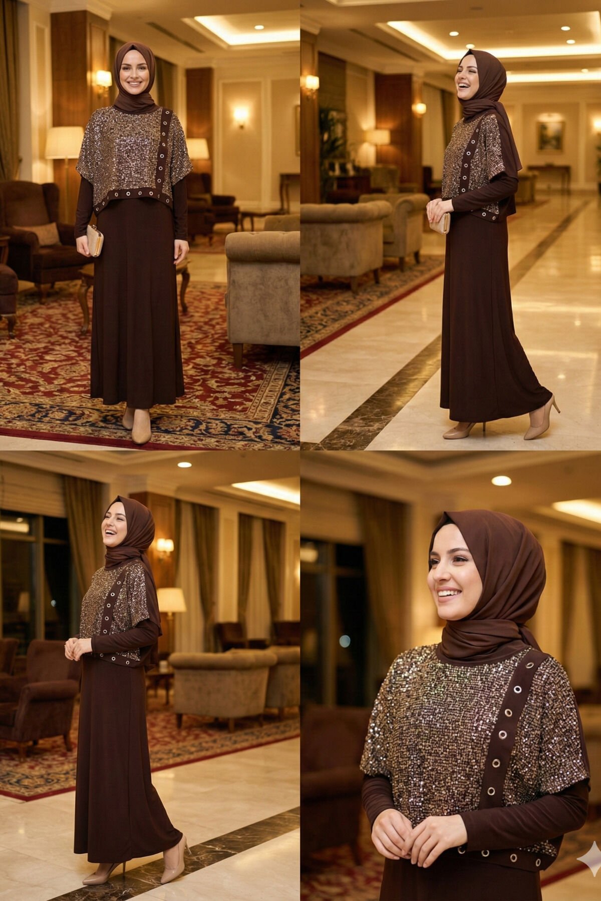 Kadın sandy Kahve Pul Payet Detaylı Bolorolu Tarz Özel Tasarım Davet İkili Tesettür Boydan Elbise Kahverengi - 46