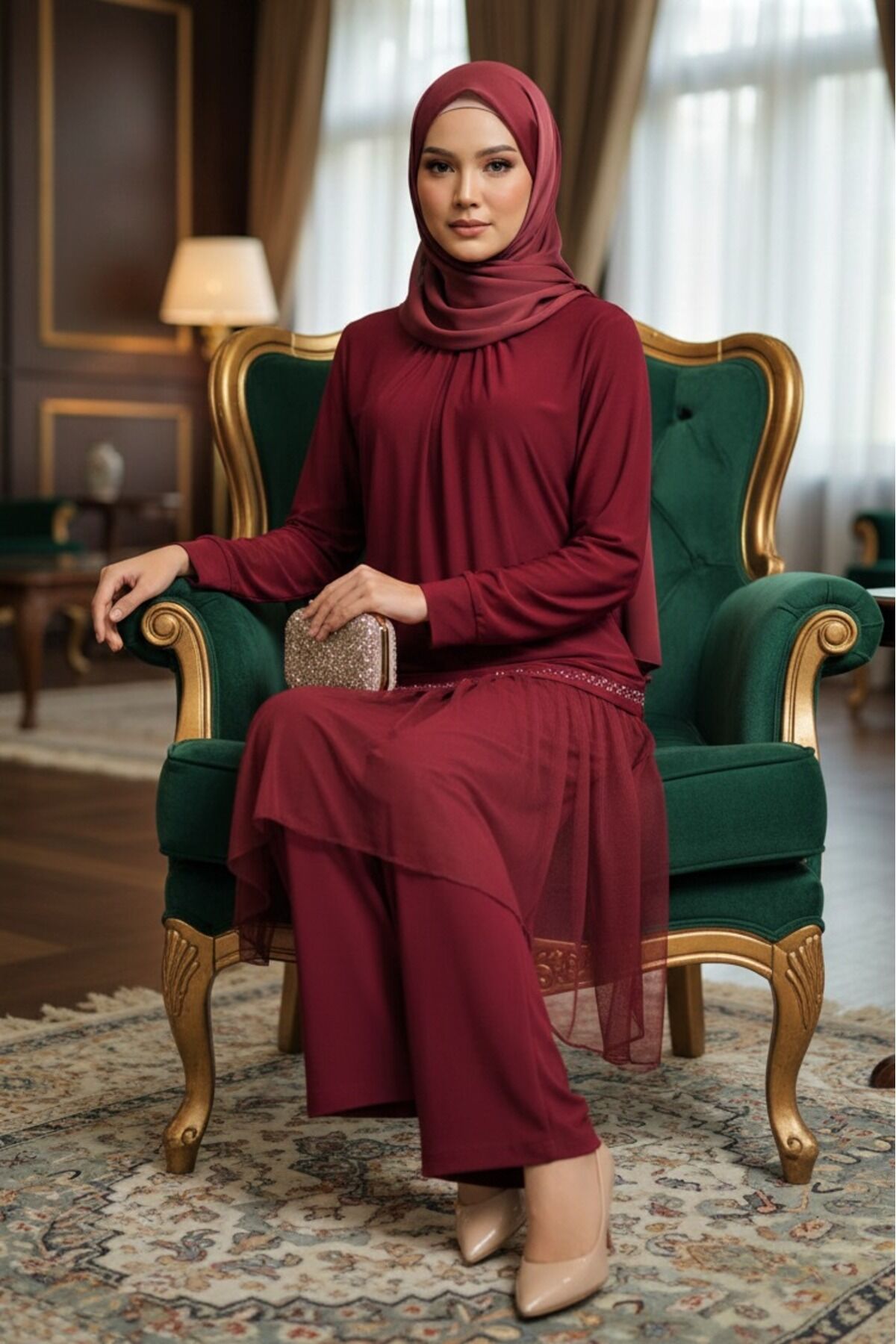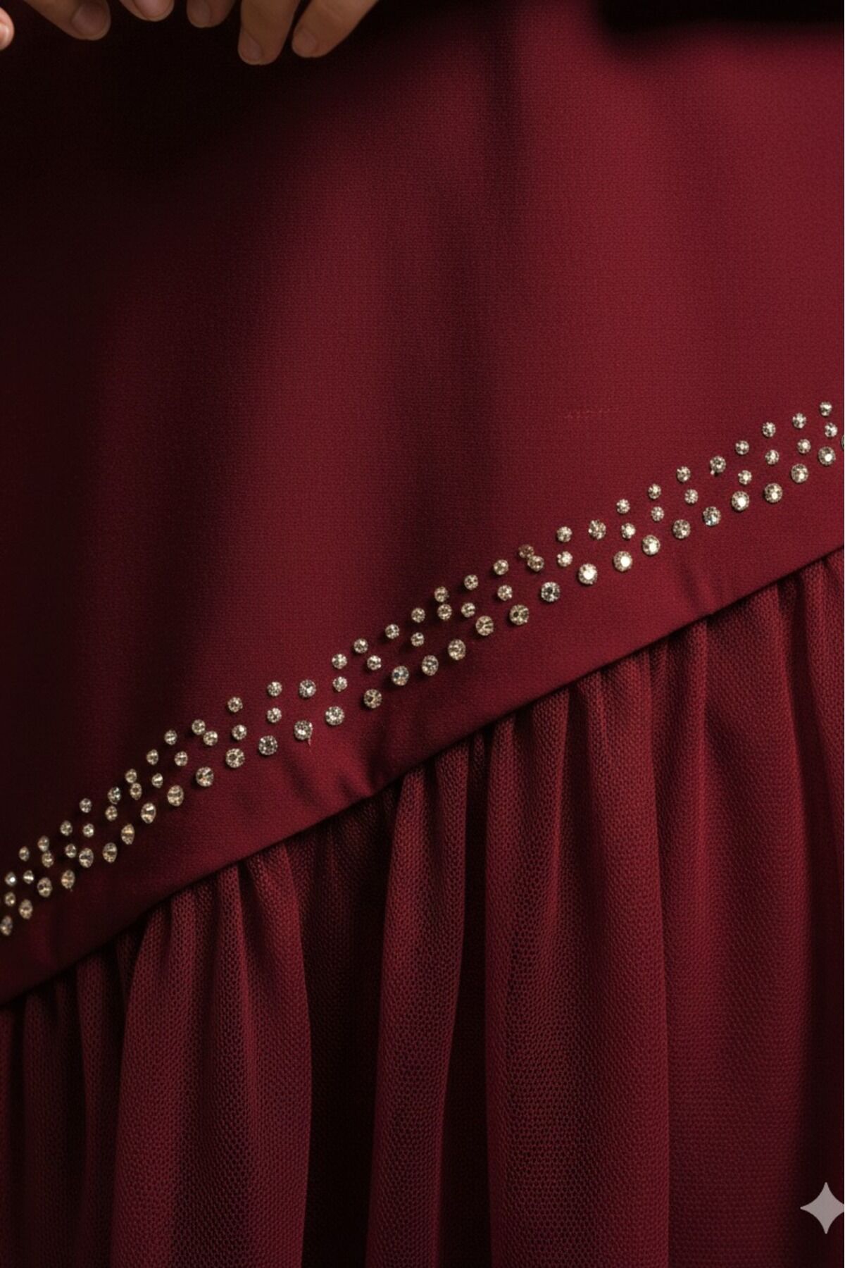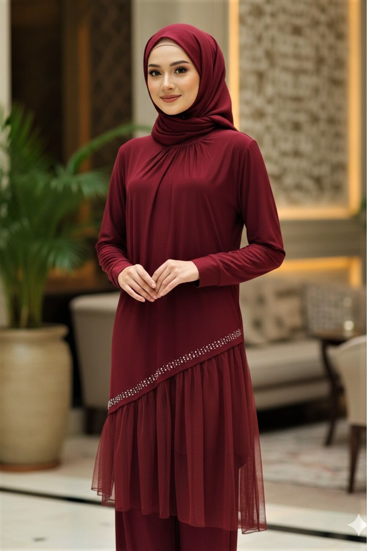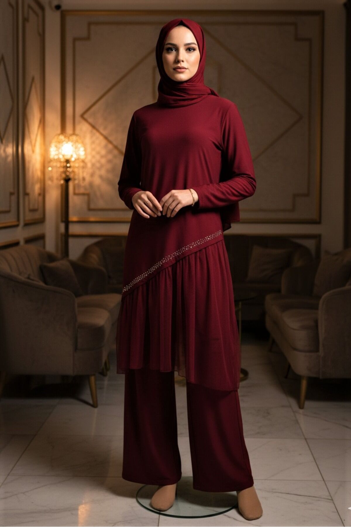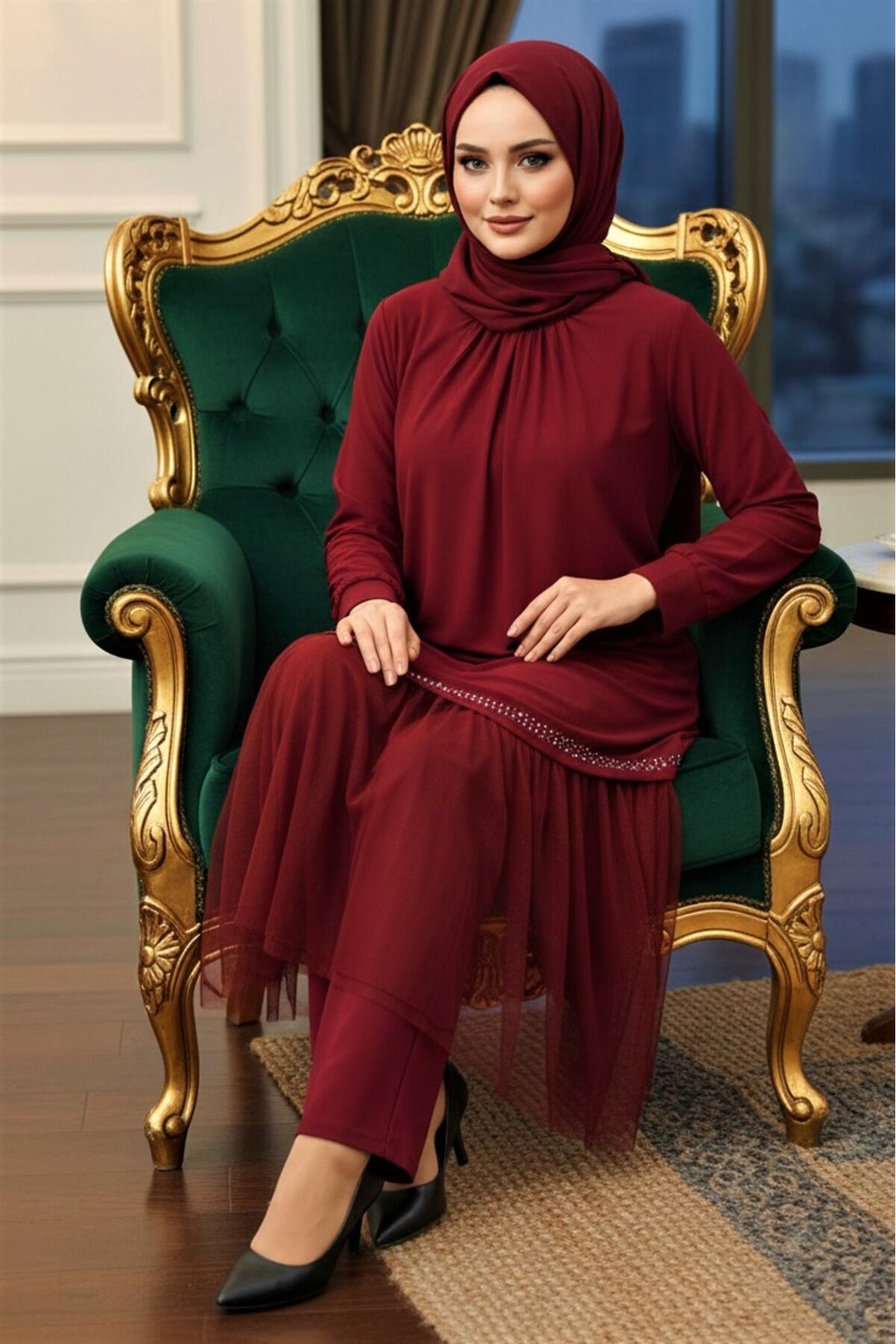 Kadın Sandy Kahve Tunik Tül ve Taş Detaylı Tarz Davet Özel Tasarım İkili Tesettür Pantolonlu Takım Bordo - 42