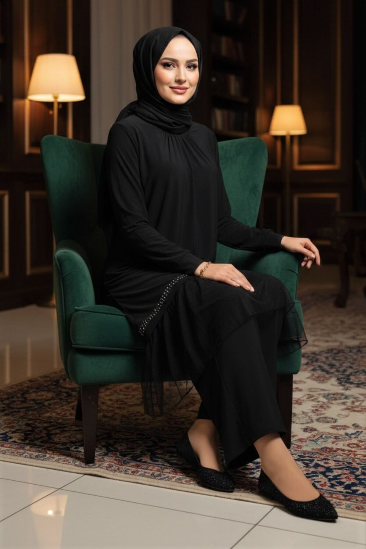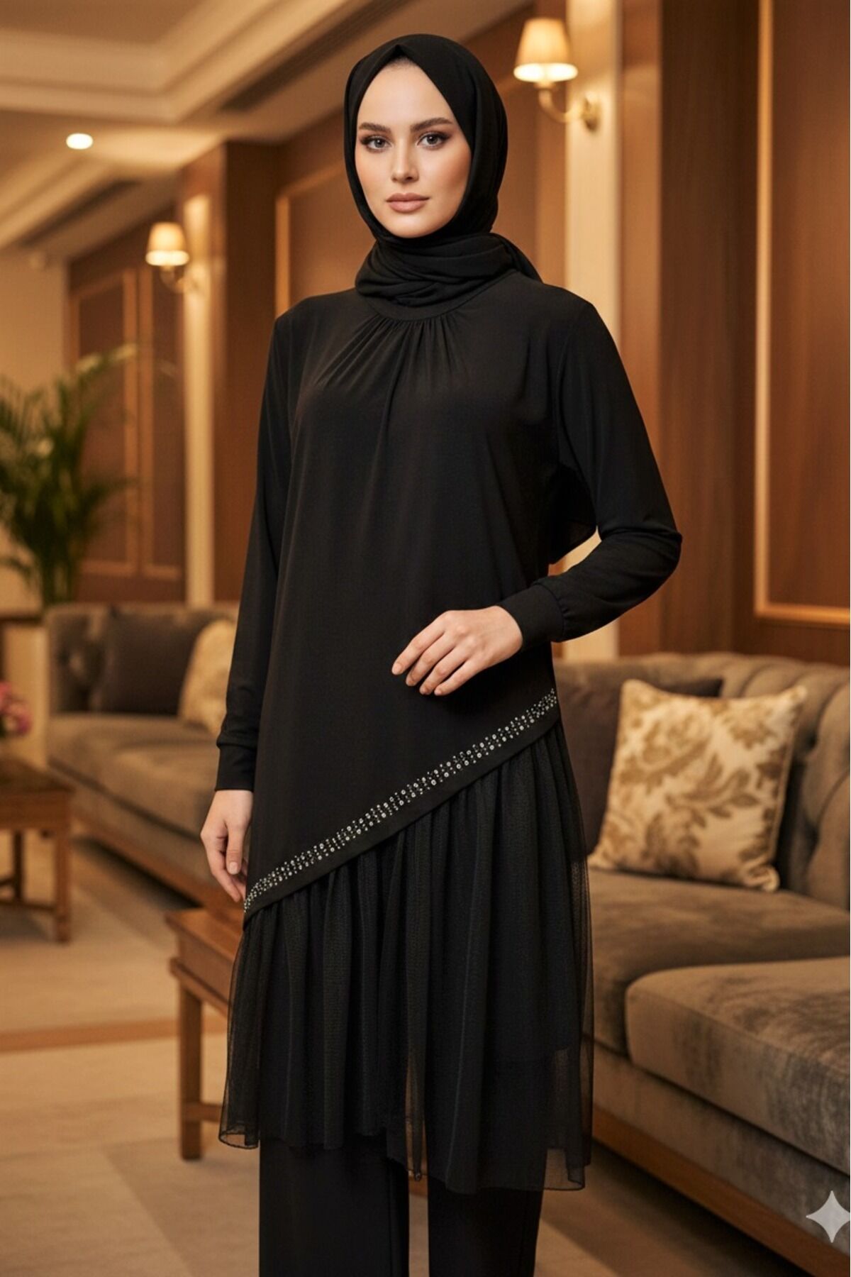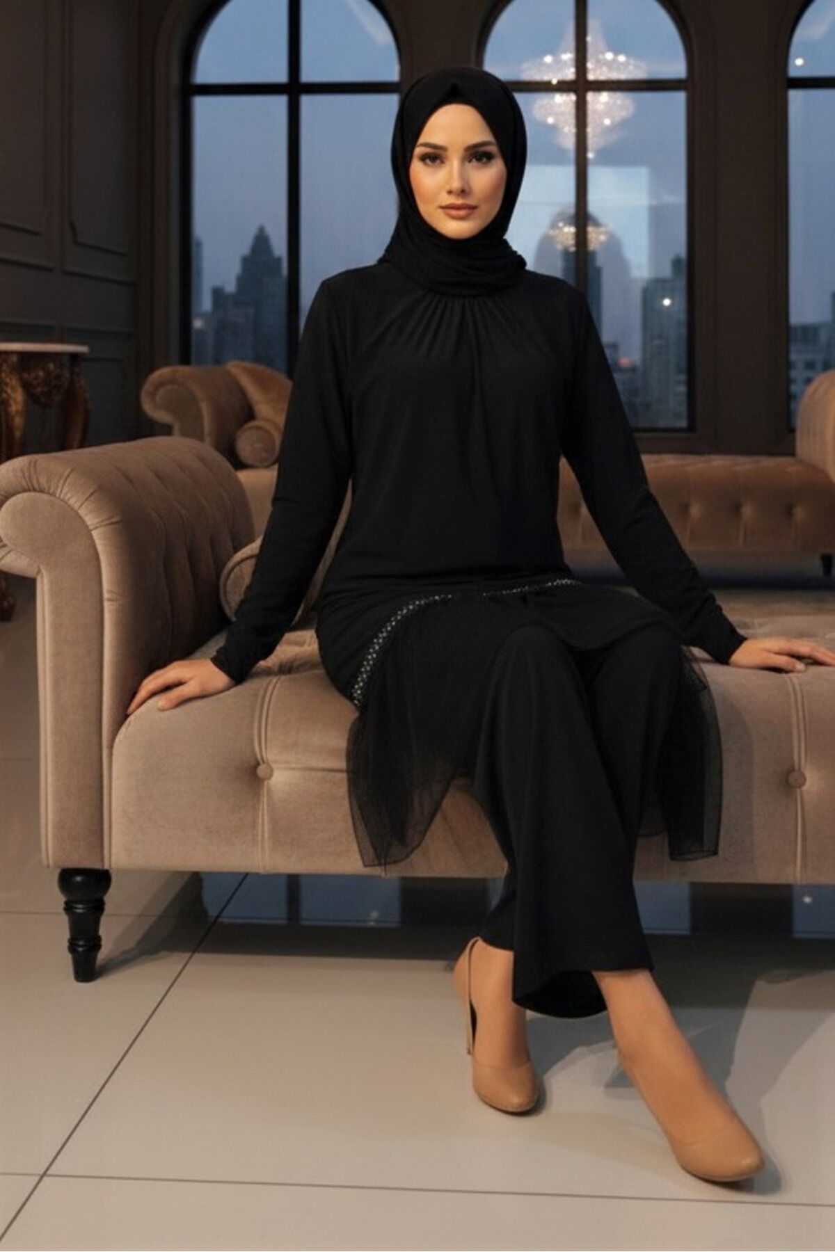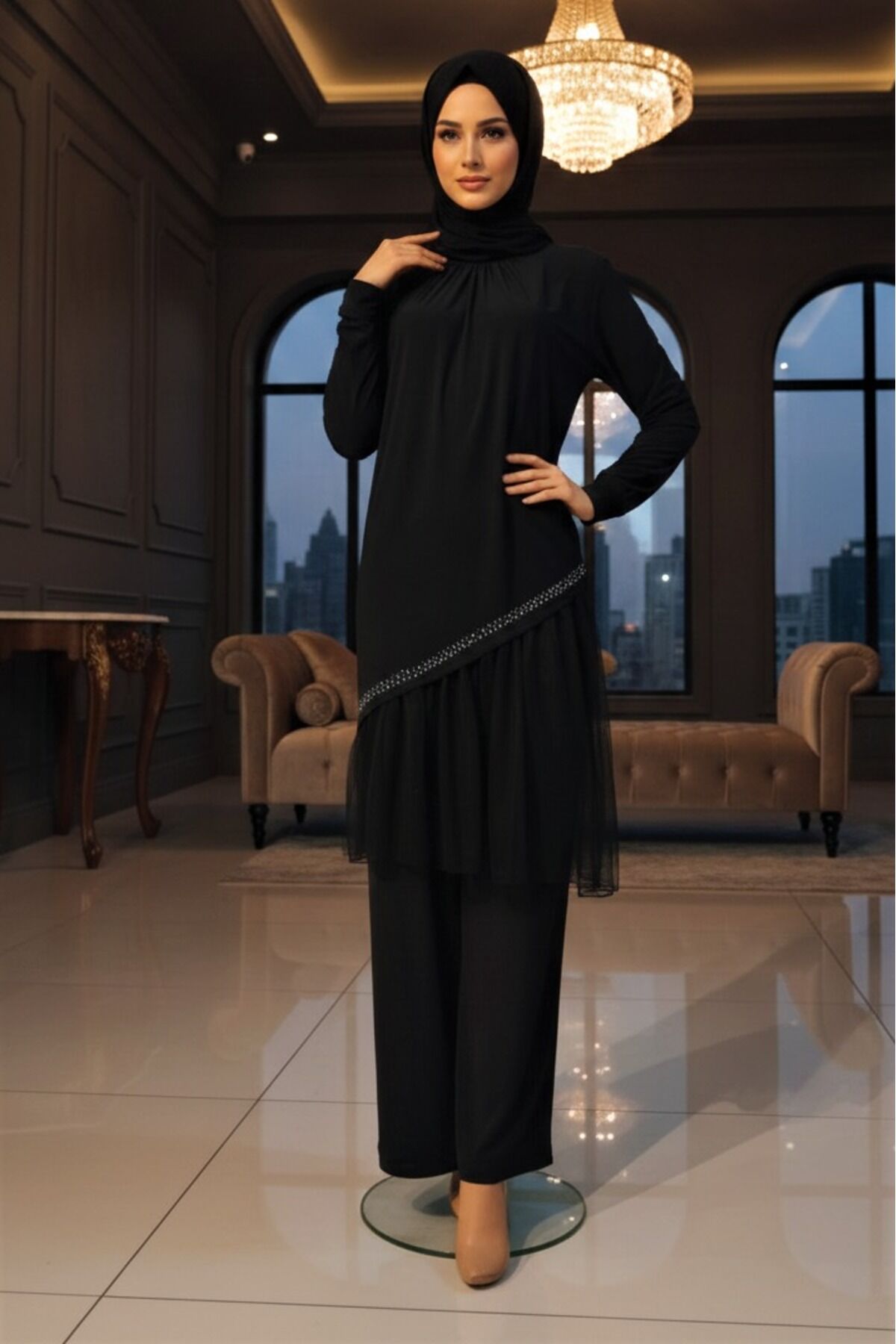 Kadın Sandy Kahve Tunik Tül ve Taş Detaylı Tarz Davet Özel Tasarım İkili Tesettür Pantolonlu Takım Si̇yah - 42