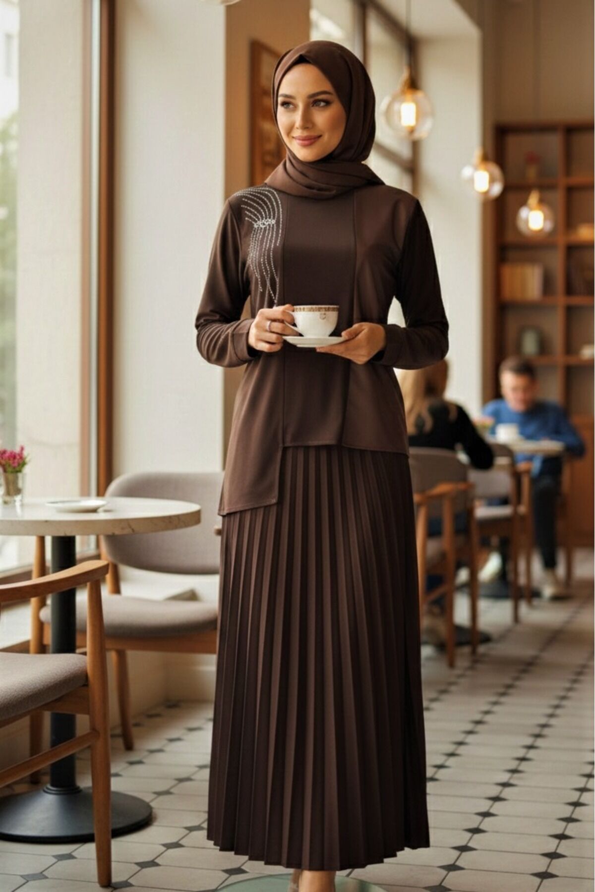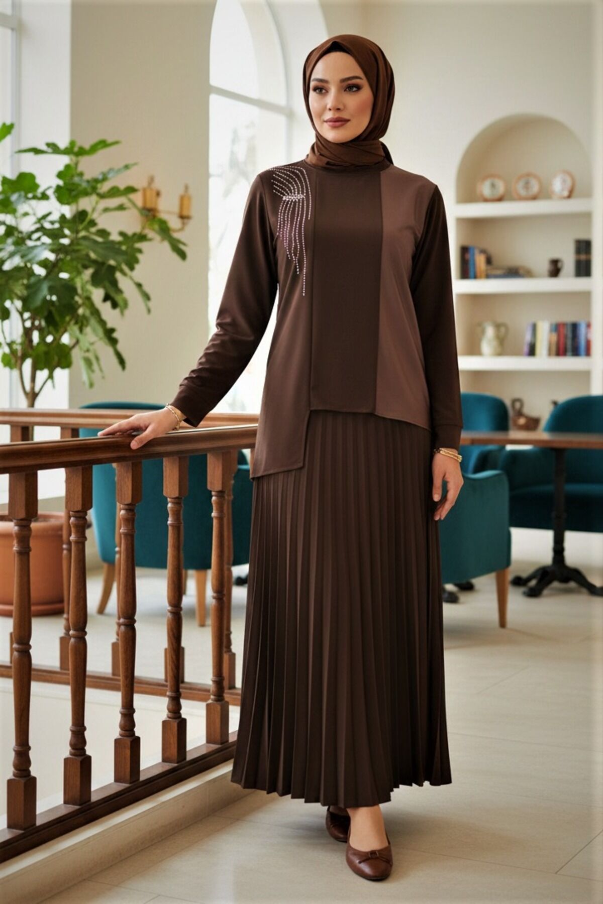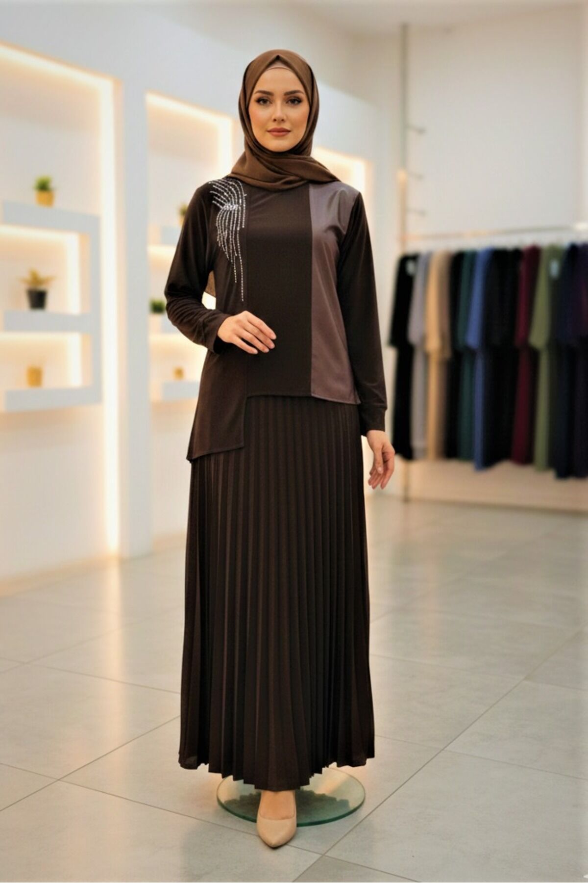 Kadın Sandy Kahverengi Önü Deri ve Taş detaylı Tarz Davet Özel Tasarım Piliseli İkili Etekli Takım Kahve - 48