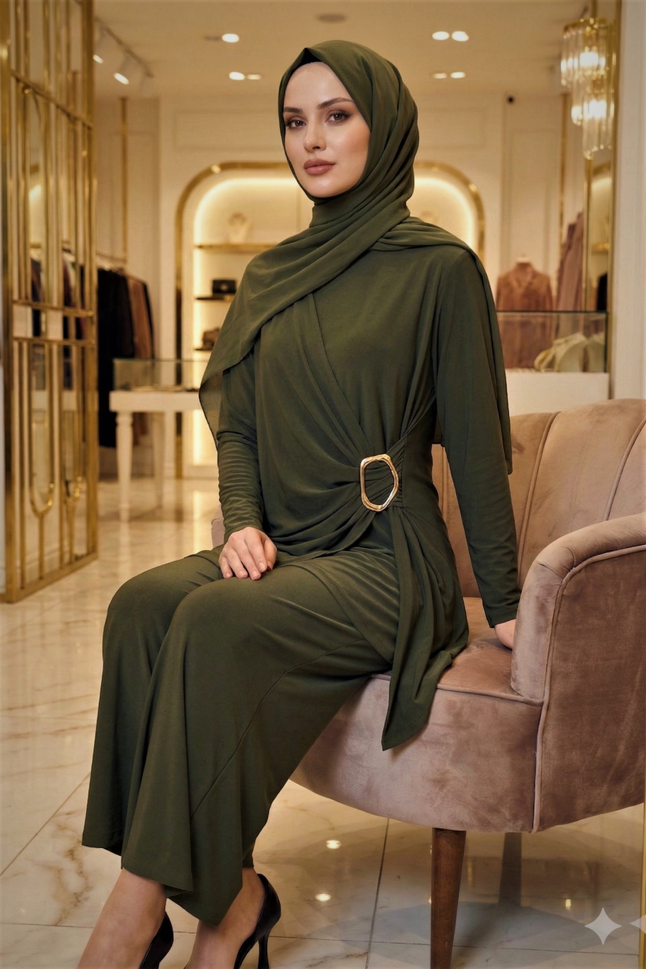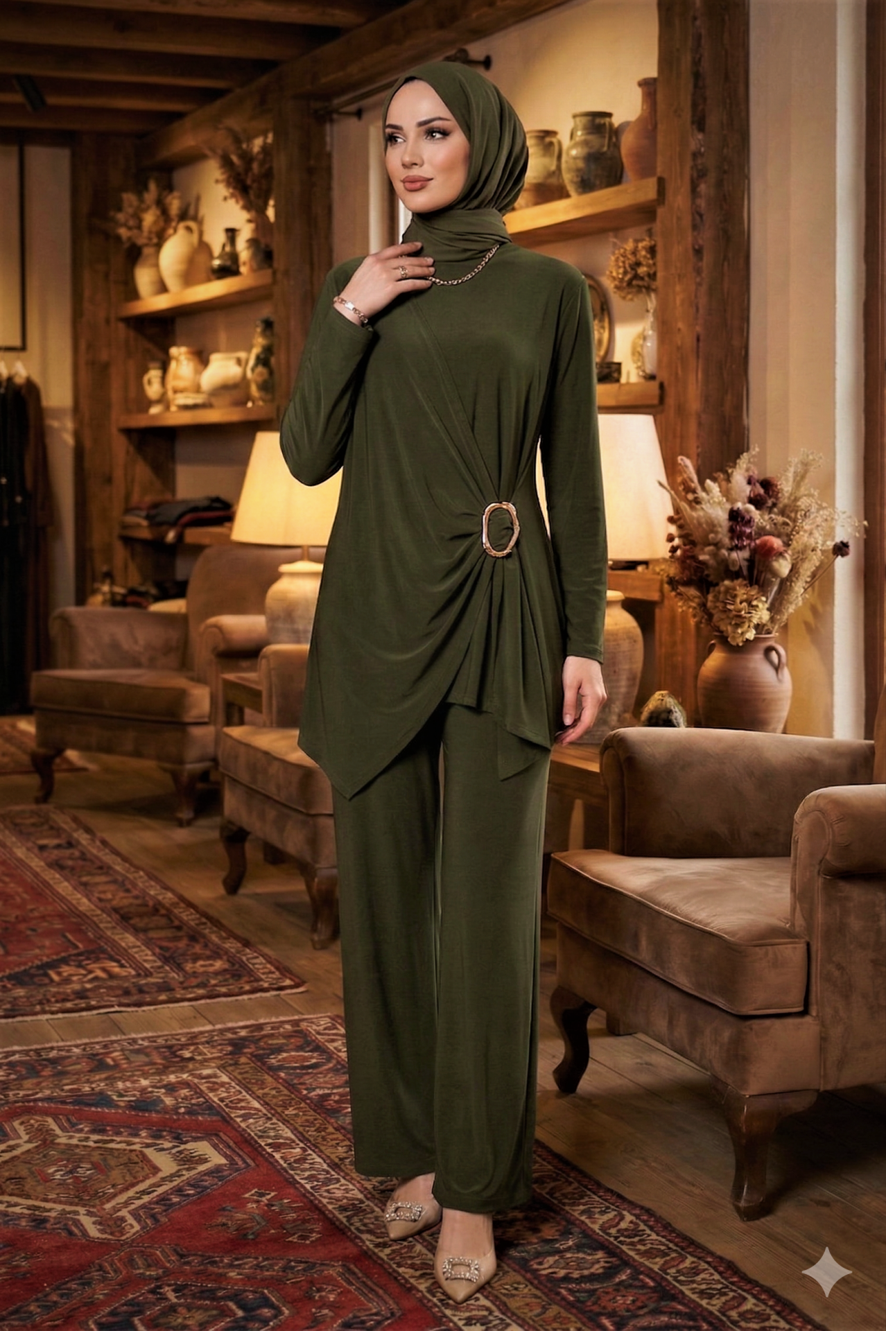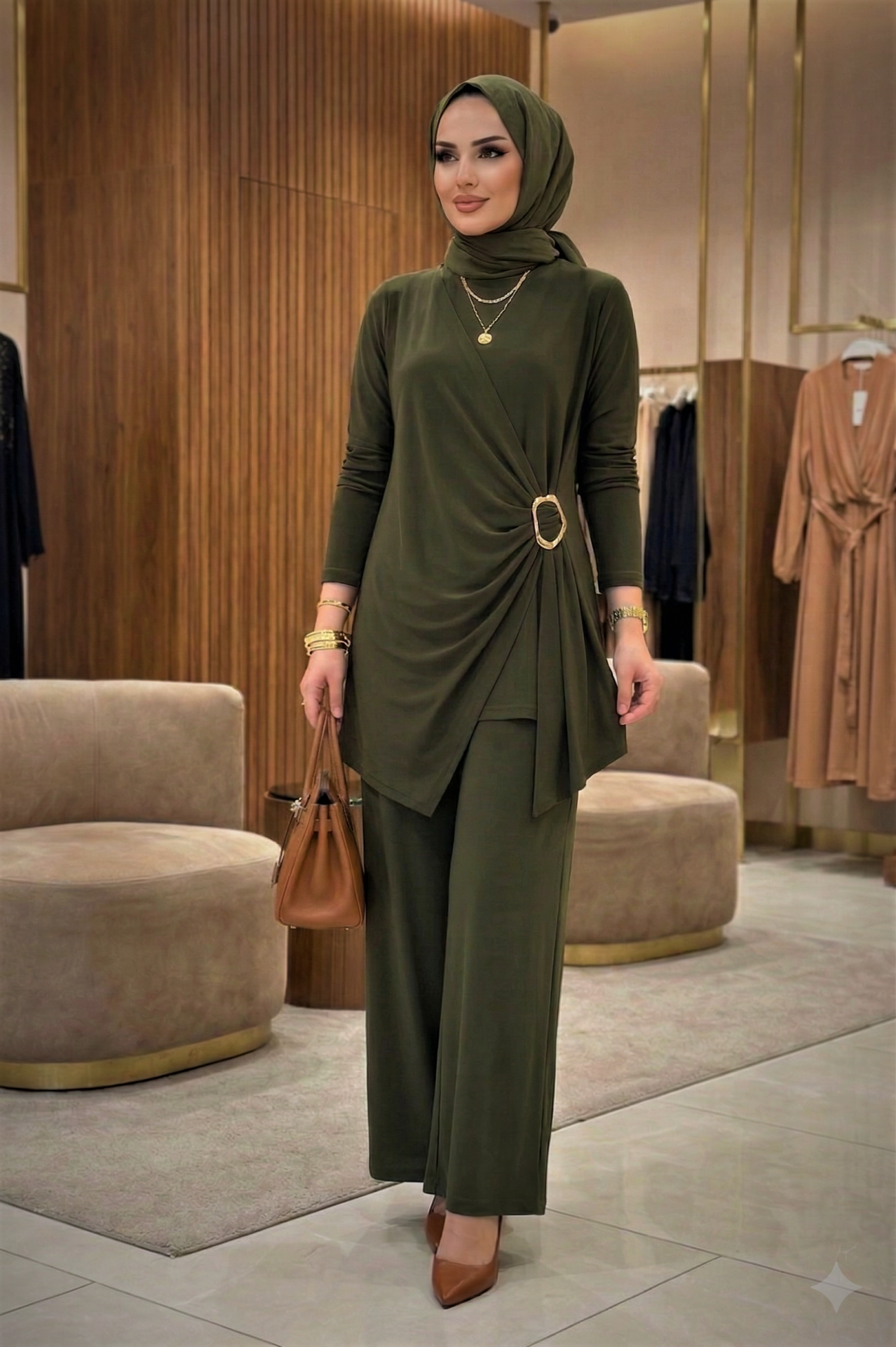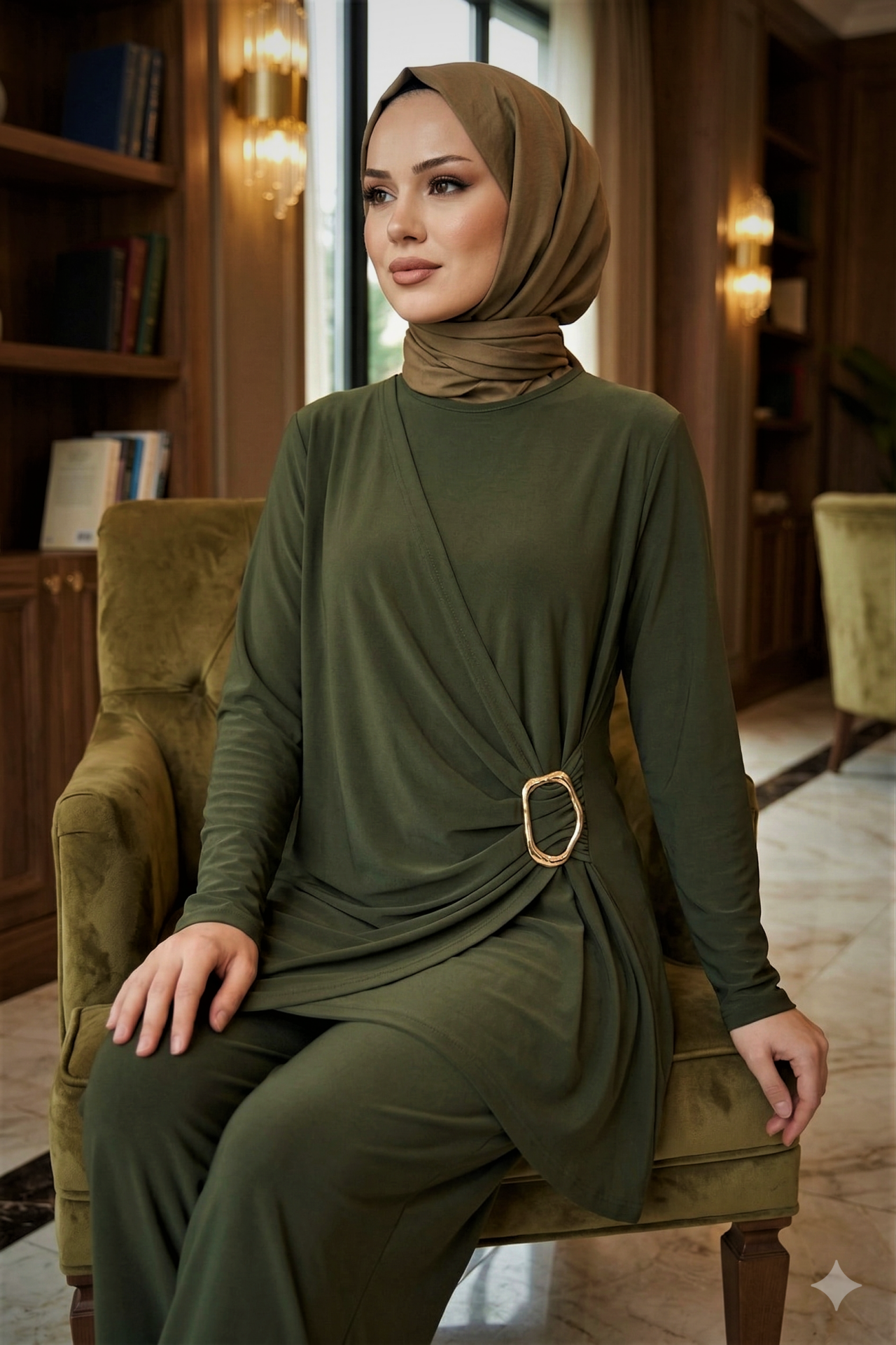 Kadın Sandy Kahverengi Özel Tasarım Yandan Tokalı Bluz Pantolon Tesettür İkili Pantolonlu Takım Haki - 44