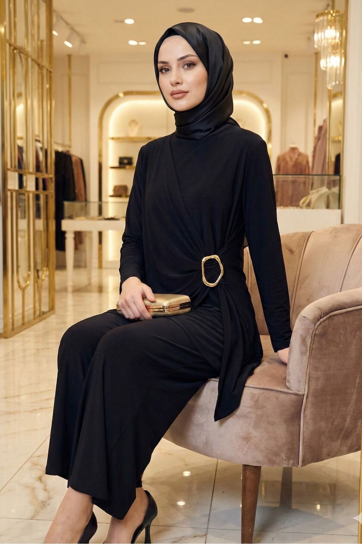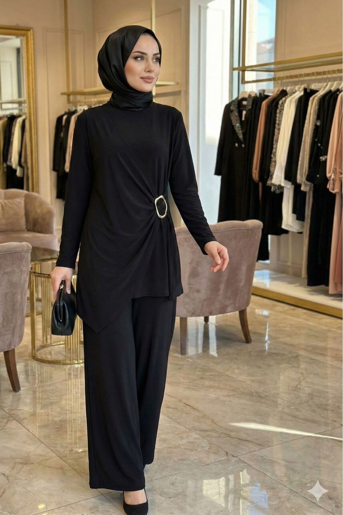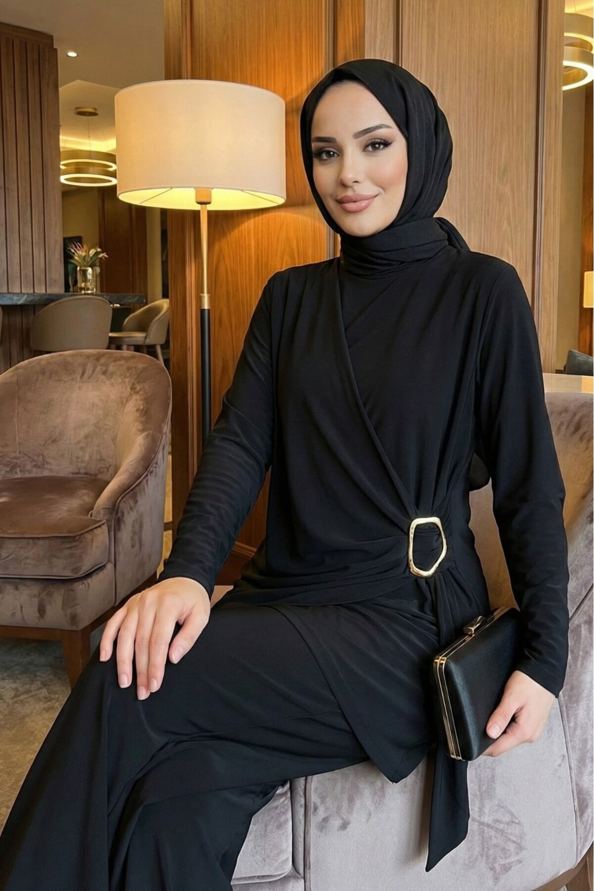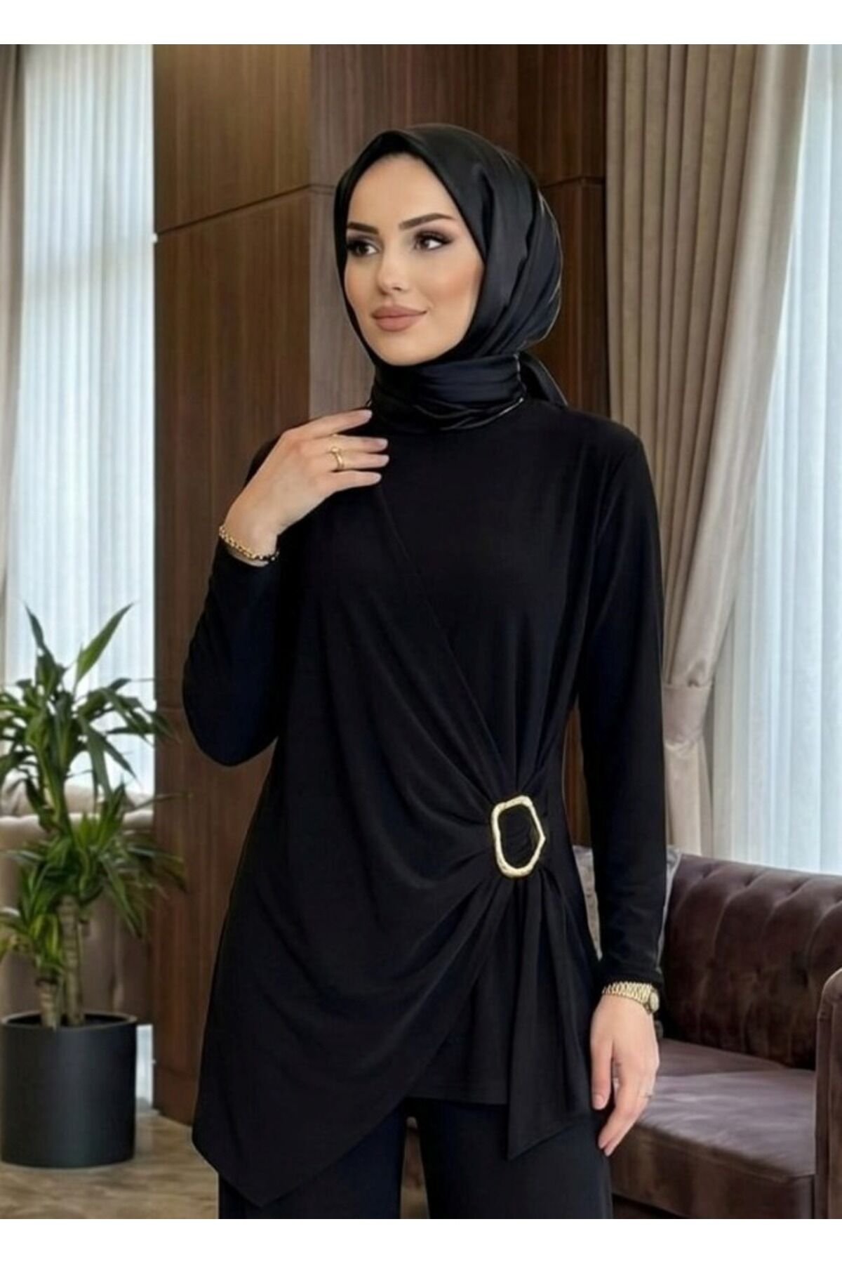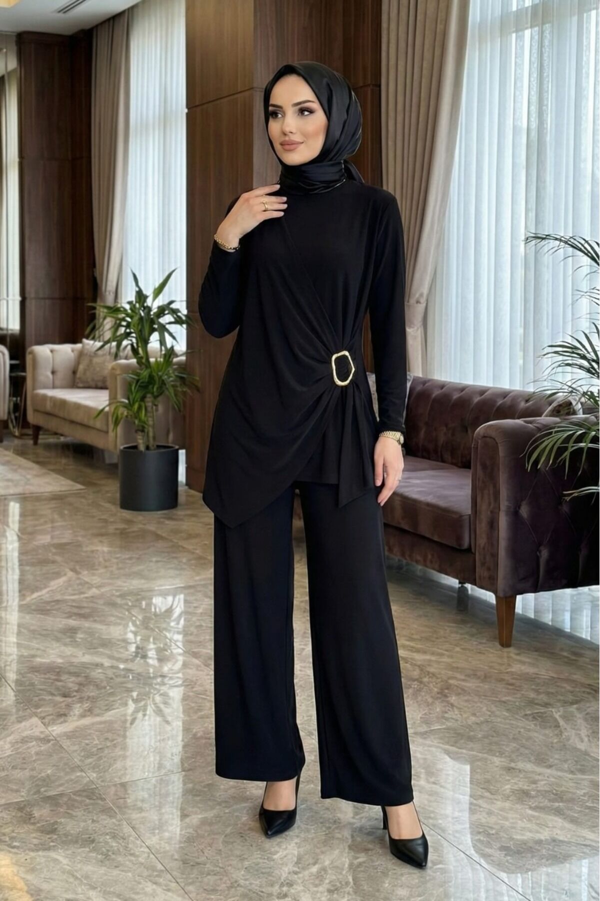 Kadın Sandy Kahverengi Özel Tasarım Yandan Tokalı Bluz Pantolon Tesettür İkili Pantolonlu Takım Si̇yah - 46