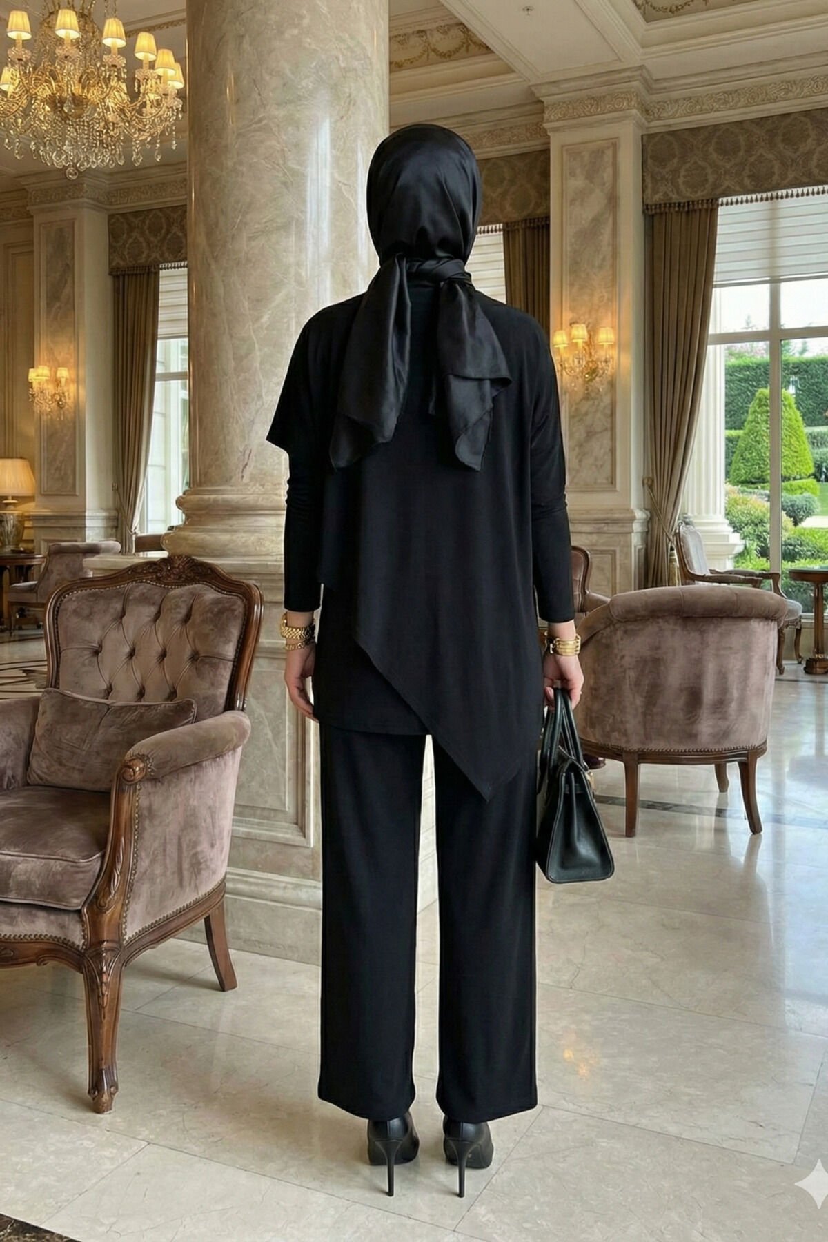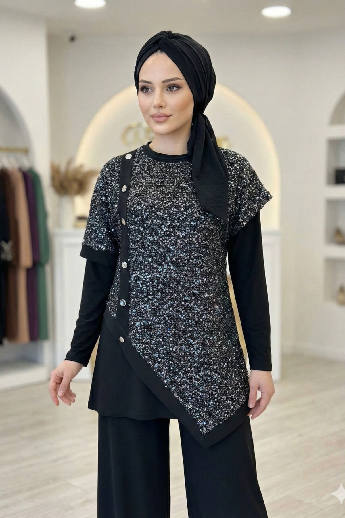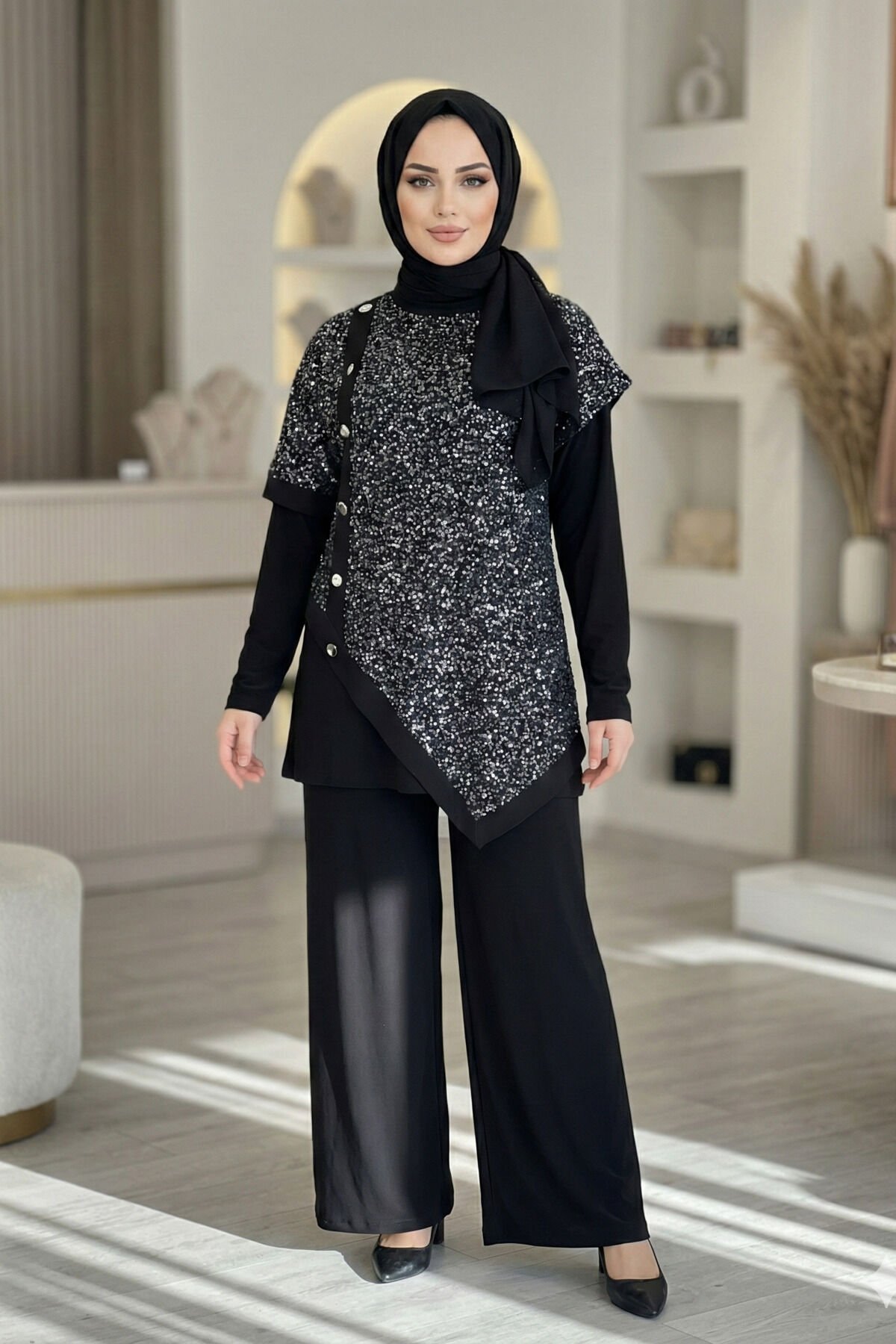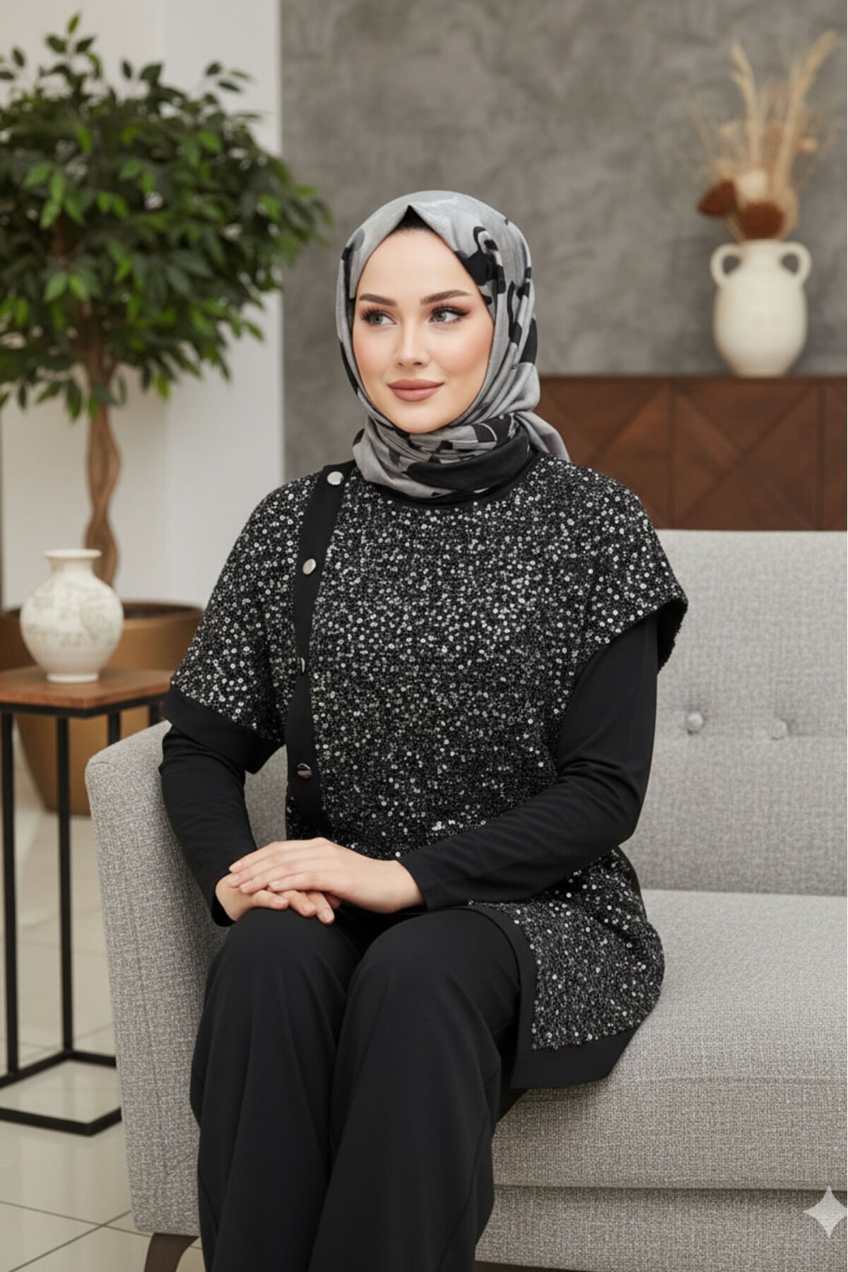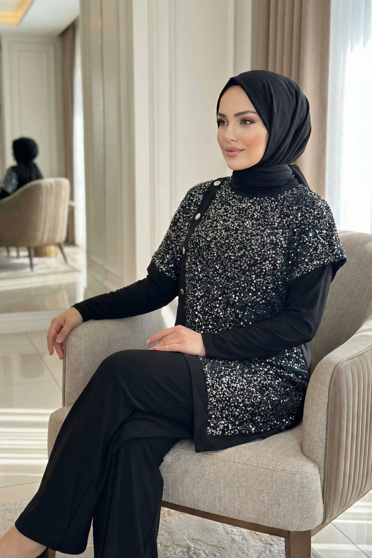 - Özel tasarım Sandy kumaştan üretilmiş, şık ve zarif bir görünüm sunar.; - Tesettür giyim koleksiyonuna özel olarak tasarlanmış, pelerin detaylı 3'lü takım ile davetlerde göz alıcı bir stil yaratır.; - Standart kol ve bisiklet yaka tasarımıyla rahatlık ve şıklığı bir arada sunar.; - Tüm sezonlar için uygun ince yapısıyla konforlu bir kullanım sağlar.; - Payet dokuma tipi sayesinde ışıltılı ve dikkat çekici bir görünüm kazandırır.; - Bol paça pantolon ve bluzlu alt-üst takım kombinasyonu, hareket özgürlüğü ve modern bir siluet sunar.; - Kemersiz tasarımı ile sade ve şık bir görünüm elde edilirken, cepsiz yapısıyla minimalist bir tarzı benimser.; - Uzun boy ve regular kalıp, her vücut tipine uyum sağlayarak rahat bir kullanım imkanı tanır.; - Türkiye menşeli olup, yerel üretimle kaliteyi ve sürdürülebilirliği bir araya getirir.;- Özel tasarım Sandy kumaştan üretilmiş, şık ve zarif bir görünüm sunar.; - Tesettür giyim koleksiyonuna özel olarak tasarlanmış, pelerin detaylı 3'lü takım ile davetlerde göz alıcı bir stil yaratır.; - Standart kol ve bisiklet yaka tasarımıyla rahatlık ve şıklığı bir arada sunar.; - Tüm sezonlar için uygun ince yapısıyla konforlu bir kullanım sağlar.; - Payet dokuma tipi sayesinde ışıltılı ve dikkat çekici bir görünüm kazandırır.; - Bol paça pantolon ve bluzlu alt-üst takım kombinasyonu, hareket özgürlüğü ve modern bir siluet sunar.; - Kemersiz tasarımı ile sade ve şık bir görünüm elde edilirken, cepsiz yapısıyla minimalist bir tarzı benimser.; - Uzun boy ve regular kalıp, her vücut tipine uyum sağlayarak rahat bir kullanım imkanı tanır.; - Türkiye menşeli olup, yerel üretimle kaliteyi ve sürdürülebilirliği bir araya getirir.;