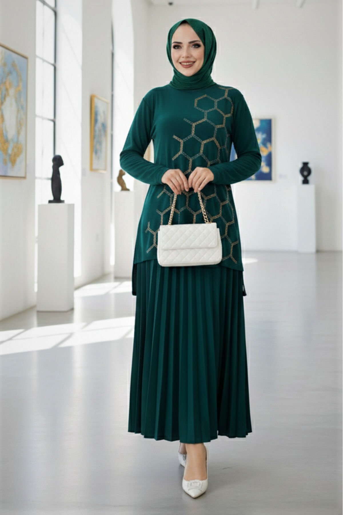 Kadın Sandy Kahverengi Taş Detaylı Piliseli İkili Tesettür Etekli Takım Zümrüt - 42