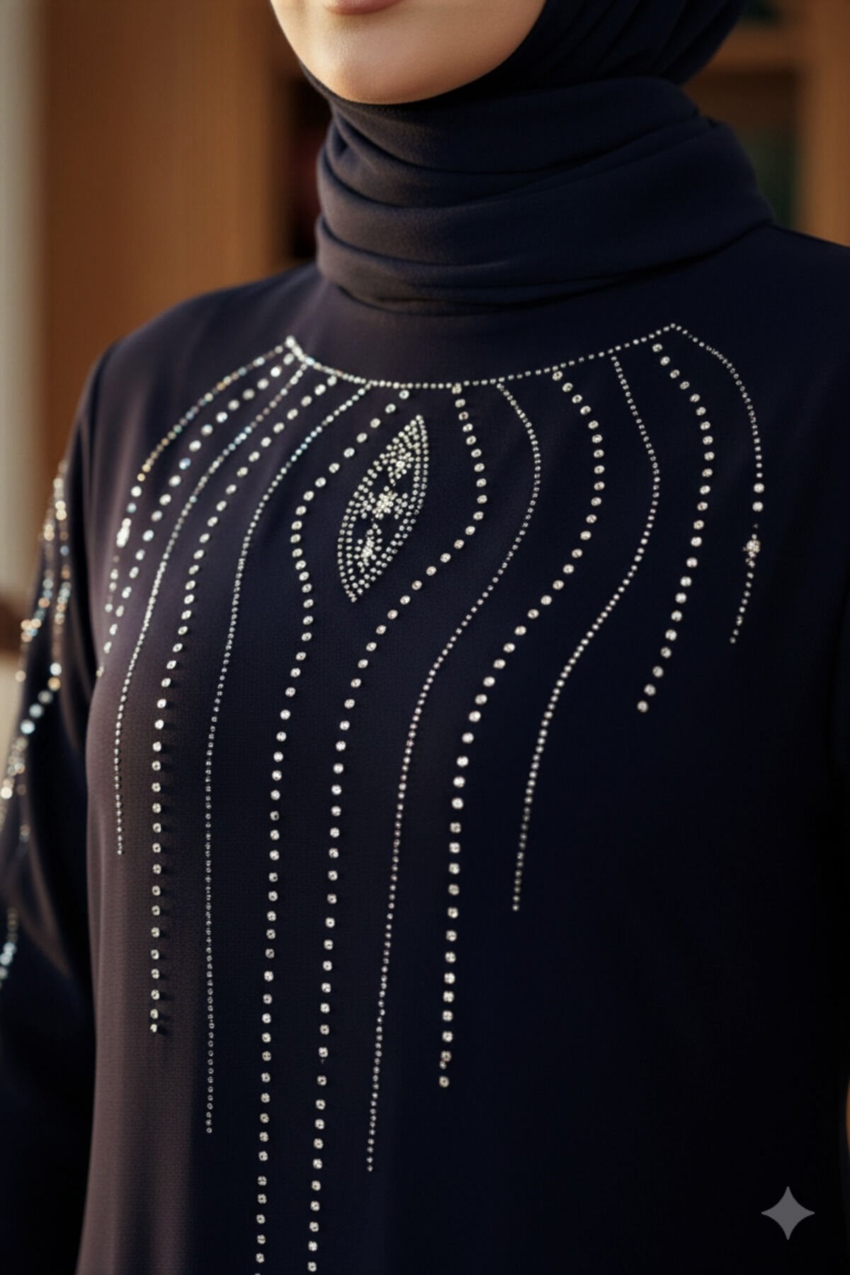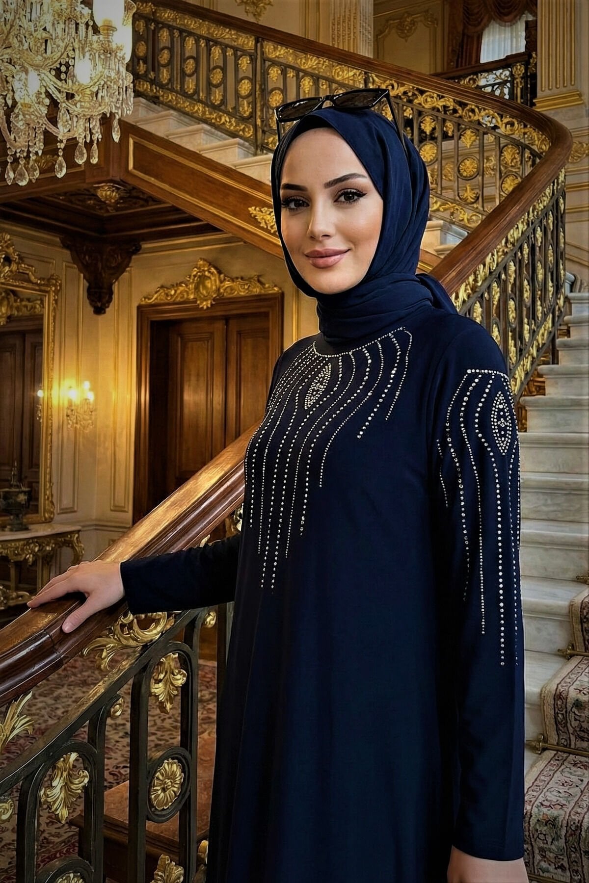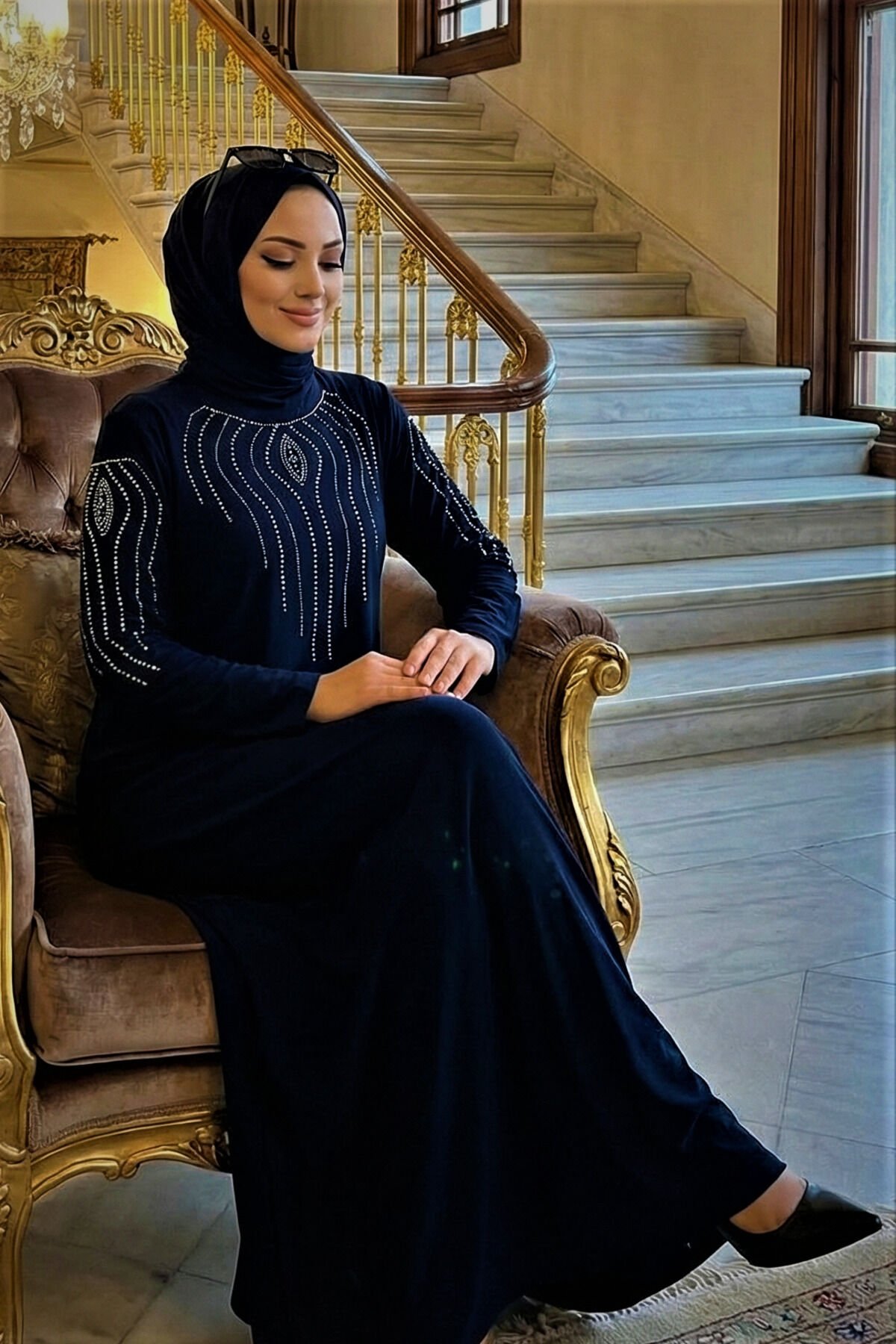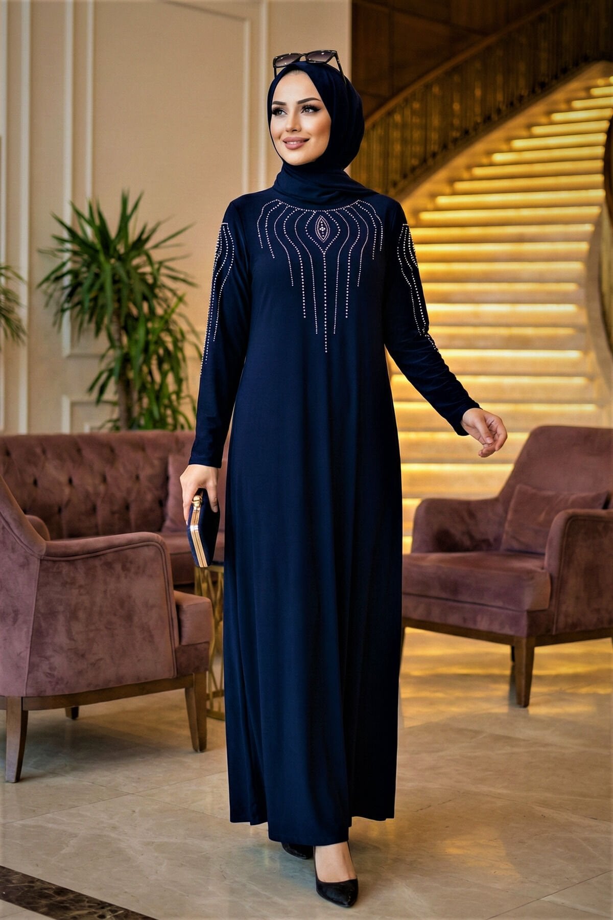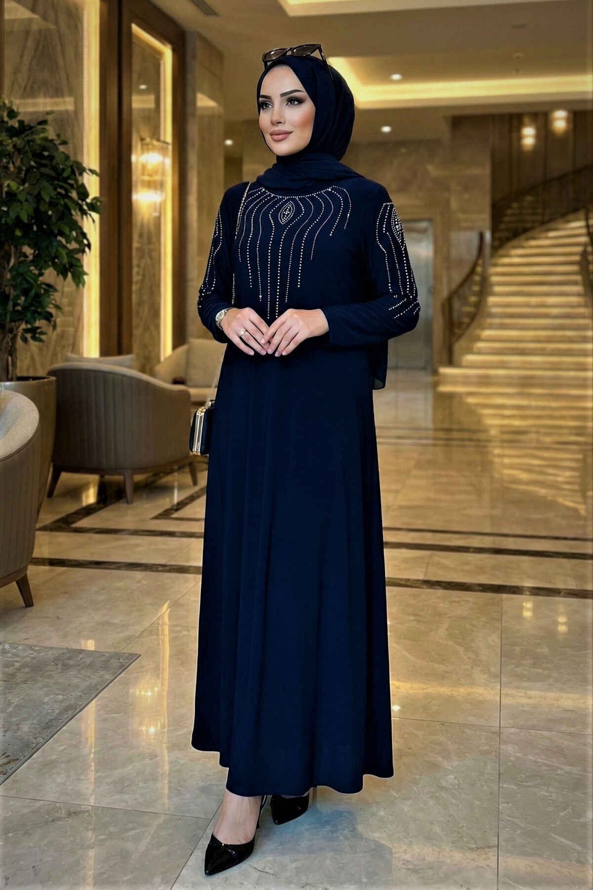 Kadın Sandy Lacivert Büyük Beden Boydan Abiye özel davet Önü Ve Kolları Taş Detaylı Tesettür Elbise Laci̇vert - 58