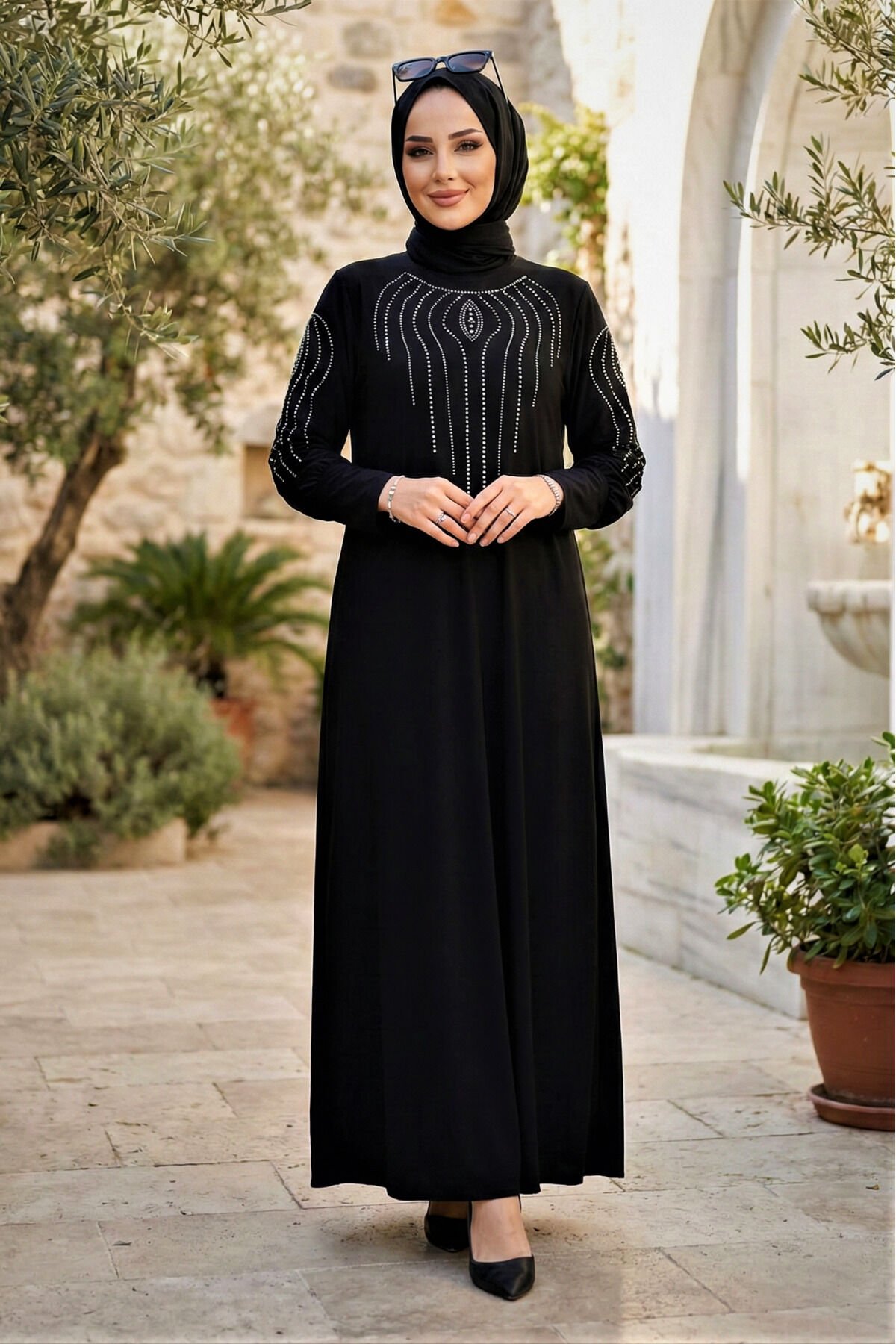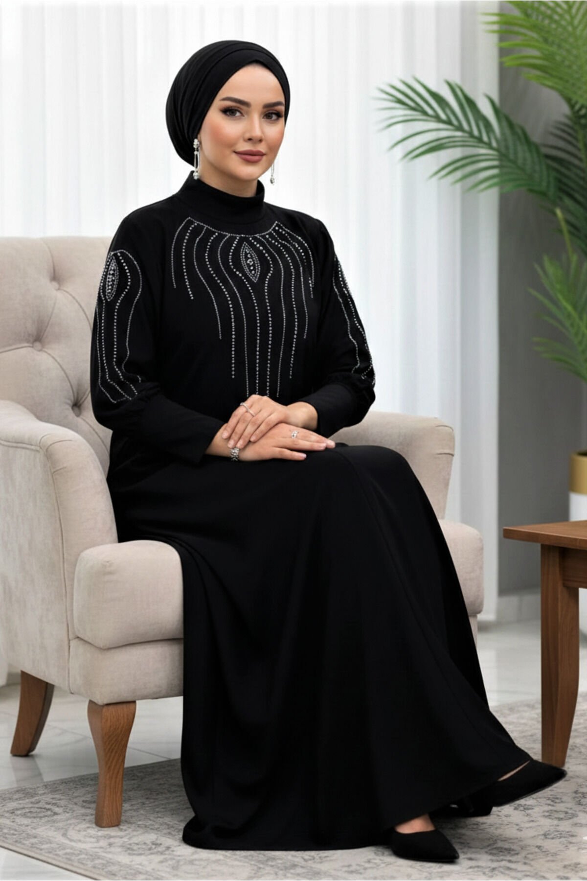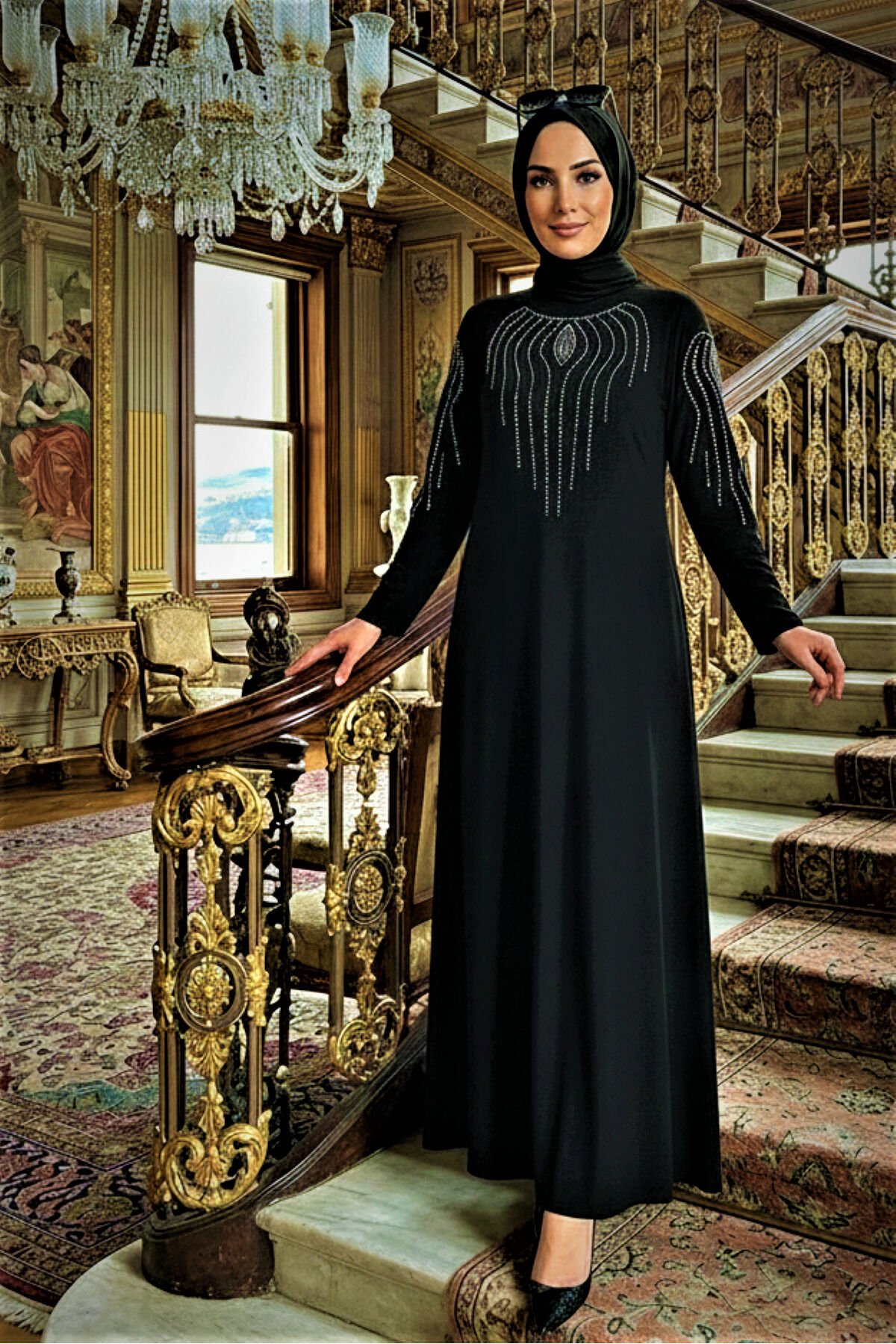 Kadın Sandy Lacivert Büyük Beden Boydan Abiye özel davet Önü Ve Kolları Taş Detaylı Tesettür Elbise Siyah - 58