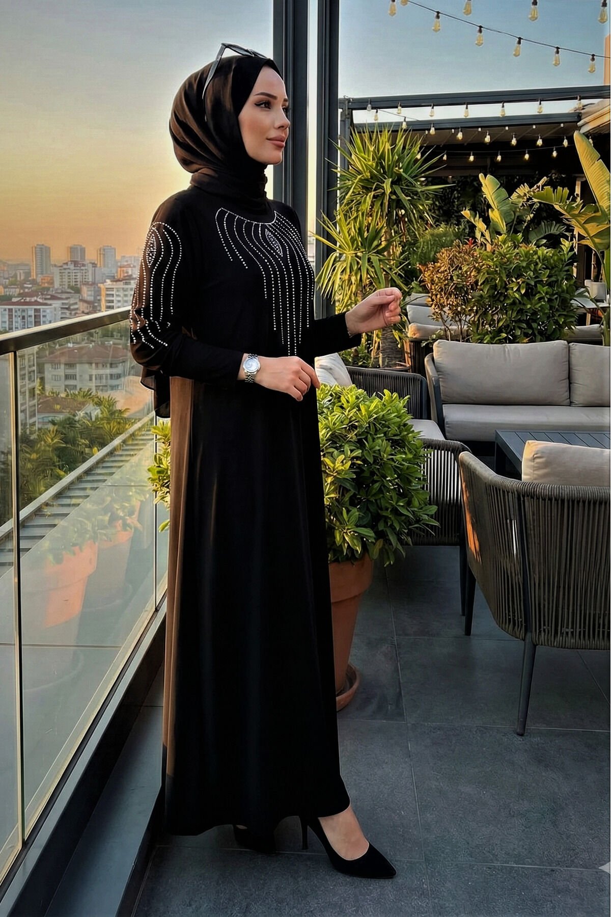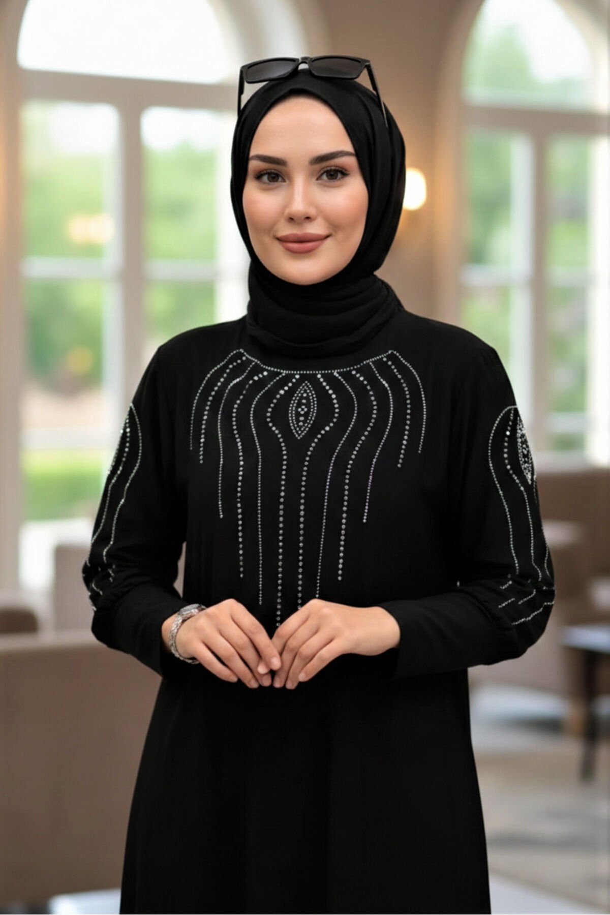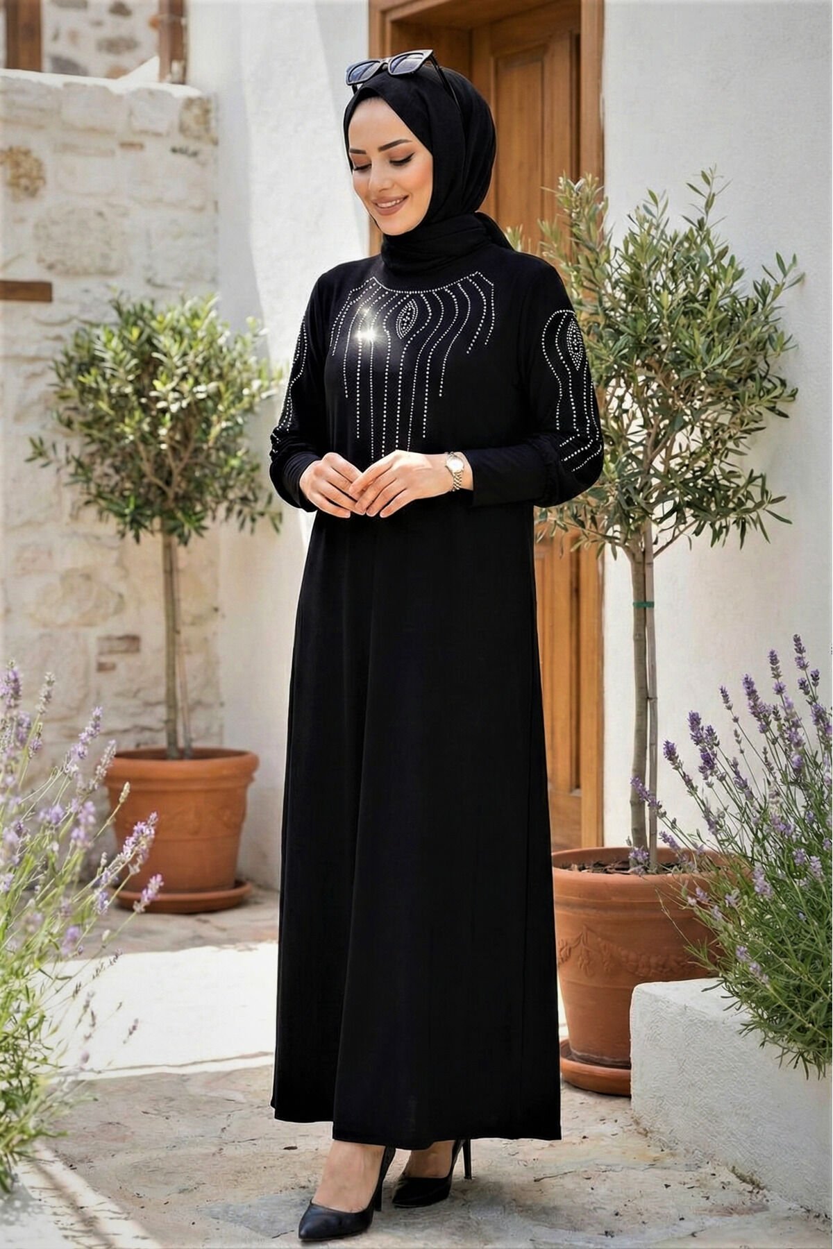 Kadın Sandy Lacivert Büyük Beden Boydan Abiye özel davet Önü Ve Kolları Taş Detaylı Tesettür Elbise Siyah - 58