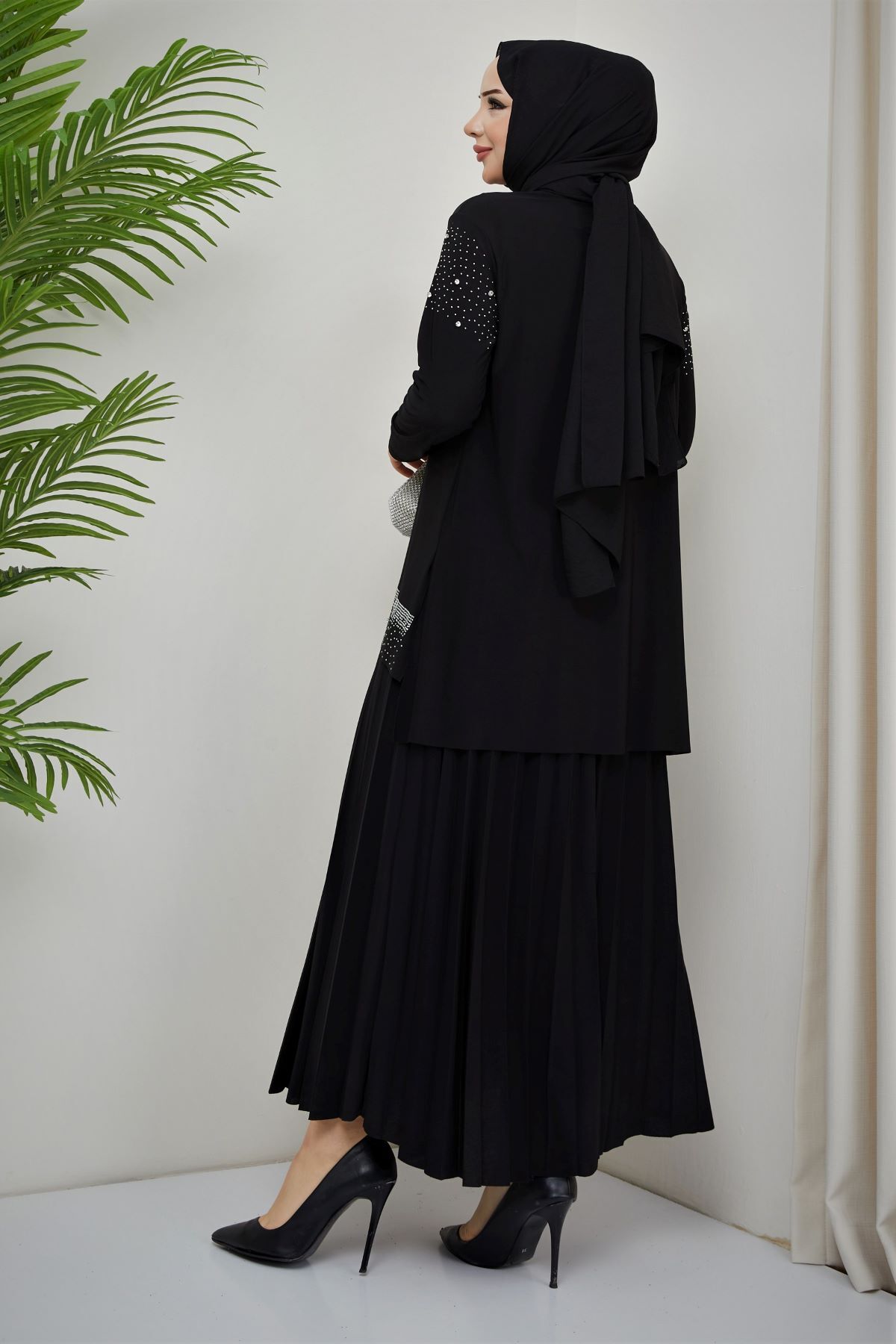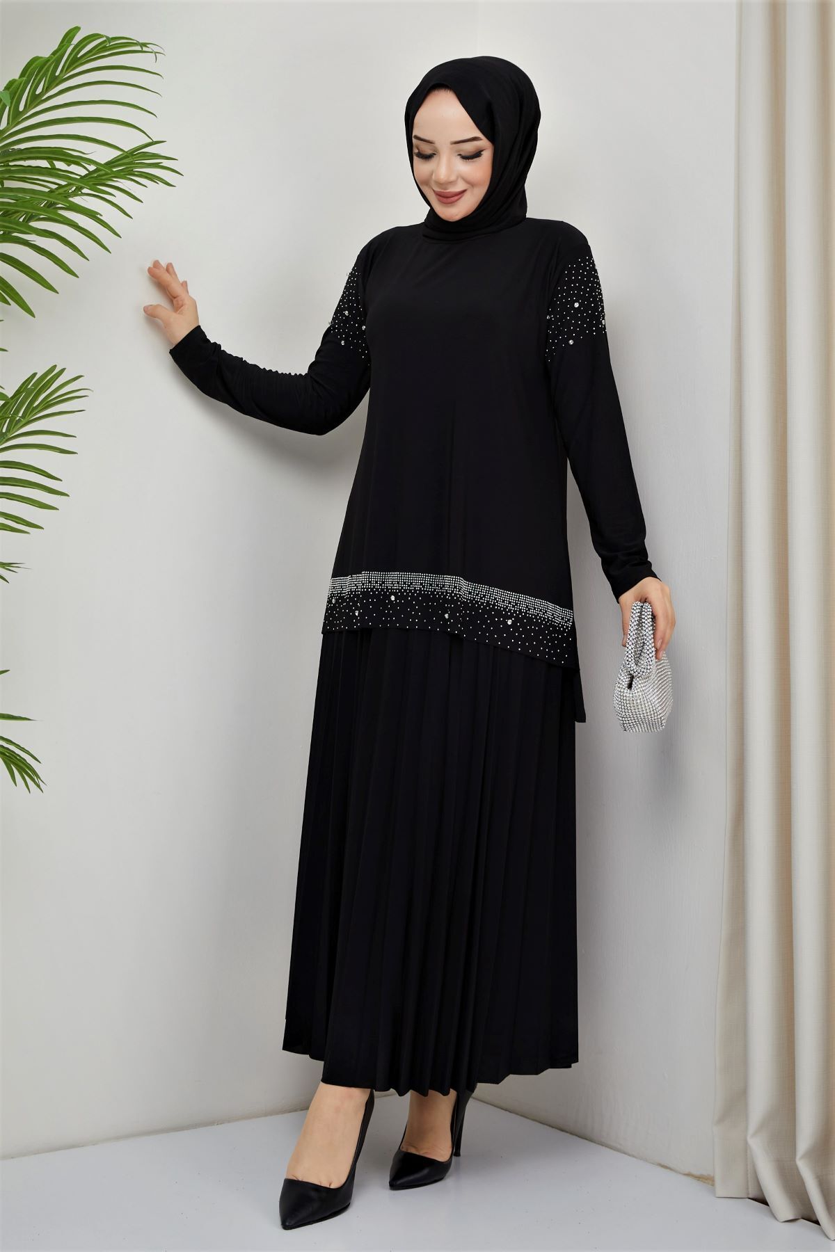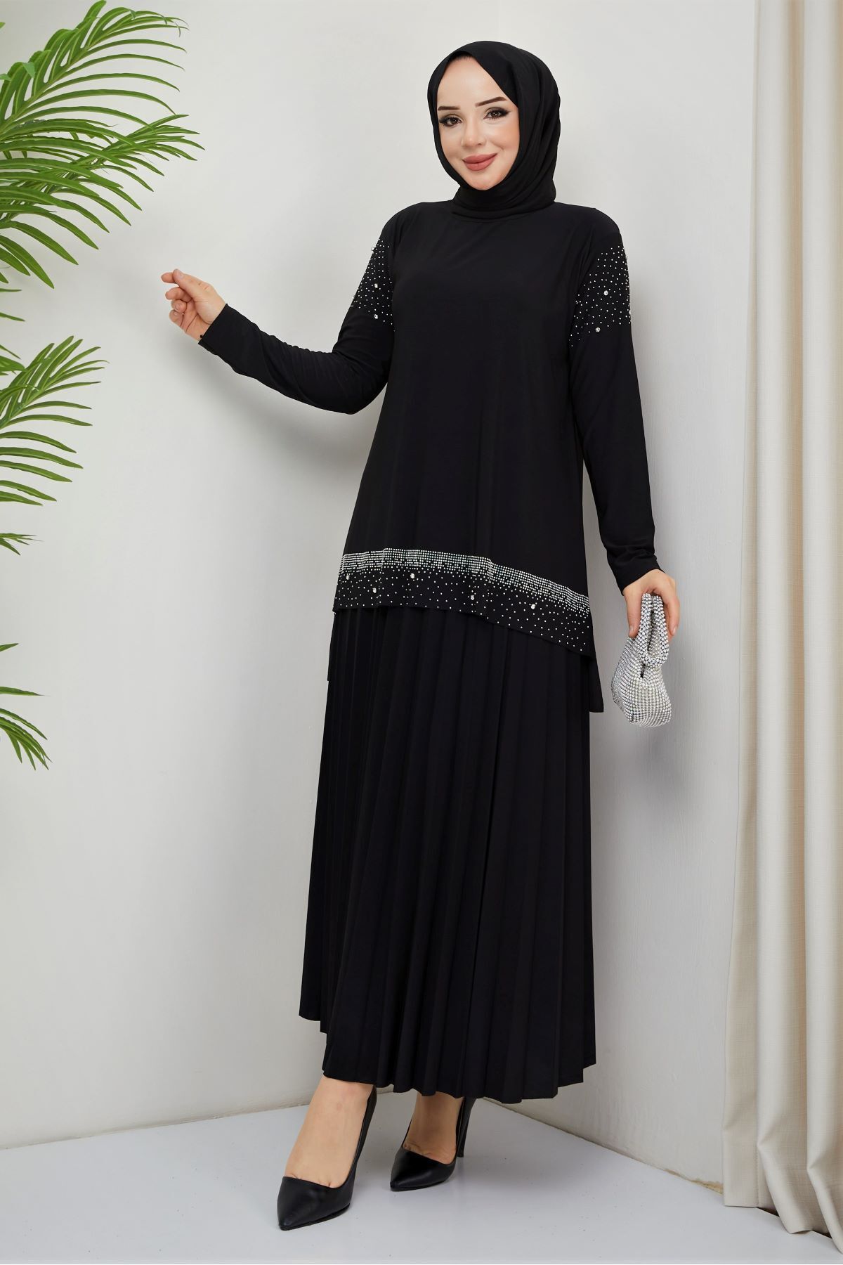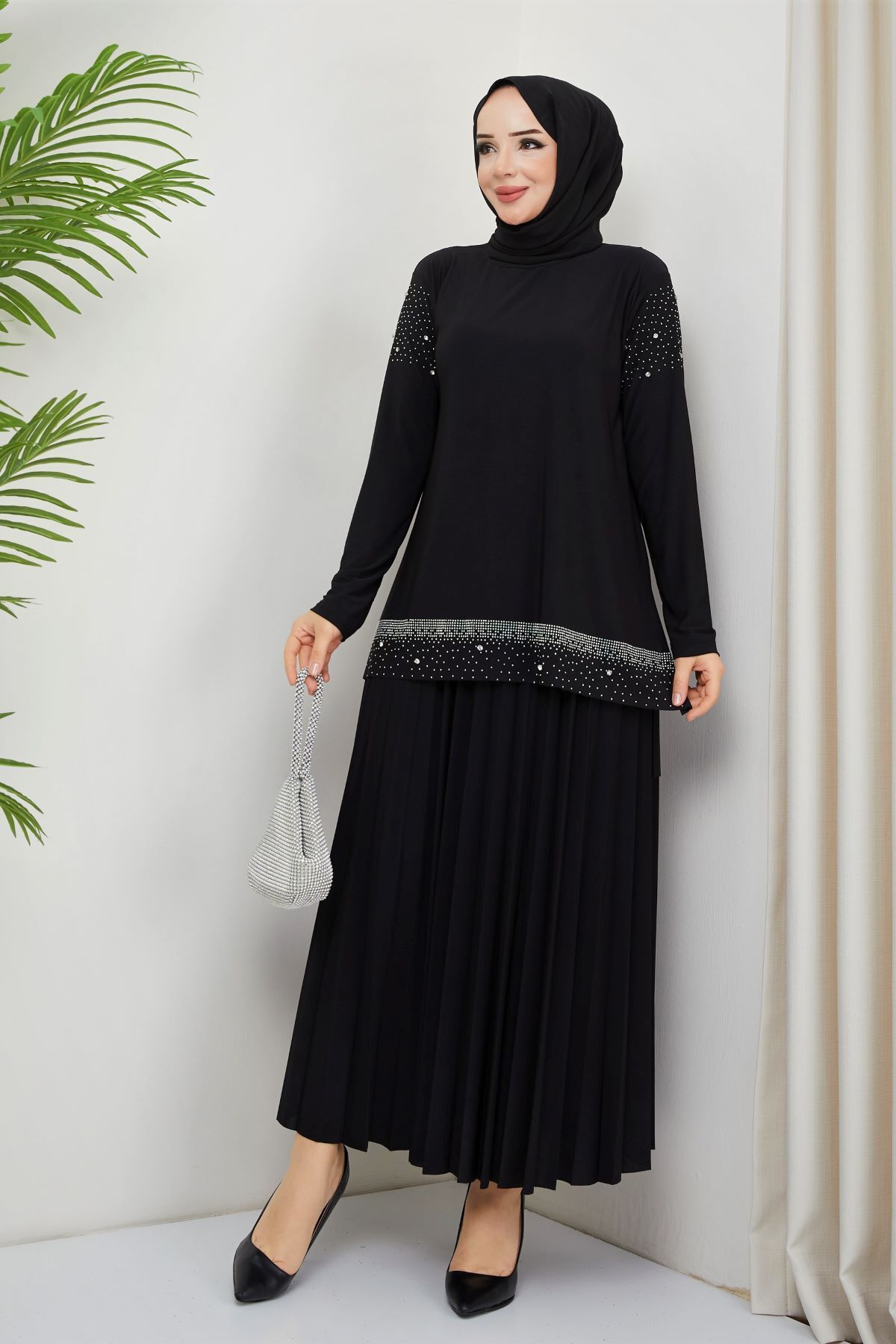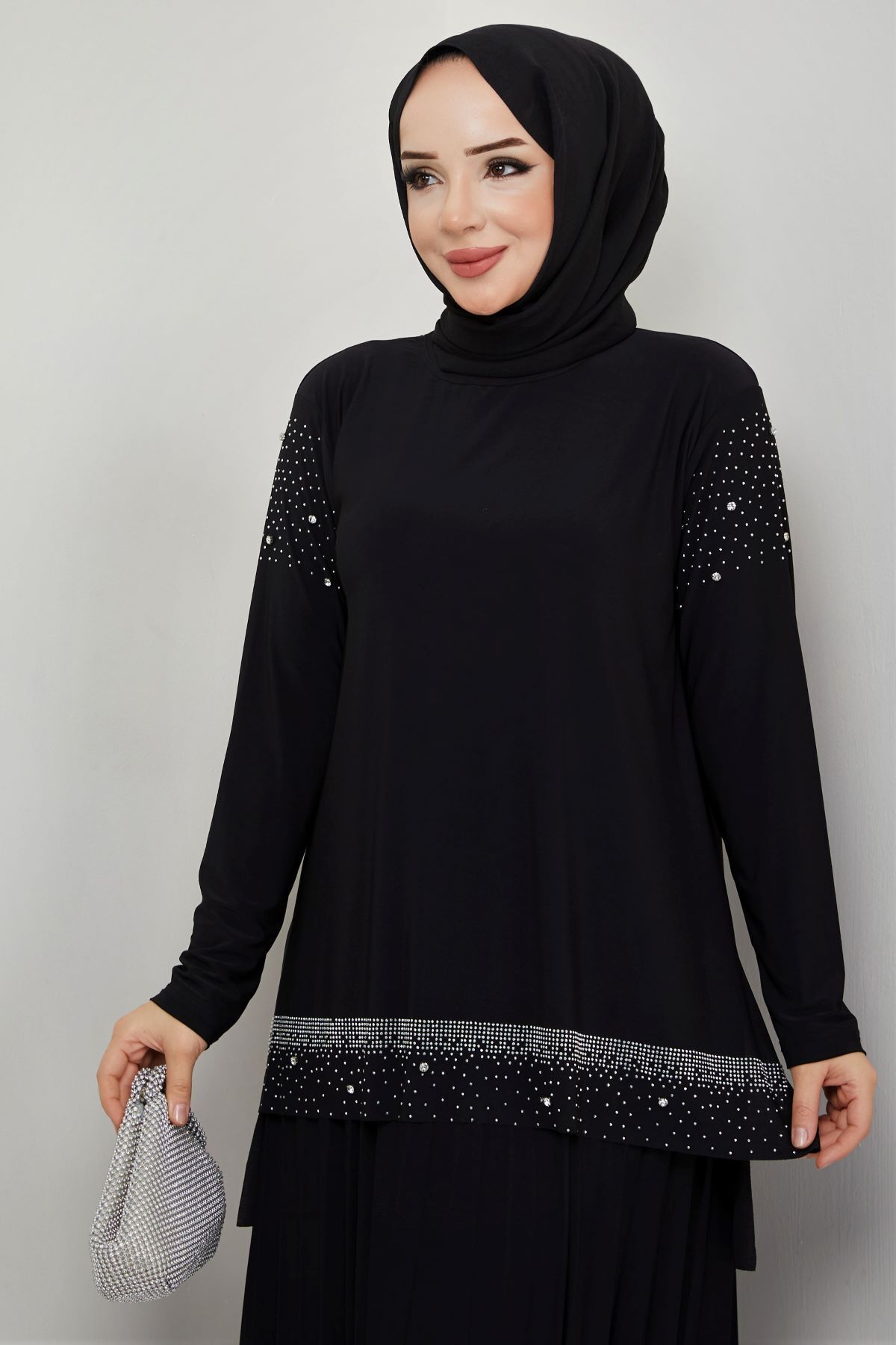 KADIN SANDY LACİVERT ÖNÜ VE KOLLARI TAŞLI 2Lİ BLUZ ETEK PİLİSELİ İKİLİ TESETTÜR ETEKLİ TAKIM Si̇yah - 52