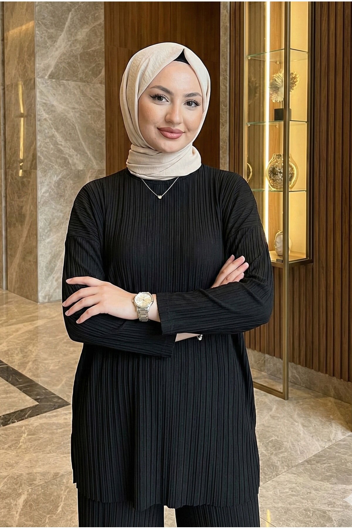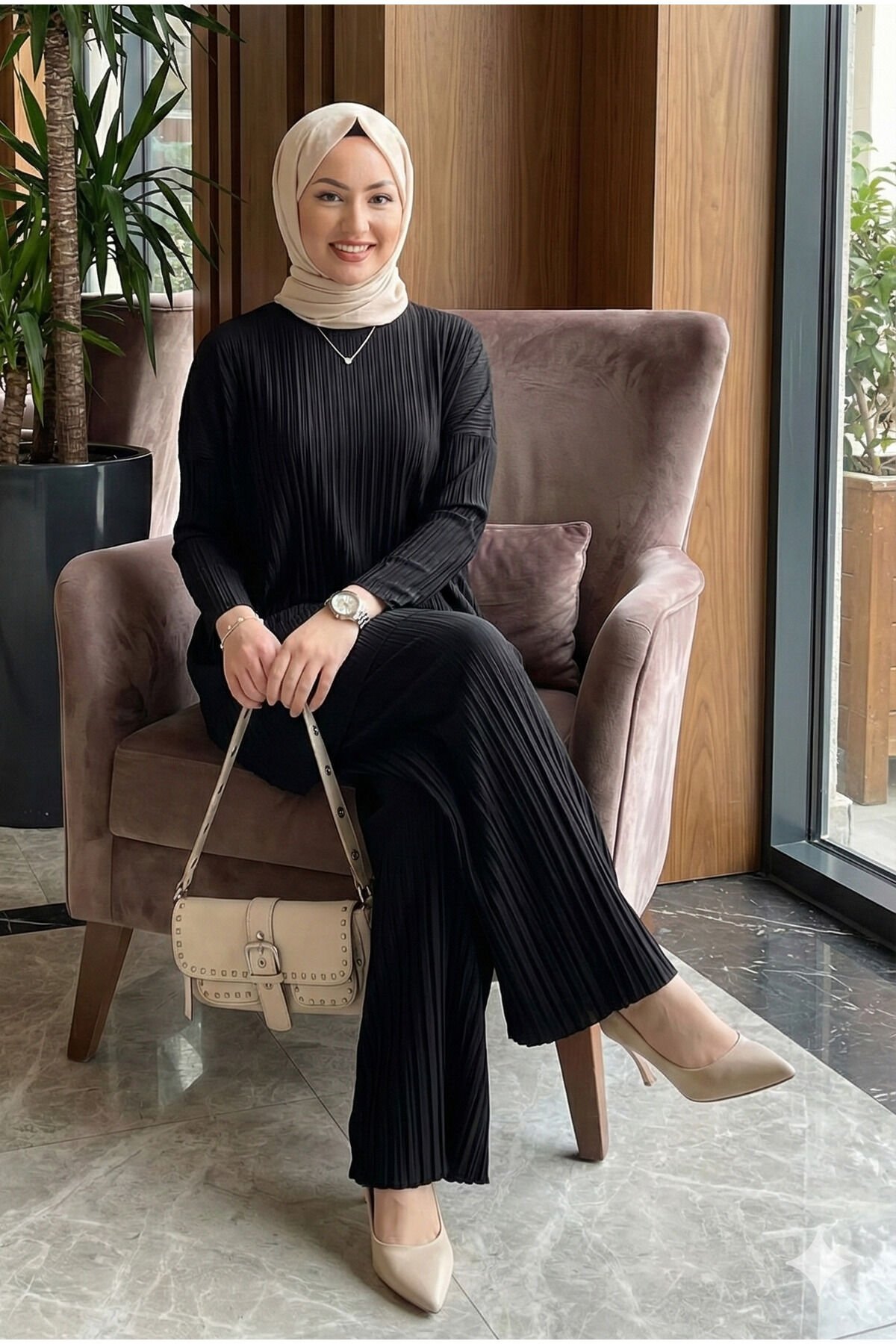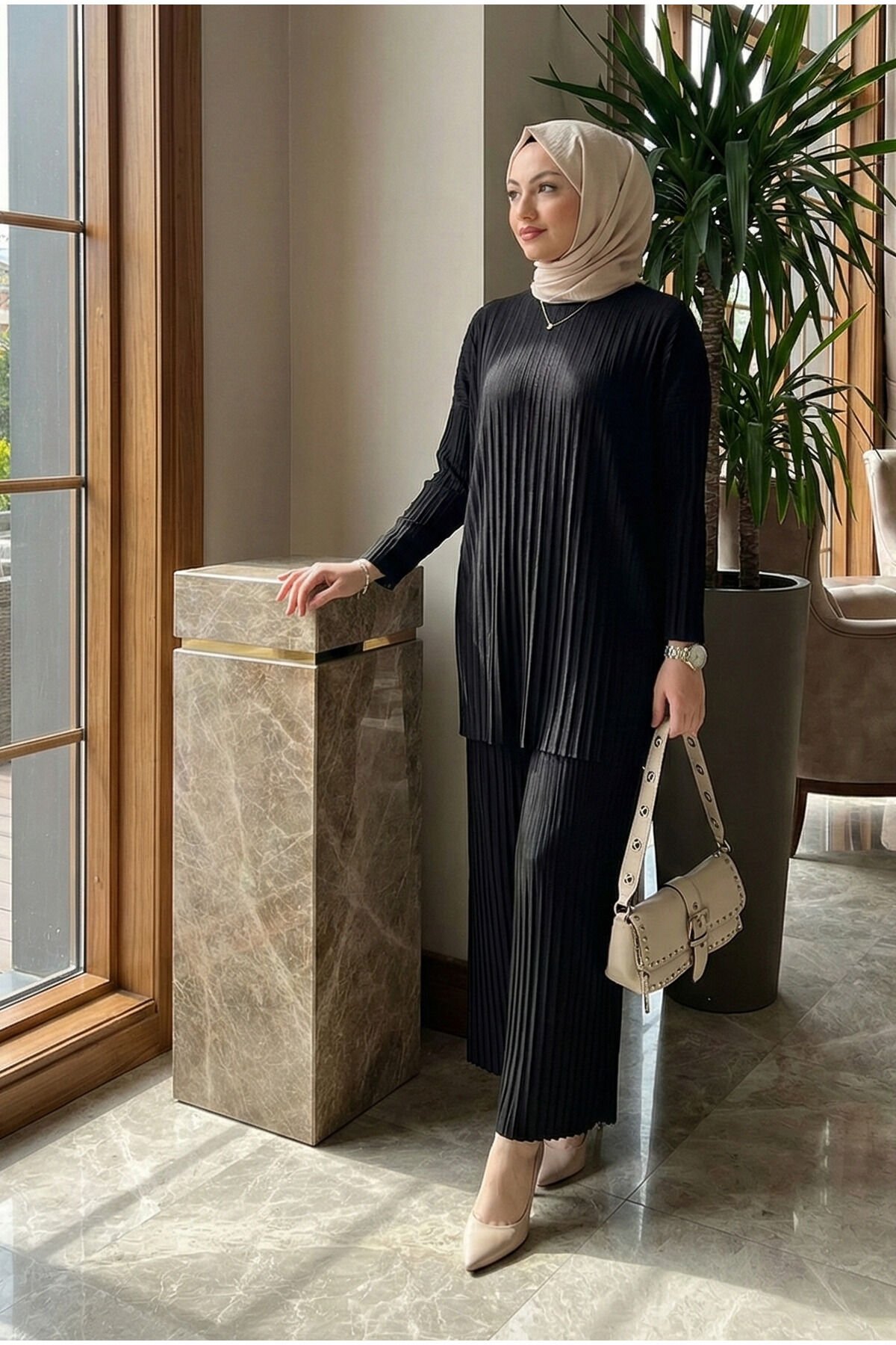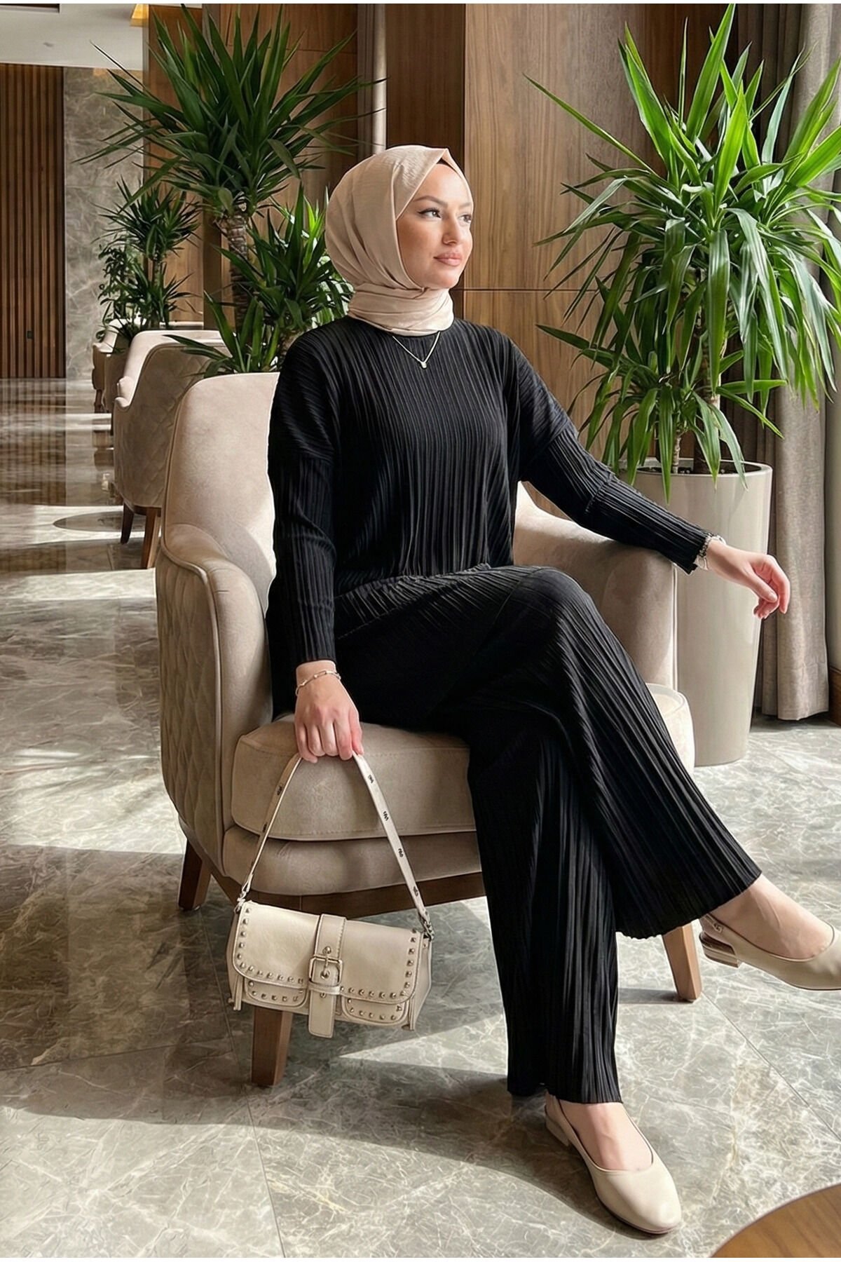 - Sandy dokuma tipi ile üretilmiş, ince ve hafif yapısıyla her mevsim rahatlıkla tercih edilebilen bir takım.; - Casual ve günlük kullanım için ideal, düz deseniyle sade ve şık bir görünüm sunar.; - Kapamasız tasarımı sayesinde kolay giyilip çıkarılabilir; bisiklet yaka detayı ile modern bir stil oluşturur.; - Uzun kollu ve bol paça kesimiyle rahat hareket etme özgürlüğü sağlar; regular siluetiyle vücut hatlarını nazikçe sarar.; - Piliseli detayları ile feminen dokunuşlar eklerken, lastikli bel tasarımı konforlu bir kullanım sunar.; - Tesettür giyim koleksiyonuna uygun olarak tasarlanmıştır; kemersiz ve cepli yapısıyla minimalist bir estetik sergiler.; - Sürdürülebilirlik detaylarına sahip olup, çevre dostu tercihler arasında yer alır.; - Yetişkin kadınlar için uygun olan bu takım, cool & comfort persona ile günlük şıklığınızı tamamlar.; - Standart kol tipi ve uzun boyu ile farklı vücut tiplerine uyum sağlar.; - Türkiye'de üretilmiş olup, yerel üretim desteklenerek ekonomik katkıda bulunulur.; - Relaxed kalıbı sayesinde rahatlığı ön pl- Sandy dokuma tipi ile üretilmiş, ince ve hafif yapısıyla her mevsim rahatlıkla tercih edilebilen bir takım.; - Casual ve günlük kullanım için ideal, düz deseniyle sade ve şık bir görünüm sunar.; - Kapamasız tasarımı sayesinde kolay giyilip çıkarılabilir; bisiklet yaka detayı ile modern bir stil oluşturur.; - Uzun kollu ve bol paça kesimiyle rahat hareket etme özgürlüğü sağlar; regular siluetiyle vücut hatlarını nazikçe sarar.; - Piliseli detayları ile feminen dokunuşlar eklerken, lastikli bel tasarımı konforlu bir kullanım sunar.; - Tesettür giyim koleksiyonuna uygun olarak tasarlanmıştır; kemersiz ve cepli yapısıyla minimalist bir estetik sergiler.; - Sürdürülebilirlik detaylarına sahip olup, çevre dostu tercihler arasında yer alır.; - Yetişkin kadınlar için uygun olan bu takım, cool & comfort persona ile günlük şıklığınızı tamamlar.; - Standart kol tipi ve uzun boyu ile farklı vücut tiplerine uyum sağlar.; - Türkiye'de üretilmiş olup, yerel üretim desteklenerek ekonomik katkıda bulunulur.; - Relaxed kalıbı sayesinde rahatlığı ön pl