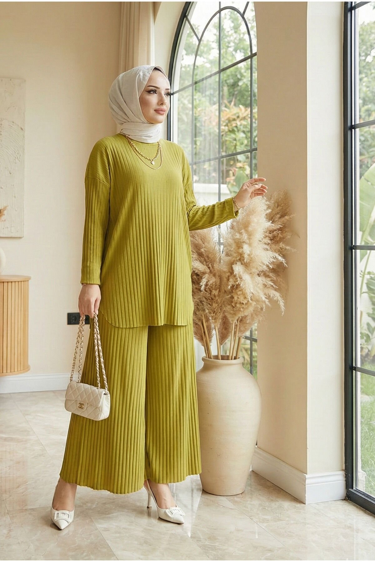 Kadın Sandy mor Komple Piliseli Tunik Pantolon Tesettür İkili Takım Yağyeşi̇li̇ - Mstd