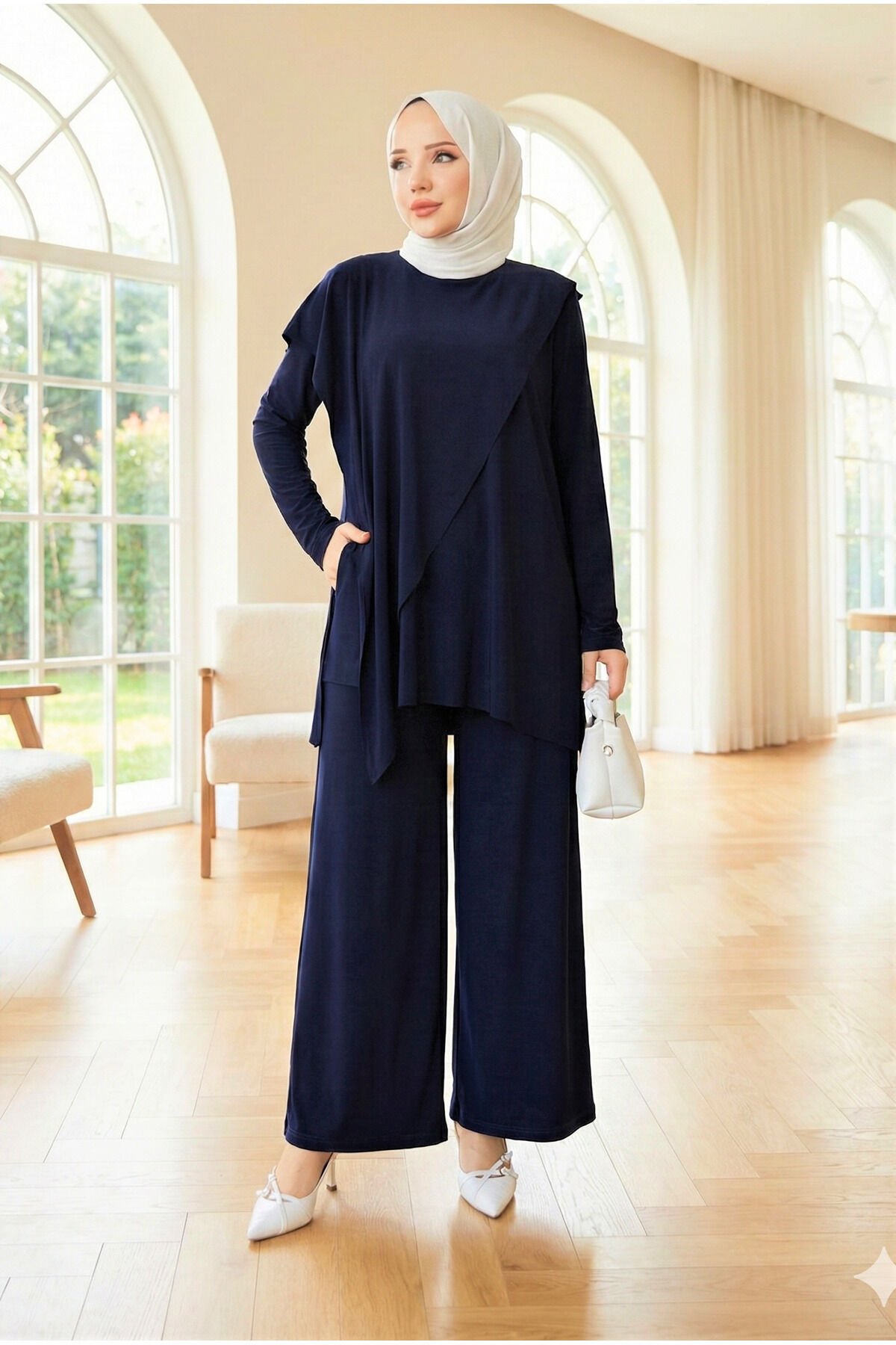 Kadın Sandy Ön ve Arka Omuzdan Kanatlı Asimetrik Kesim Tesettür İkili Pasntolonlu Takım Laci̇vert - 48