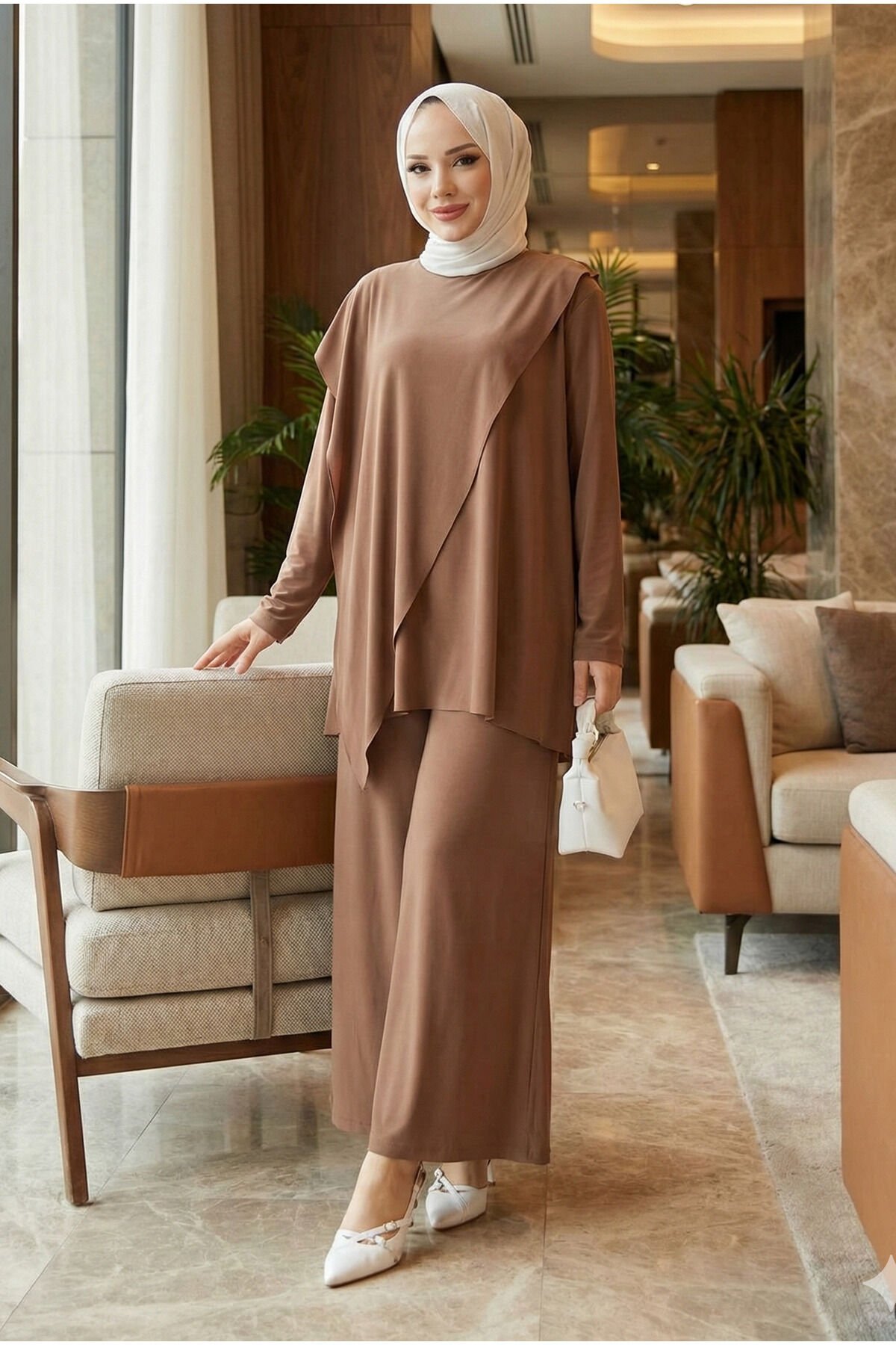 Kadın Sandy Ön ve Arka Omuzdan Kanatlı Asimetrik Kesim Tesettür İkili Pasntolonlu Takım Taba - 44