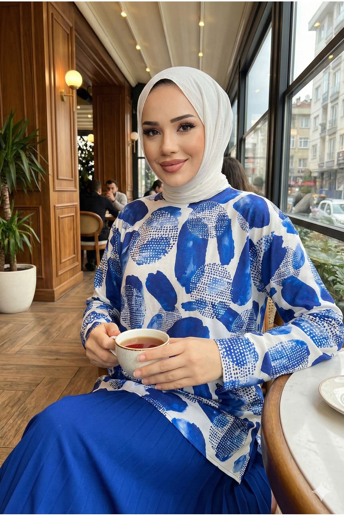 Kadın Sandy saks mavi Dijital Baskı Bluz Pilise Etek İkili Etekli Takım Saks - 42