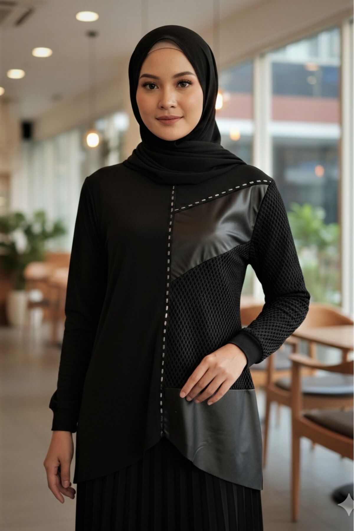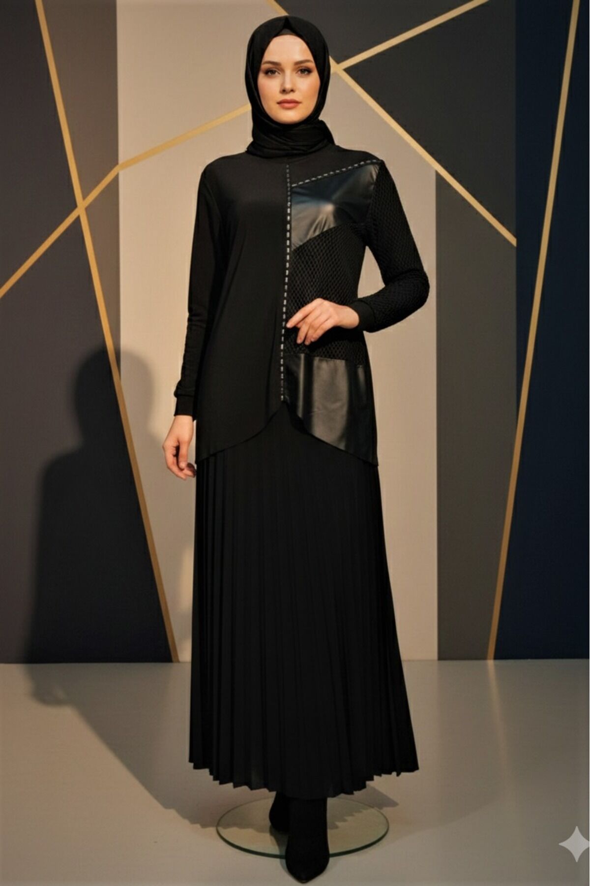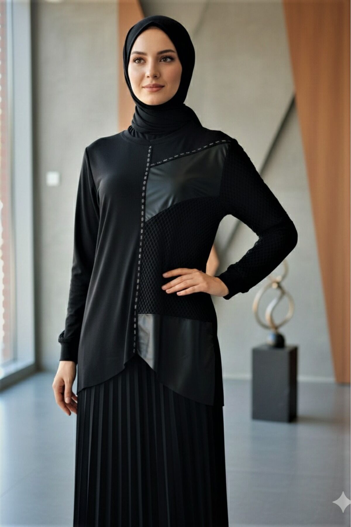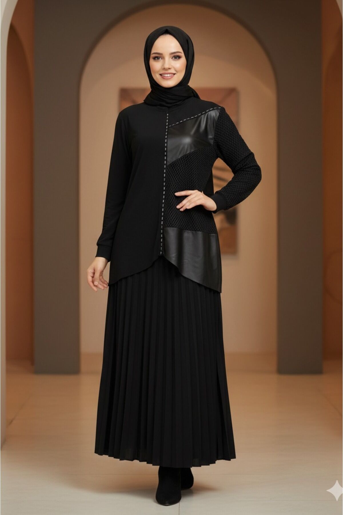 - Şık ve modern tasarımıyla dikkat çeken, kadınlar için özel olarak tasarlanmış Sandy kumaştan üretilmiş bluz ve piliseli etek ikili takım.; - Rahat bir kullanım sunan lastikli bel detayı sayesinde gün boyu konfor sağlar.; - Cool & Comfort persona'ya uygun, hem şık hem de rahat bir görünüm sunar.; - İnce yapısıyla hafif ve ferah bir kullanım deneyimi sağlar, özellikle sıcak havalarda idealdir.; - Taş baskı detaylarıyla estetik bir dokunuş katarken, bluzun ön kısmındaki deri ve file detayları modern bir hava katar.; - Tesettür giyim koleksiyonuna özel olarak tasarlanmış olup, zarif ve örtünme prensiplerine uygun bir stil sunar.; - Sürdürülebilirlik detayına sahip olmasıyla çevre dostu bir tercih olarak öne çıkar.; - Regular silueti sayesinde vücut hatlarını nazikçe sararak rahat bir oturuş sağlar.; - Cepsiz tasarımıyla minimalist bir görünüm sunarken, bisiklet yaka ve standart kol tipiyle klasik bir şıklık yaratır.; - Uzun boyu ve paçasız etek tasarımıyla modern ve sofistike bir görünüm kazandırır.; - Kırışmaya dayanıklı kumaşı sayesinde gün boyu bakımlı ve düzgün görünmenizi sağlar.; - Astarsız yapısıyla hafif ve nefes alabilen bir yapıya sahiptir.; - Türkiye'de üretilmiş olmasıyla yerel üretim desteklenmiş olur.; - Örme kumaş tipi, esneklik ve konforu bir arada sunarak hareket özgürlüğü sağlar.;- Şık ve modern tasarımıyla dikkat çeken, kadınlar için özel olarak tasarlanmış Sandy kumaştan üretilmiş bluz ve piliseli etek ikili takım.; - Rahat bir kullanım sunan lastikli bel detayı sayesinde gün boyu konfor sağlar.; - Cool & Comfort persona'ya uygun, hem şık hem de rahat bir görünüm sunar.; - İnce yapısıyla hafif ve ferah bir kullanım deneyimi sağlar, özellikle sıcak havalarda idealdir.; - Taş baskı detaylarıyla estetik bir dokunuş katarken, bluzun ön kısmındaki deri ve file detayları modern bir hava katar.; - Tesettür giyim koleksiyonuna özel olarak tasarlanmış olup, zarif ve örtünme prensiplerine uygun bir stil sunar.; - Sürdürülebilirlik detayına sahip olmasıyla çevre dostu bir tercih olarak öne çıkar.; - Regular silueti sayesinde vücut hatlarını nazikçe sararak rahat bir oturuş sağlar.; - Cepsiz tasarımıyla minimalist bir görünüm sunarken, bisiklet yaka ve standart kol tipiyle klasik bir şıklık yaratır.; - Uzun boyu ve paçasız etek tasarımıyla modern ve sofistike bir görünüm kazandırır.; - Kırışmaya dayanıklı kumaşı sayesinde gün boyu bakımlı ve düzgün görünmenizi sağlar.; - Astarsız yapısıyla hafif ve nefes alabilen bir yapıya sahiptir.; - Türkiye'de üretilmiş olmasıyla yerel üretim desteklenmiş olur.; - Örme kumaş tipi, esneklik ve konforu bir arada sunarak hareket özgürlüğü sağlar.;