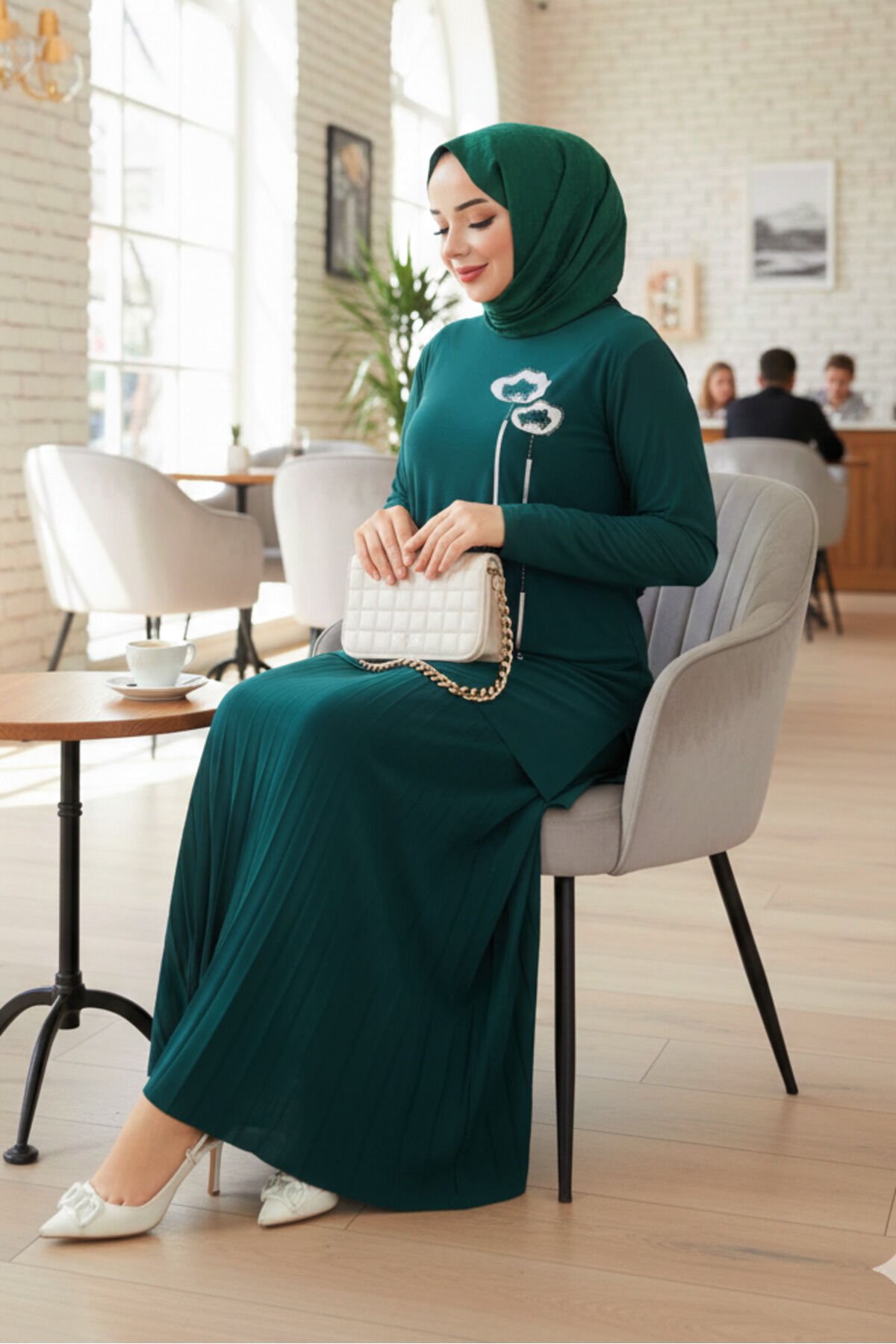 Kadın Sandy Siyah tarz özel davet anne Büyük Beden Piliseli İkili Tesettür Etekli Takım Zümrüt - 44