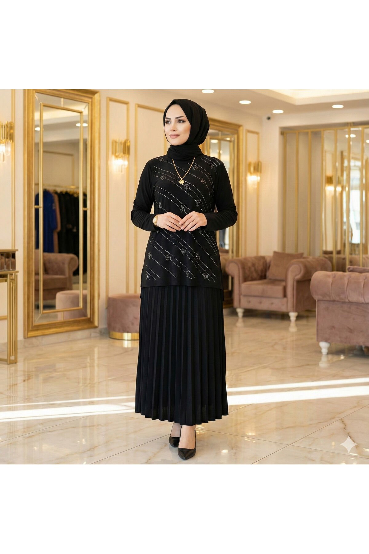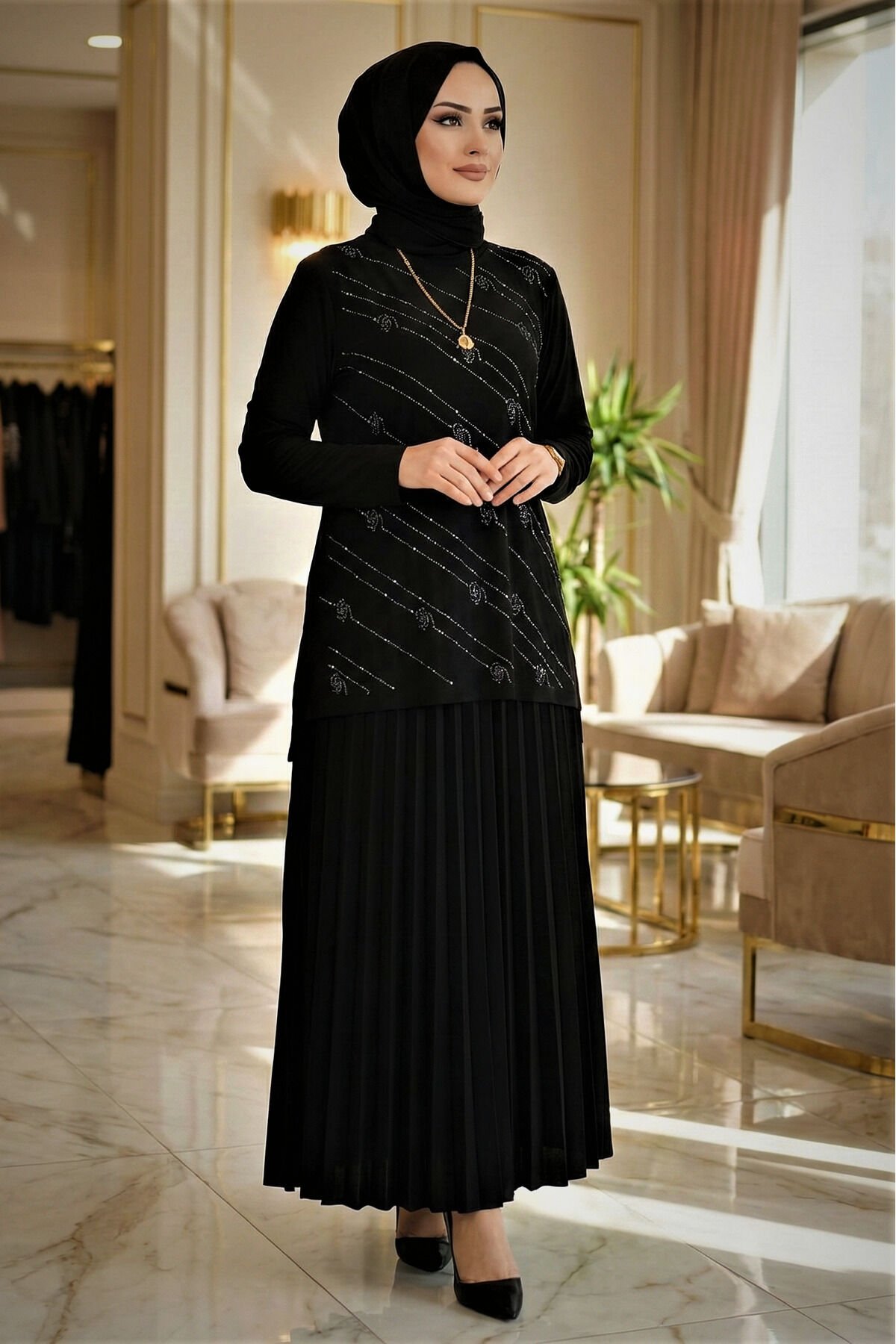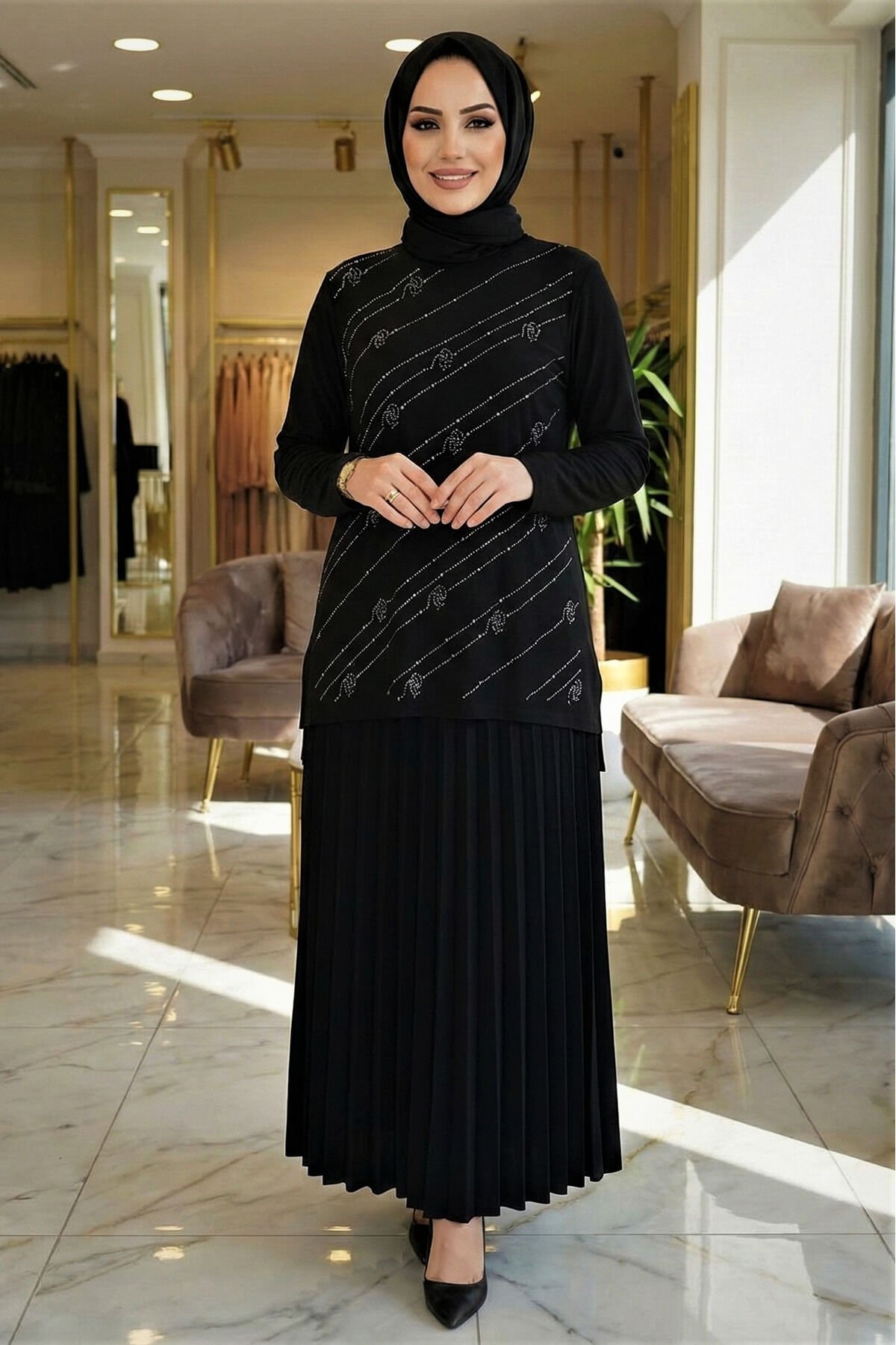 Kadın Sandy Siyah Tarz Özel Davet Bluz Taş Detaylı Eteği Piliseli İkili Tesettür Etekli Takım Siyah - 42