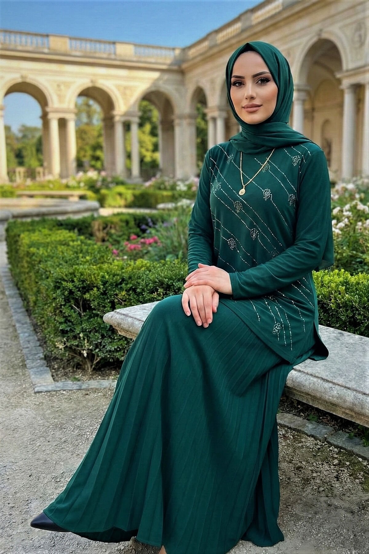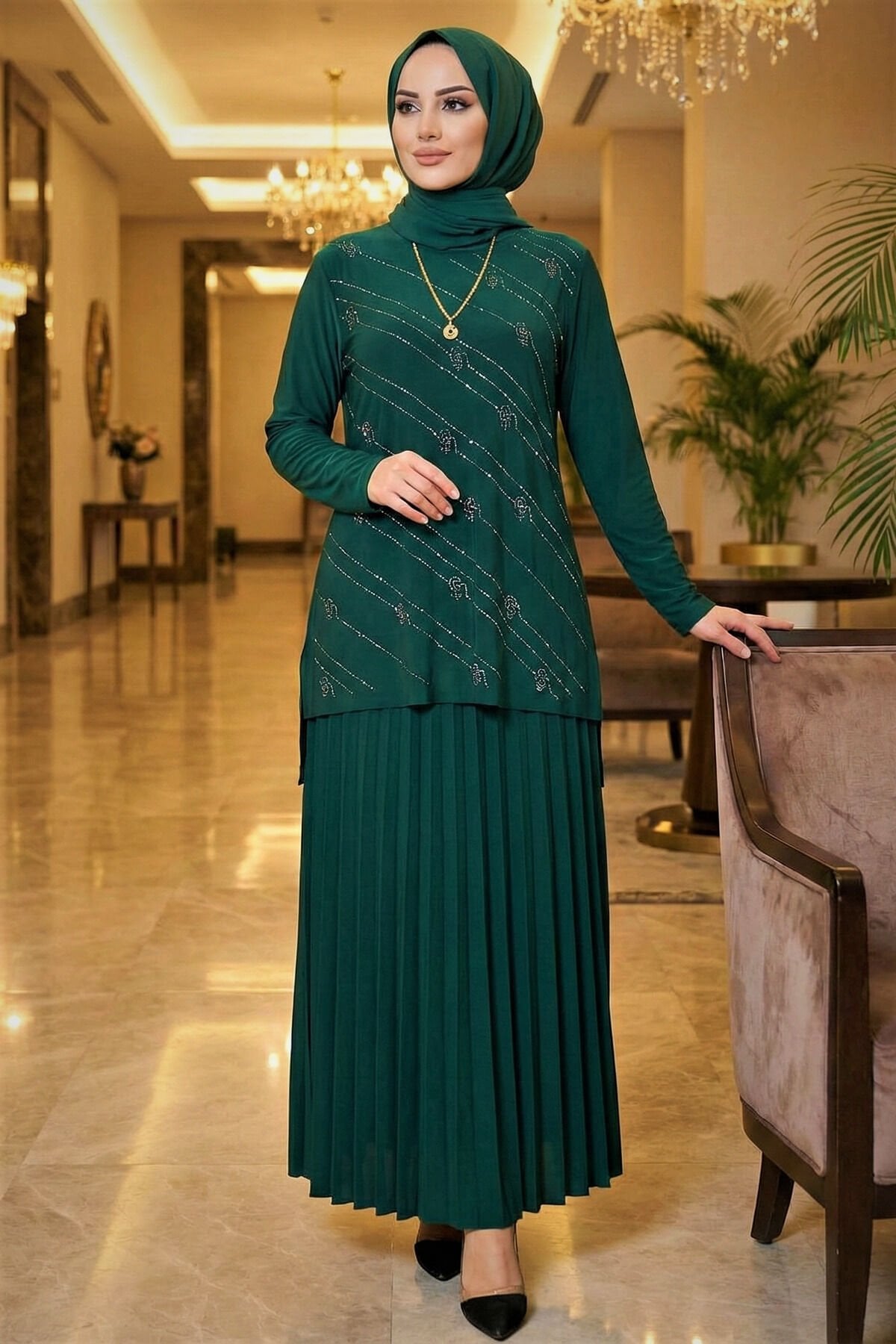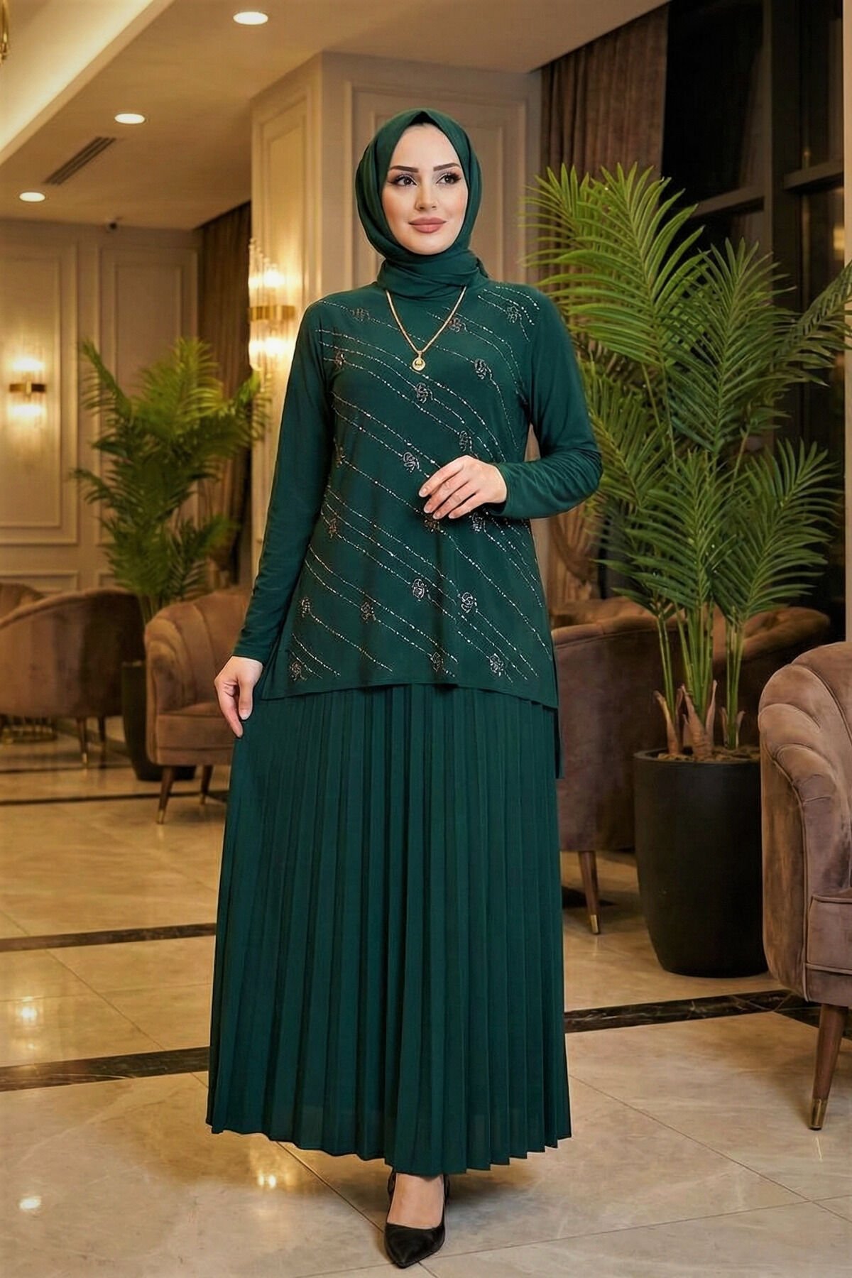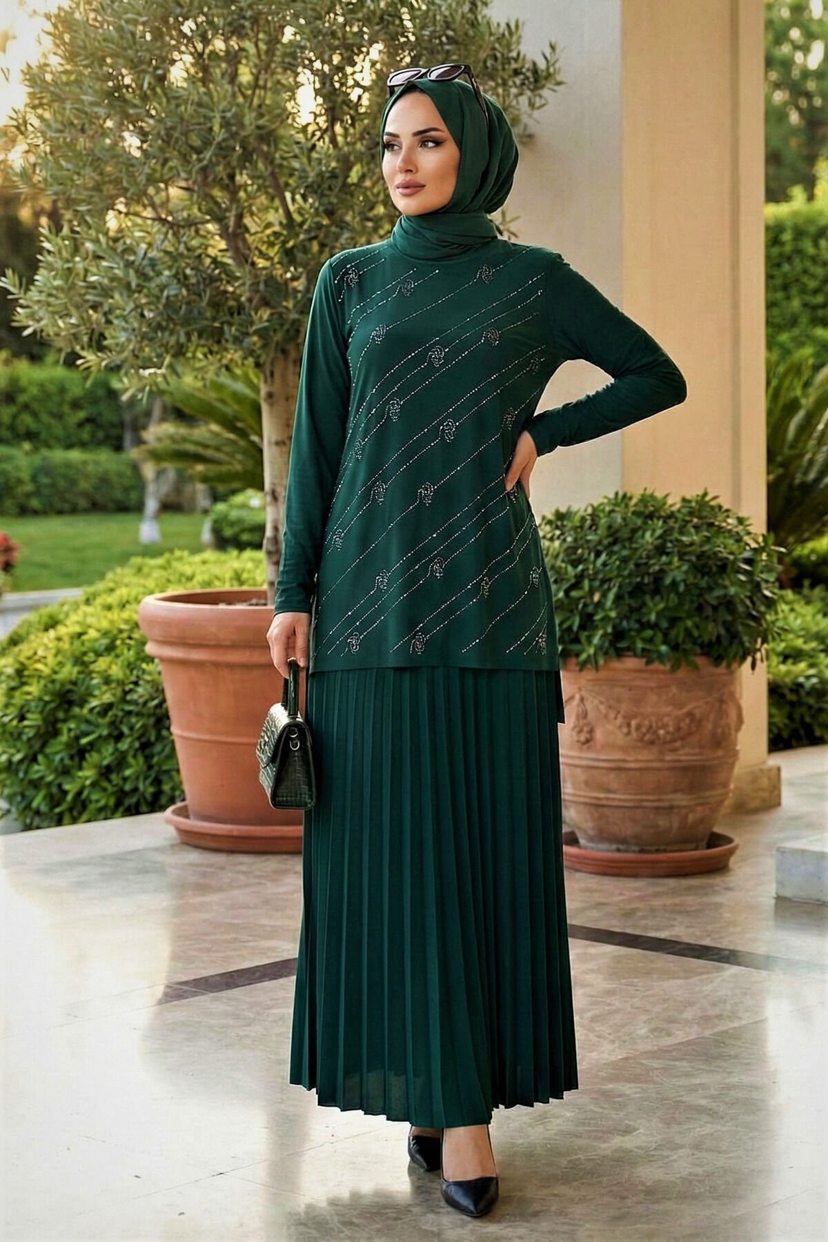 Kadın Sandy Siyah Tarz Özel Davet Bluz Taş Detaylı Eteği Piliseli İkili Tesettür Etekli Takım Zümrüt - 44