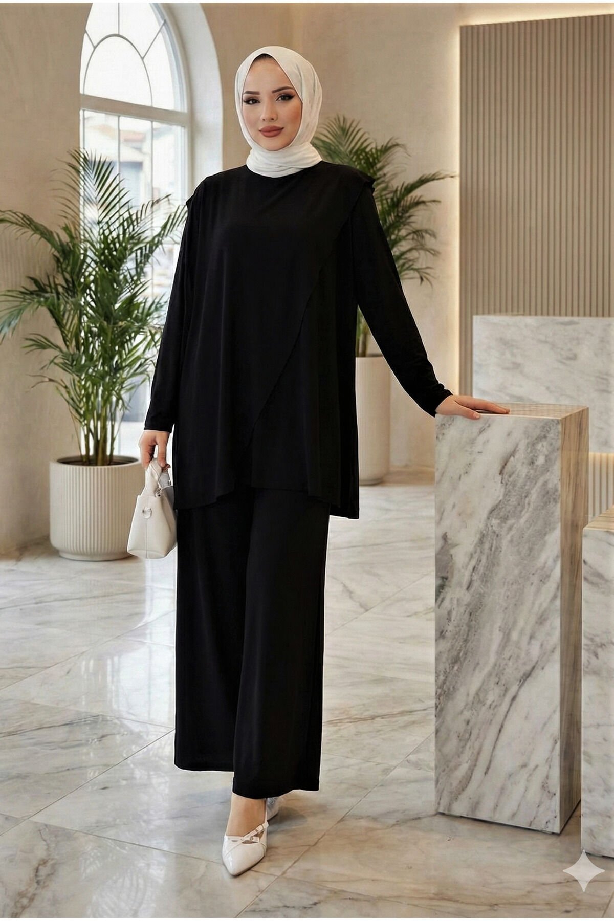 Kadın Sandy Taba Omuzdan Kanatlı Tunik Tarz Davet Tasarım Genç Anne İkili Tesettür Pantolonlu Takım Si̇yah - 48
