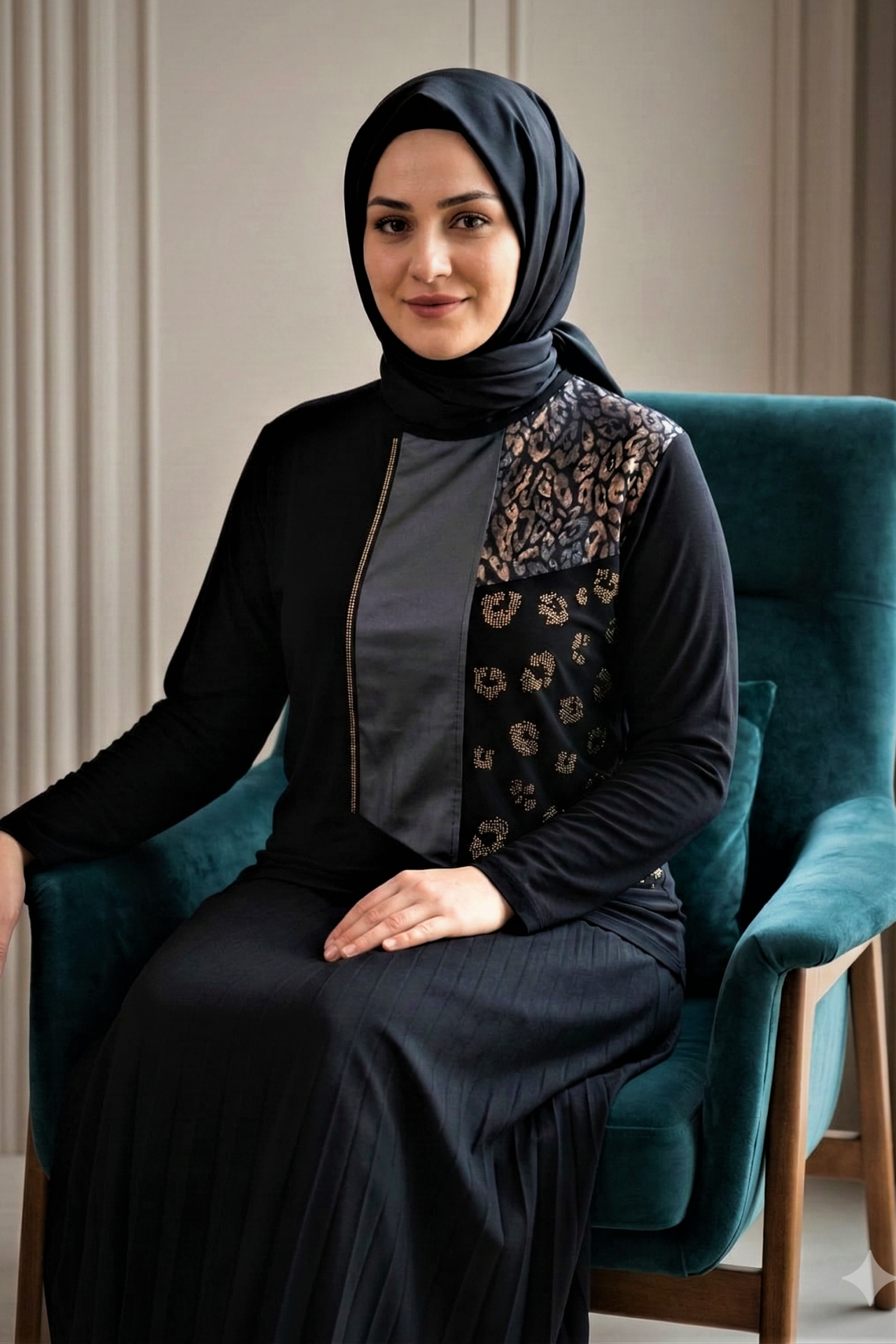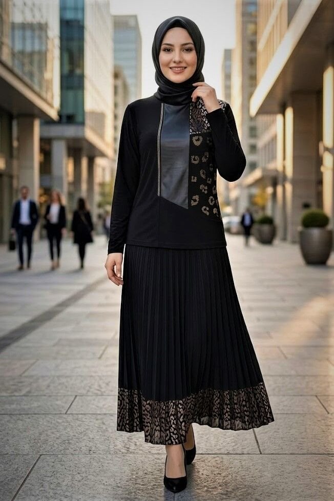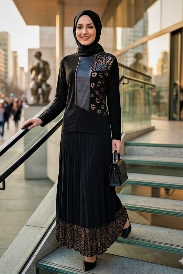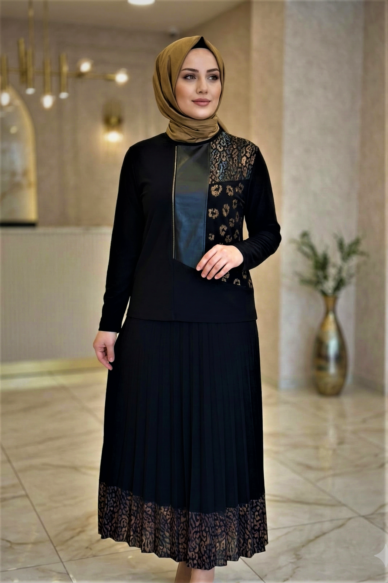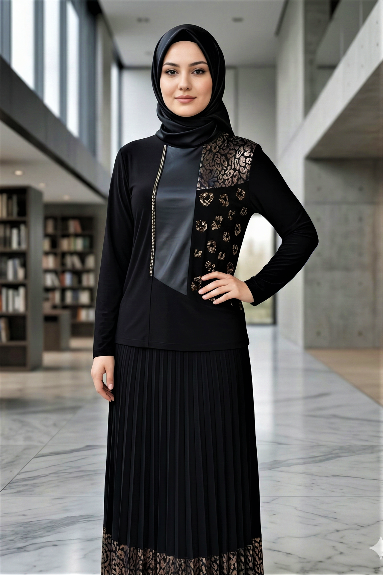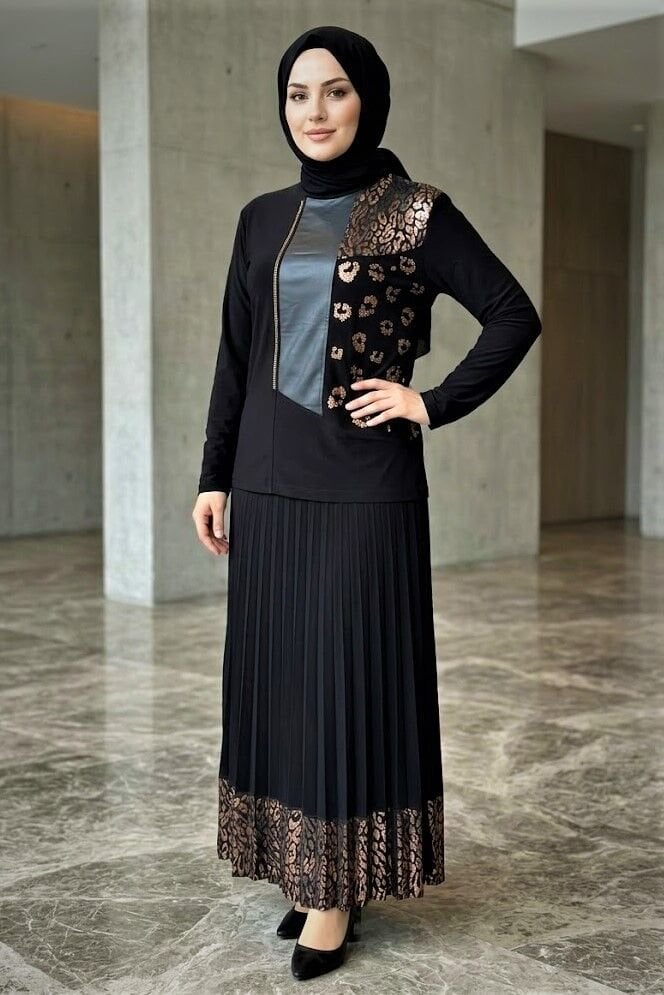KADIN SANDY TAŞ VE DİJİTAL BASKI DETAYLI TARZ ÖZEL TASARIM DAVET ETEĞİ PİLİSELİ TESETTÜR ETEKLİ TAKIM Haki̇ - 52