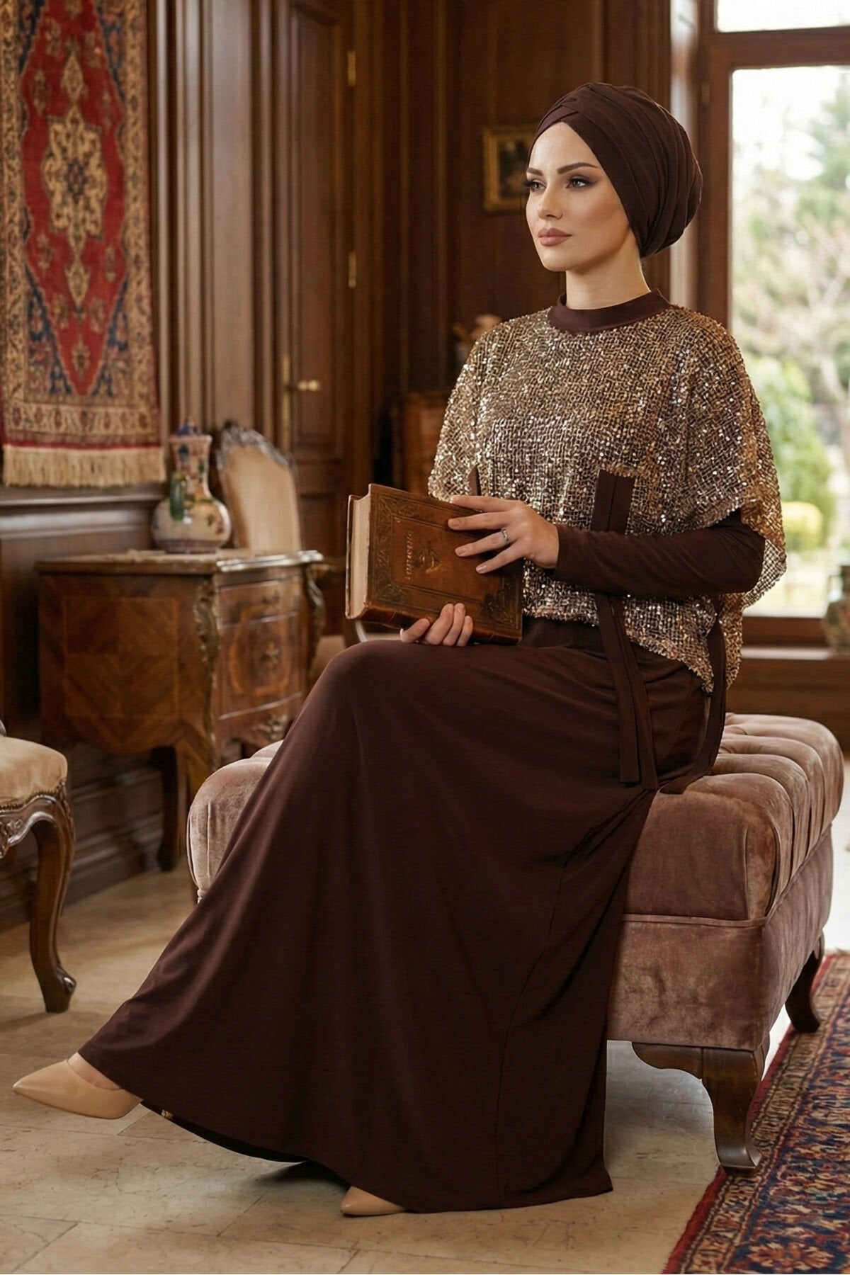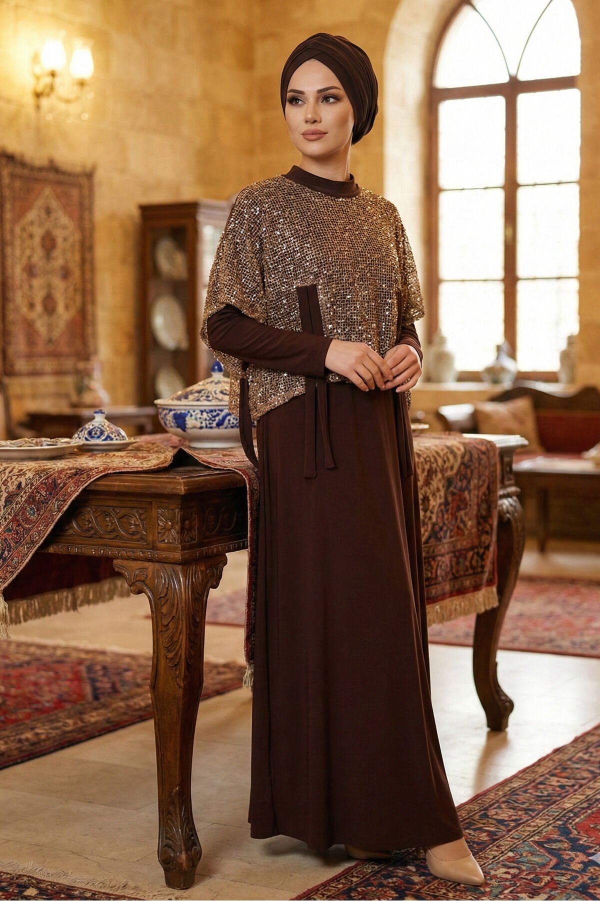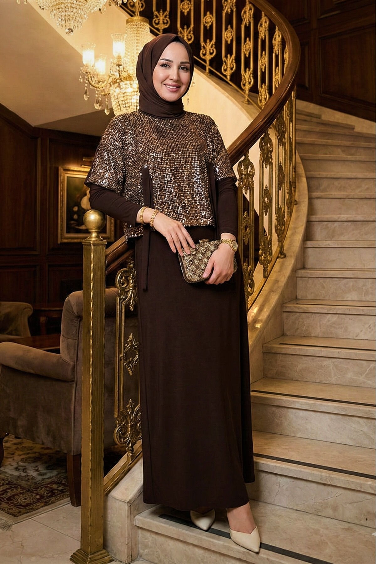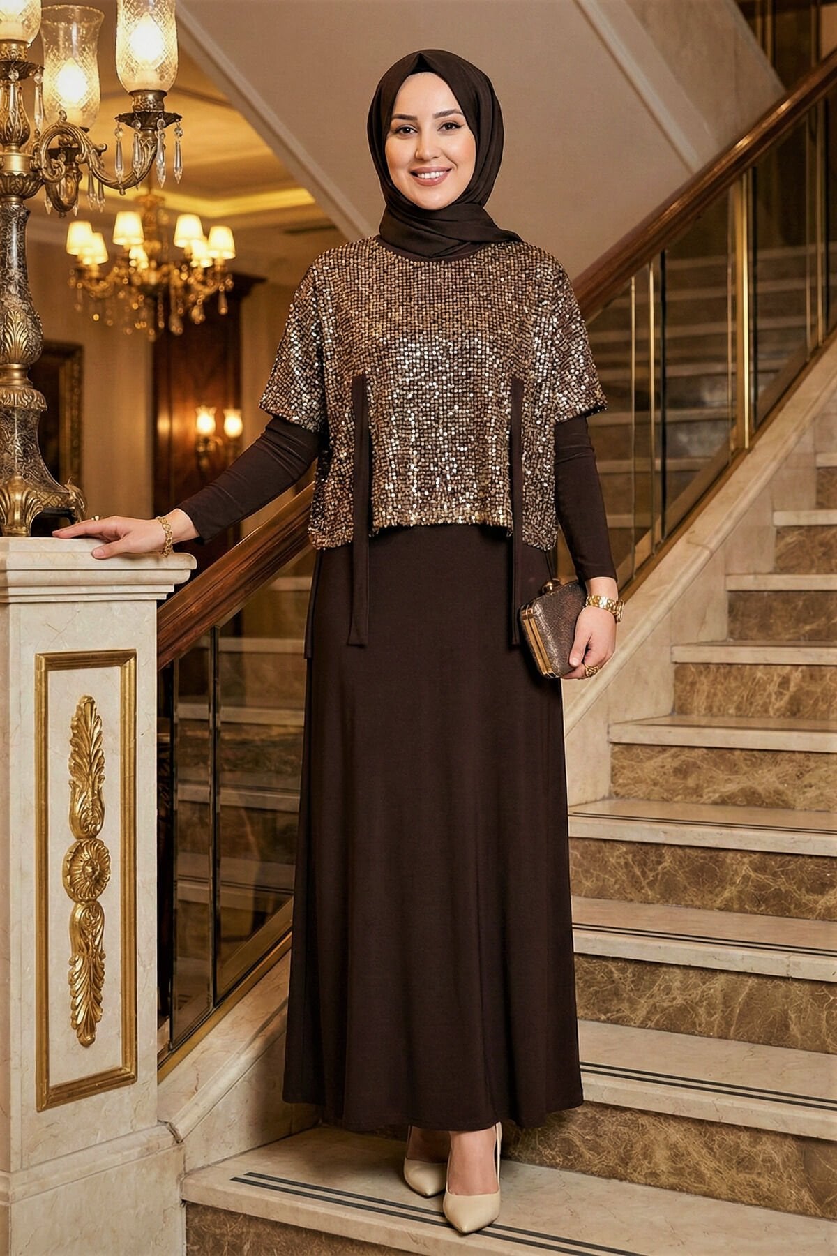 Kadın Sandy Vizon Renk Özel Tasarım Düğün Nişan Tarz Davet İkili Pul File Bolorolu Tesettür Elbise Kahve - 46